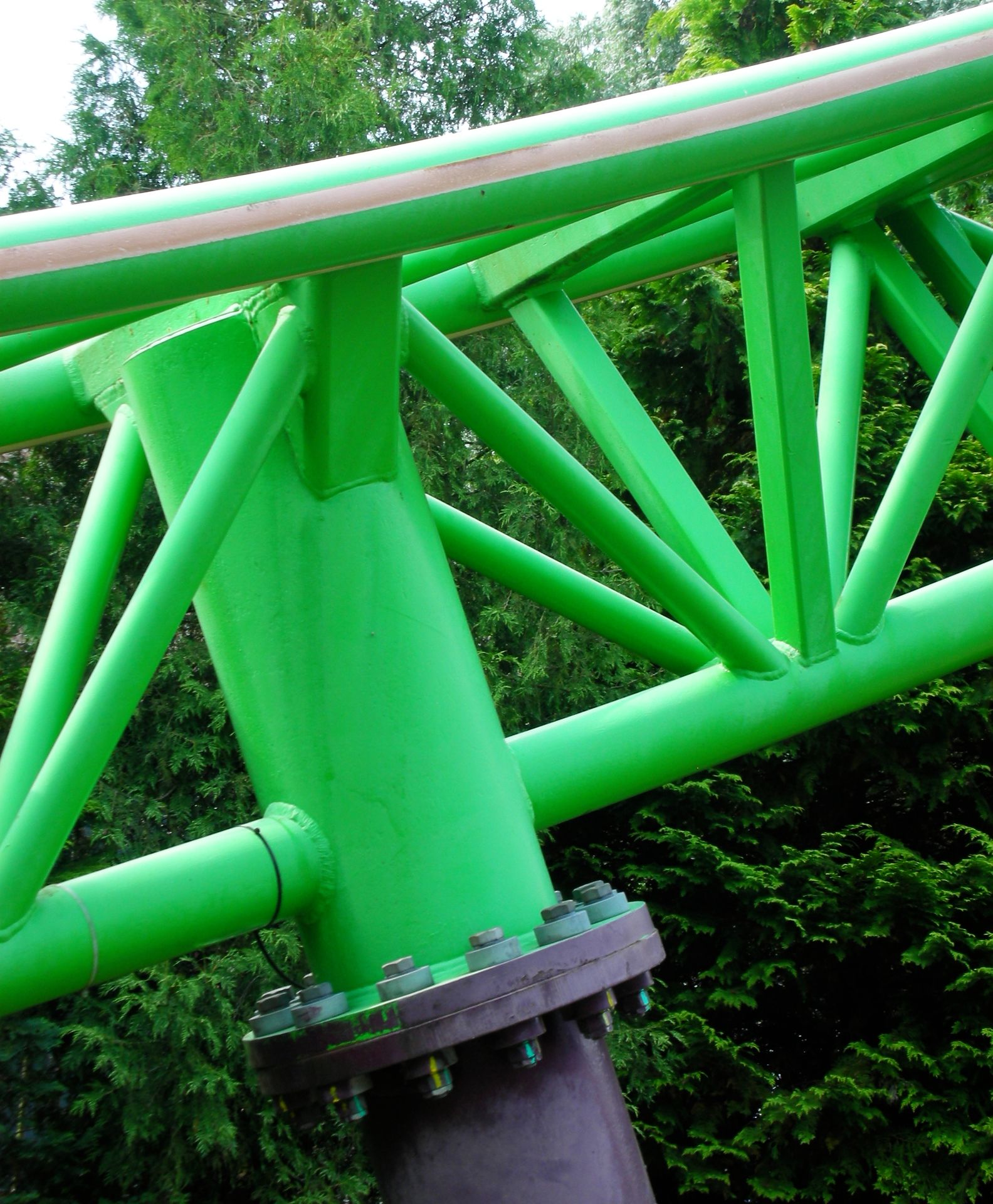 Genug der Hakenjagd, jetzt wird Achterbahn gefahren! Der dank Wegweisern schnell aufzufindende Weg in Richtung Goliath ist leider der einzige, auf dem man zur Hauptattraktion des Parks gelangt, wodurch gerade diese wirkt, als wäre sie nachträglich angefügt worden. Vom Ungetüm, welches noch erhaben über den Parkplatz ragte, erkennt man jetzt nur noch den Lifthill, die letzten beiden Bunny Hops und - wenn man allzu angestrengt in das Gebüsch starrt - sogar die Schlusskurve. In ihren ausgebleichten Farben, vermag Goliath es kaum, sich von all dem umliegenden Grün scharf abzuheben. Hinzu kommt, dass die Bahn wirklich vom Kabellift bis zur Schlussbremse flüsterleise betrieben wird, was uns auf eine enorm hohe Laufruhe hoffen ließ.