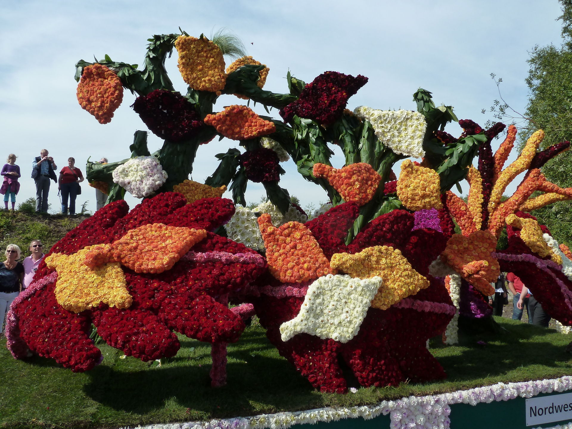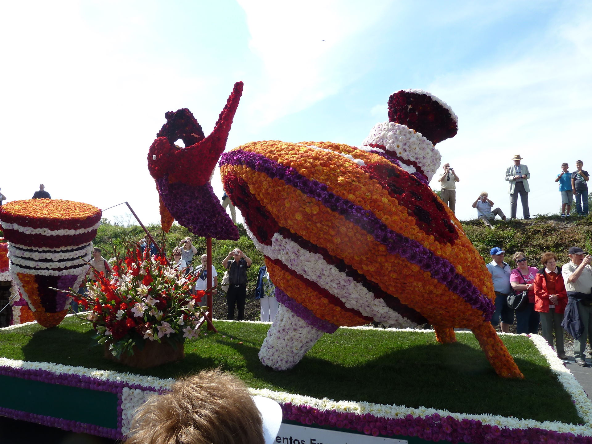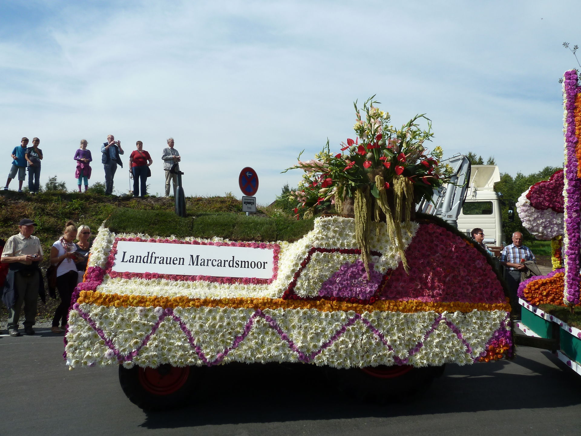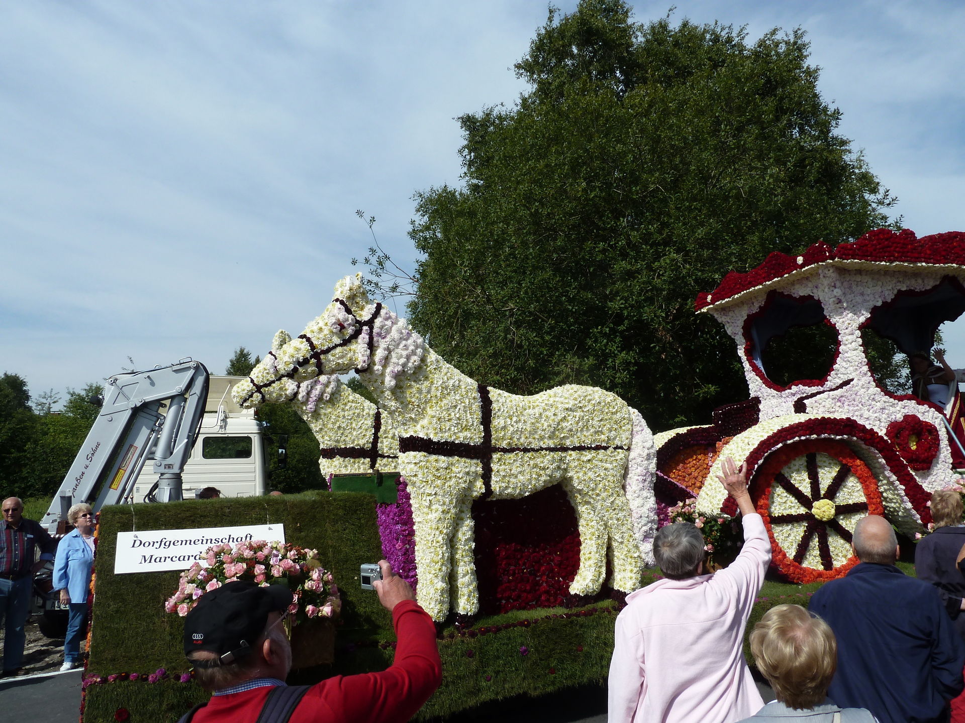 Verschiedene Festwagen sind mit unzähligen Blüten dekoriert.