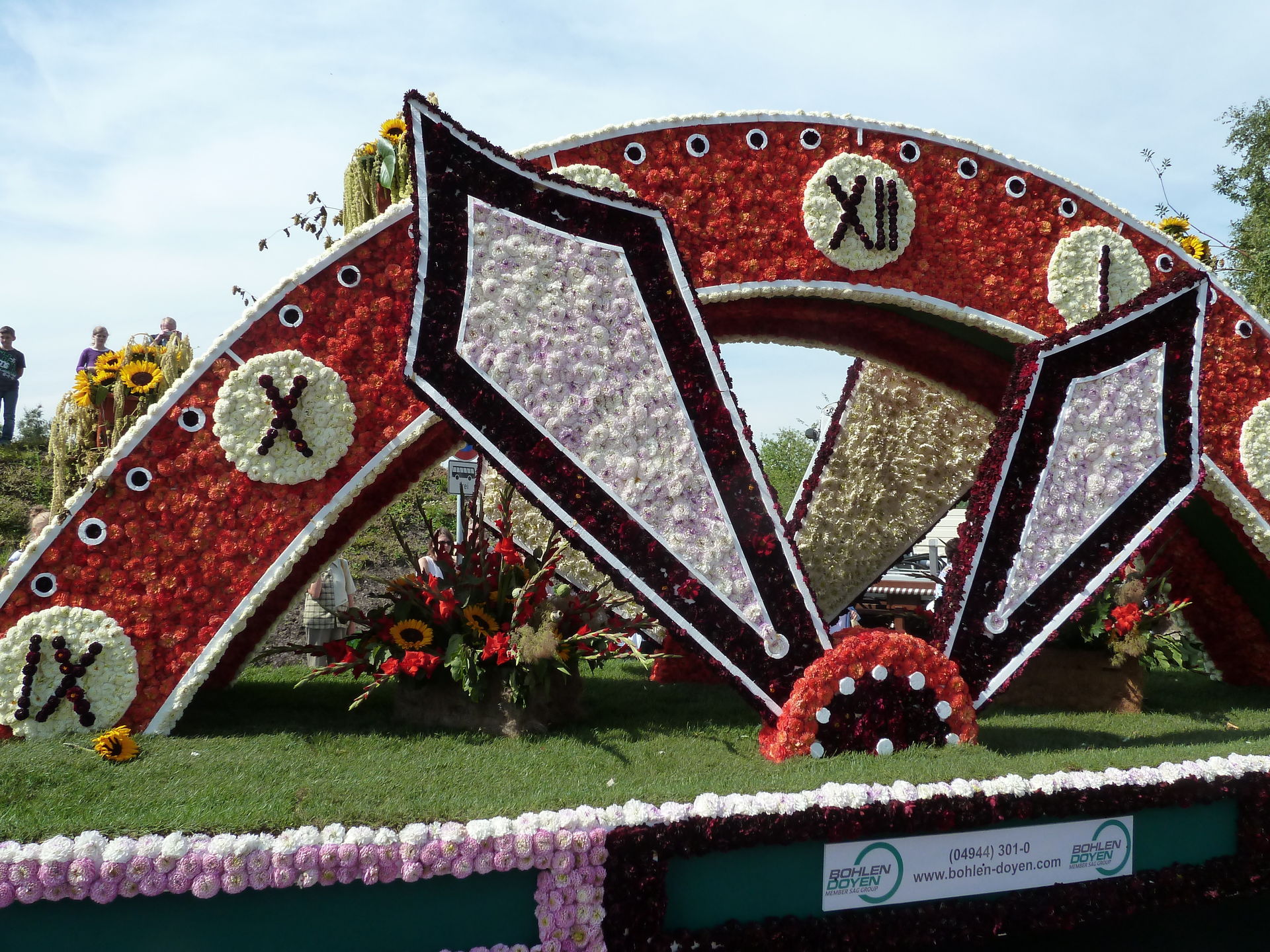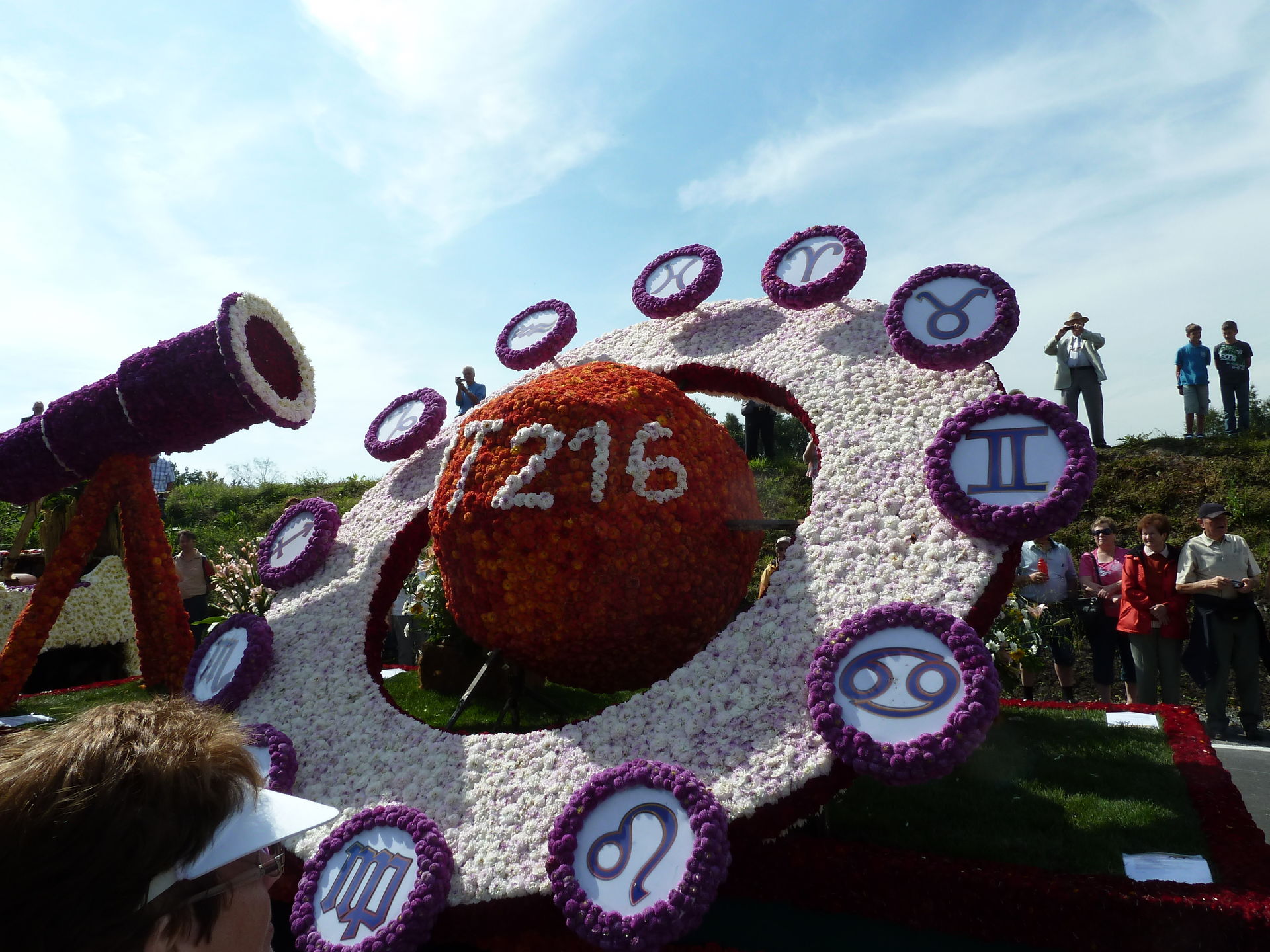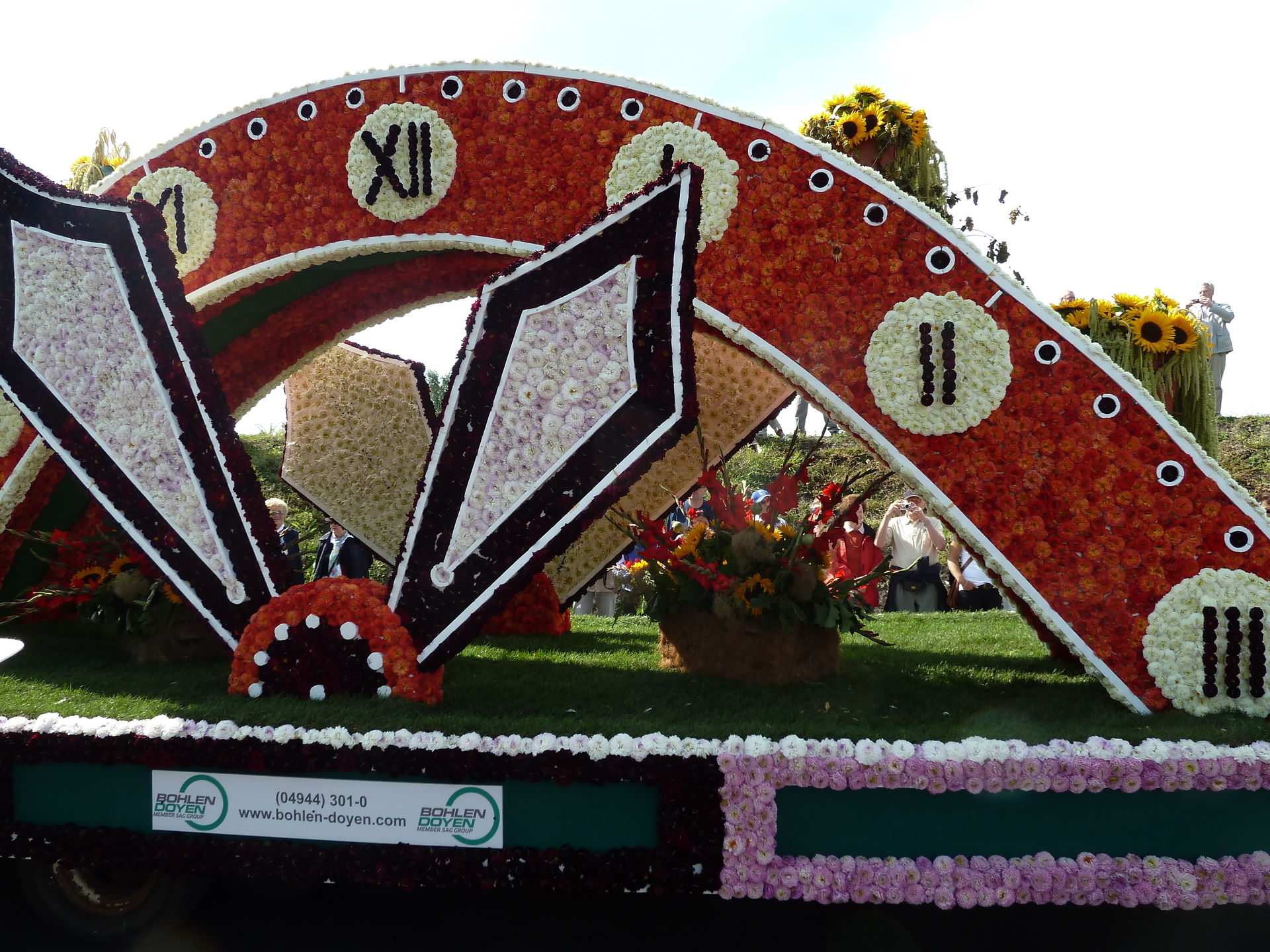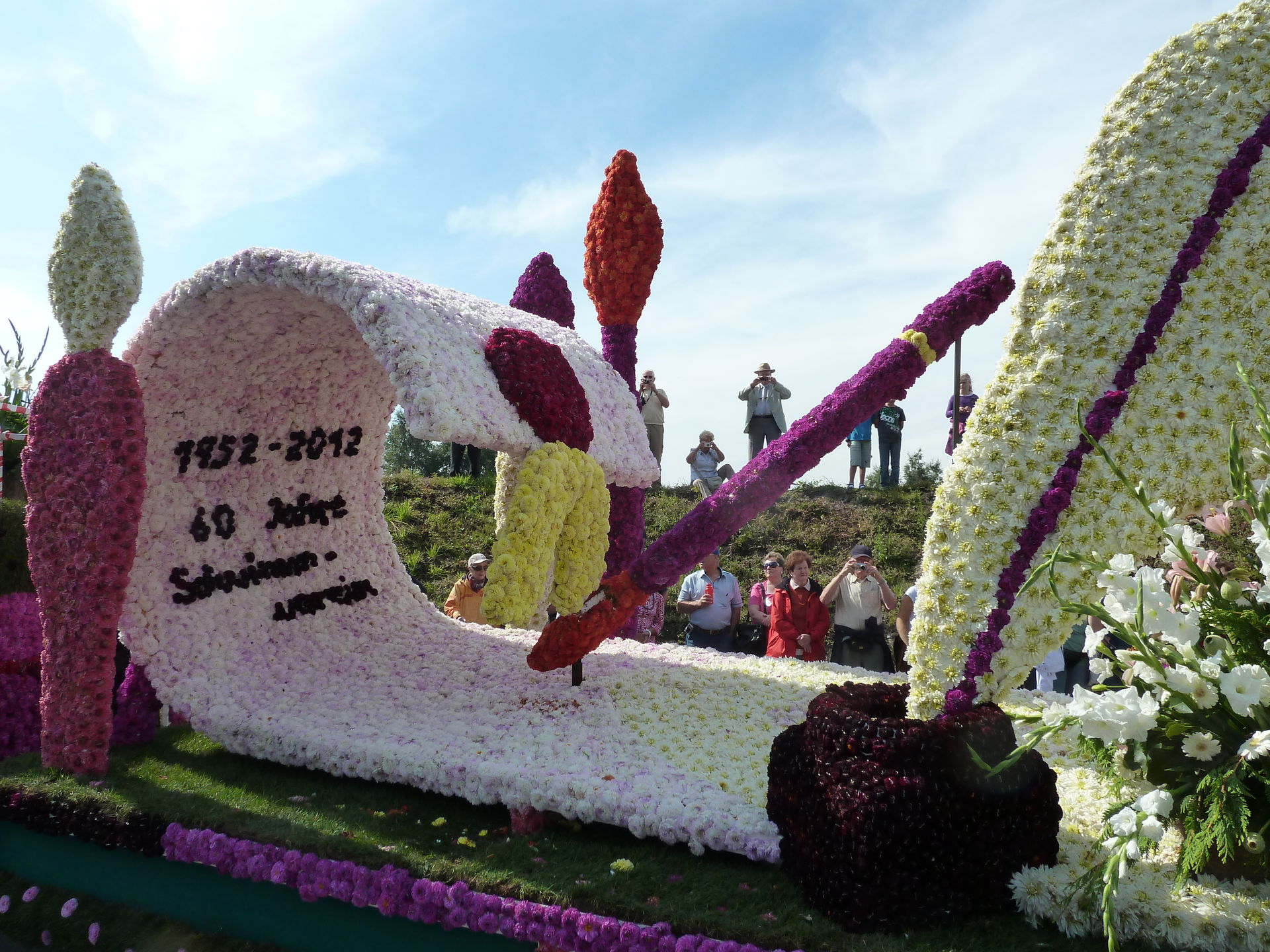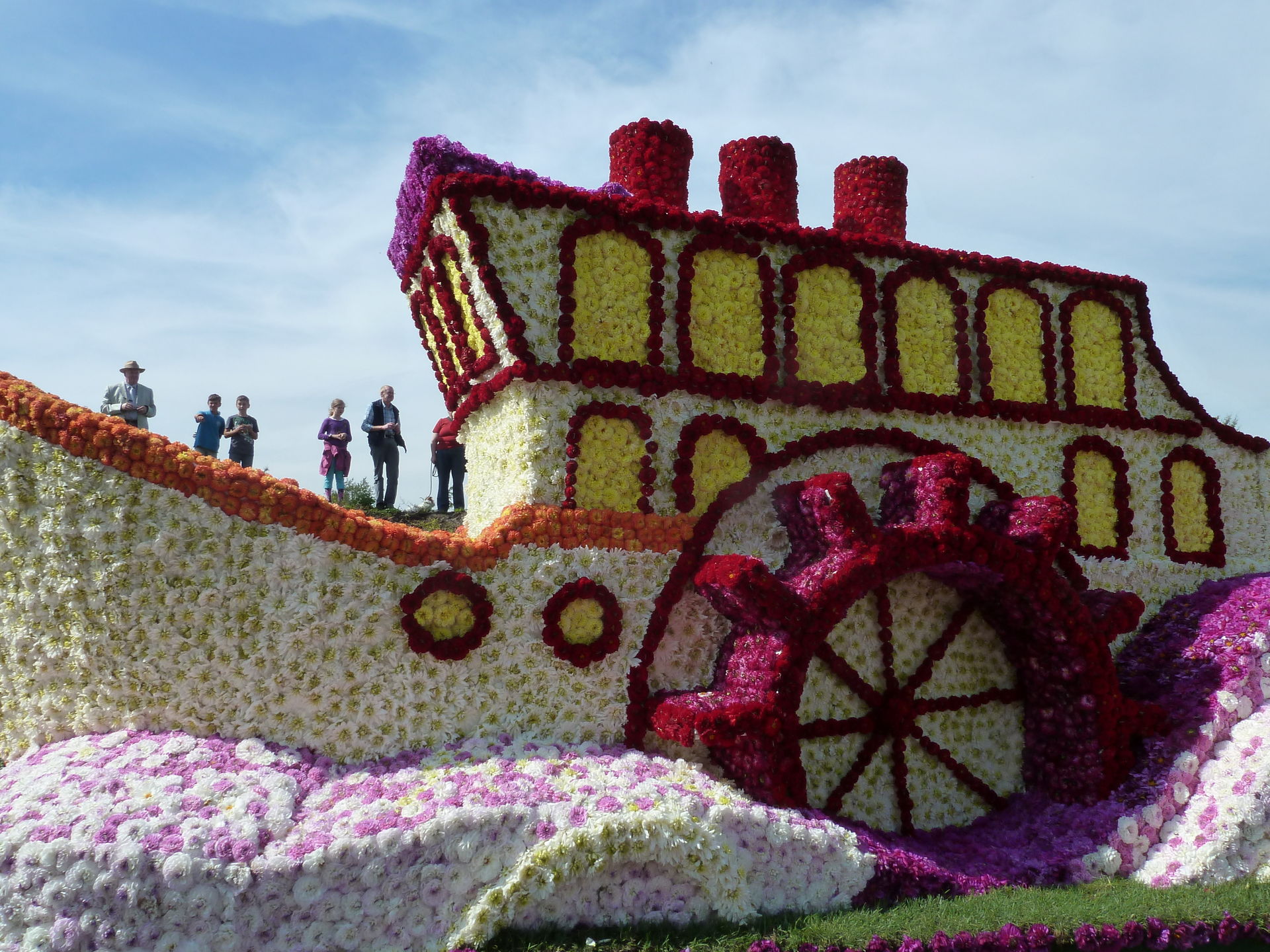Verschiedene Festwagen sind mit unzähligen Blüten dekoriert.