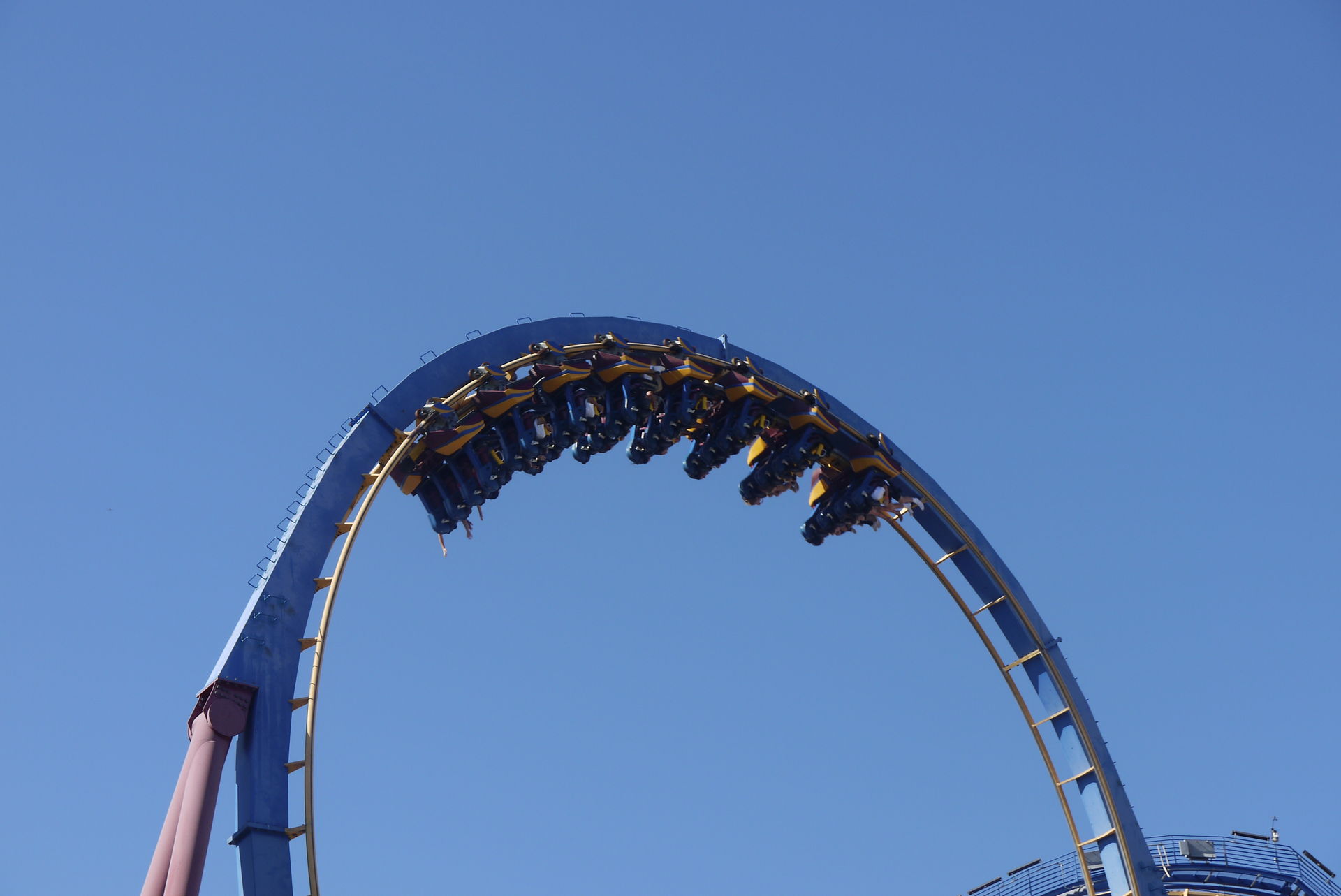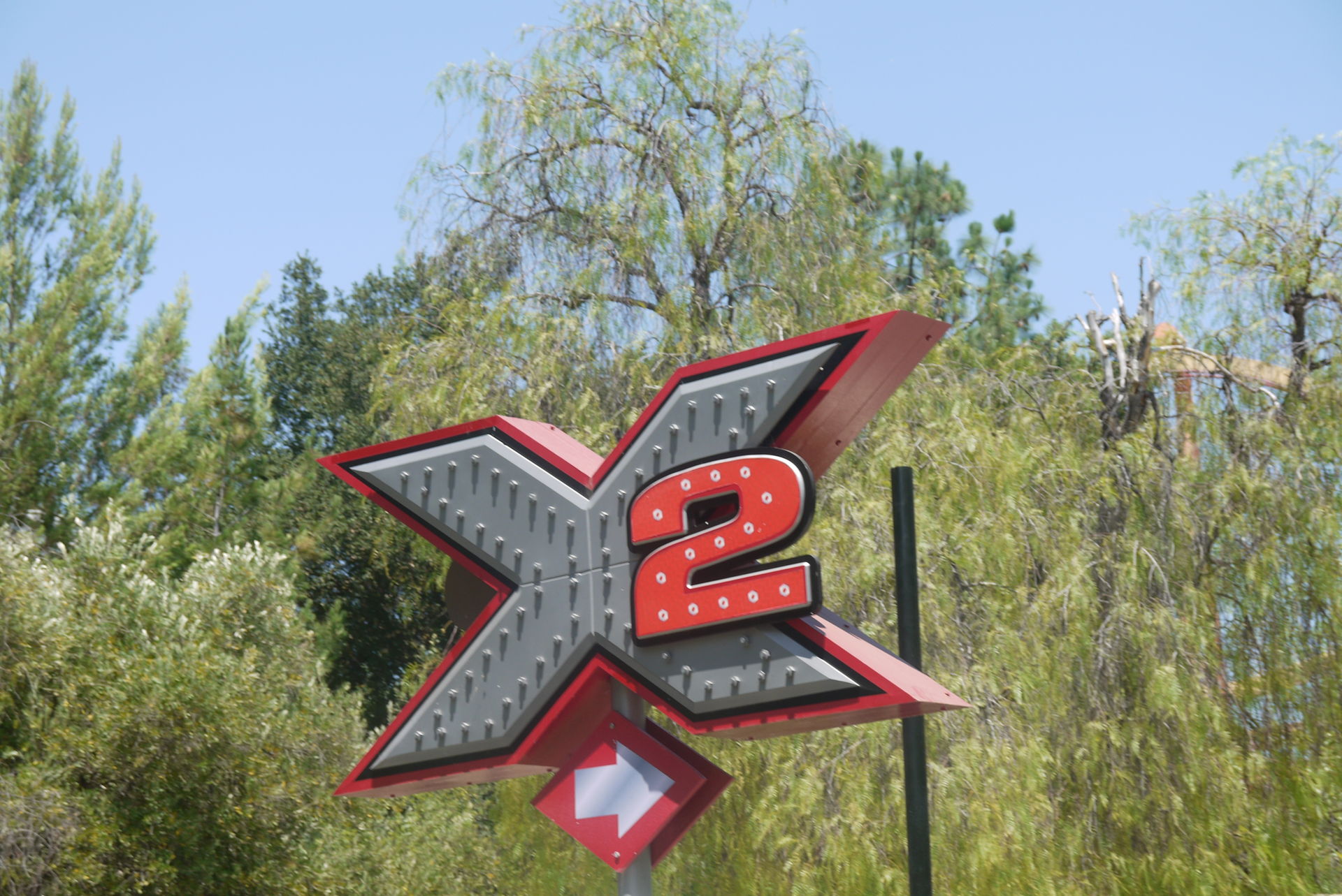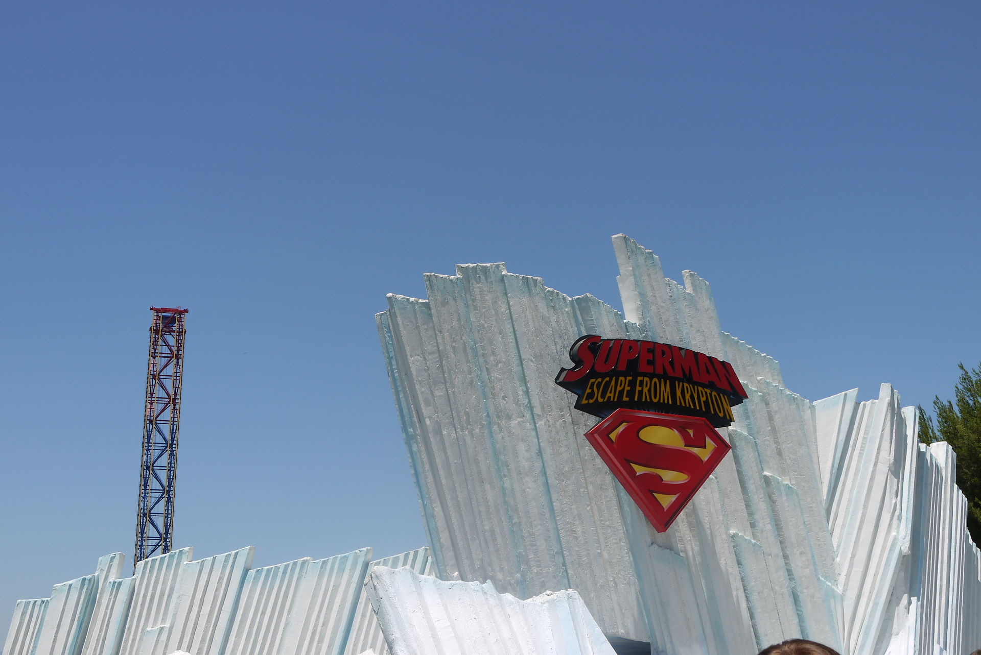 Danach gingen wir endlich zu “X2“, worauf ich mich schon seit Wochen freute. Angekommen wurden wir erst einmal von einem Schild geschockt, welches eine Wartezeit von 90 Minuten voraus sagte. Generell war der Park an diesem Tag etwas voller, leider. Nach nur einer Stunde des Wartens waren wir endlich an der Reihe und konnten in den komischen Sitzen Platz nehmen. Man saß echt etwas merkwürdig, aber es war okay. Dann ging es los. Die Fahrt an sich war sehr gut und durch die Bewegungen der Sitze wurde die Fahrt nochmal ganz anders, als man es sonst kennt. Ab und zu fand ich die Sitzbewegung etwas unsanft. Die Fahrt war aber trotzdem ein Erlebnis. Das nicht ganz so schöne Onride Foto wurde auch gleich einmal für meine Collection gekauft. Glücklich und zufrieden ging es dann zu “Superman: Escape from Krypton“ Dort fuhr aus irgendwelchen Gründen nur eine Bahn und die Wartezeit betrug deswegen auch stolze 40 Minuten. 40 Minuten für nicht einmal 30 Sekunden Fahrt. Einen Rückwärtslaunch hatte ich auch noch nie. Nachdem der Launch nicht aufhören zu schien ging es schlagartig senkrecht nach oben und dann wieder nach unten. Während der Fahrt ist es mir nicht so aufgefallen, aber die Bahn war übermäßig laut und hörte sich nach einem Düsenjet an.