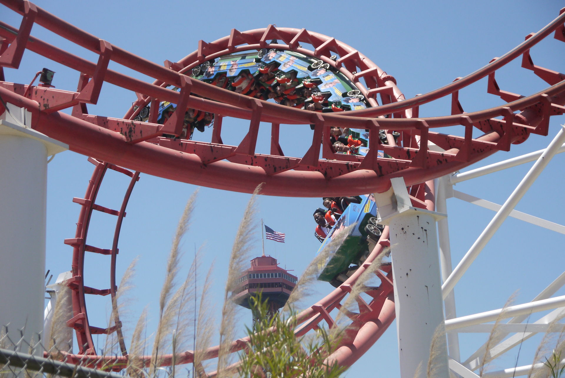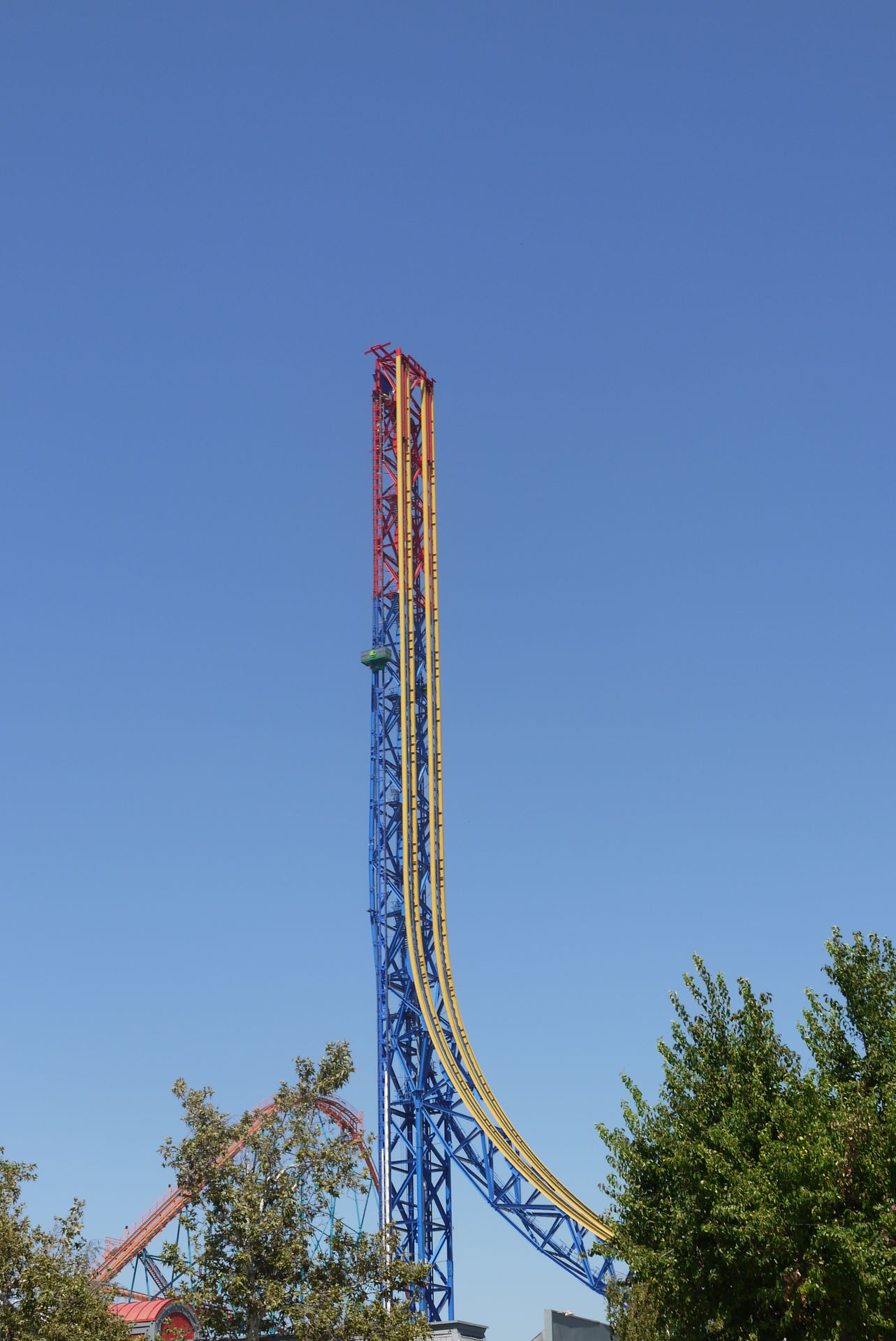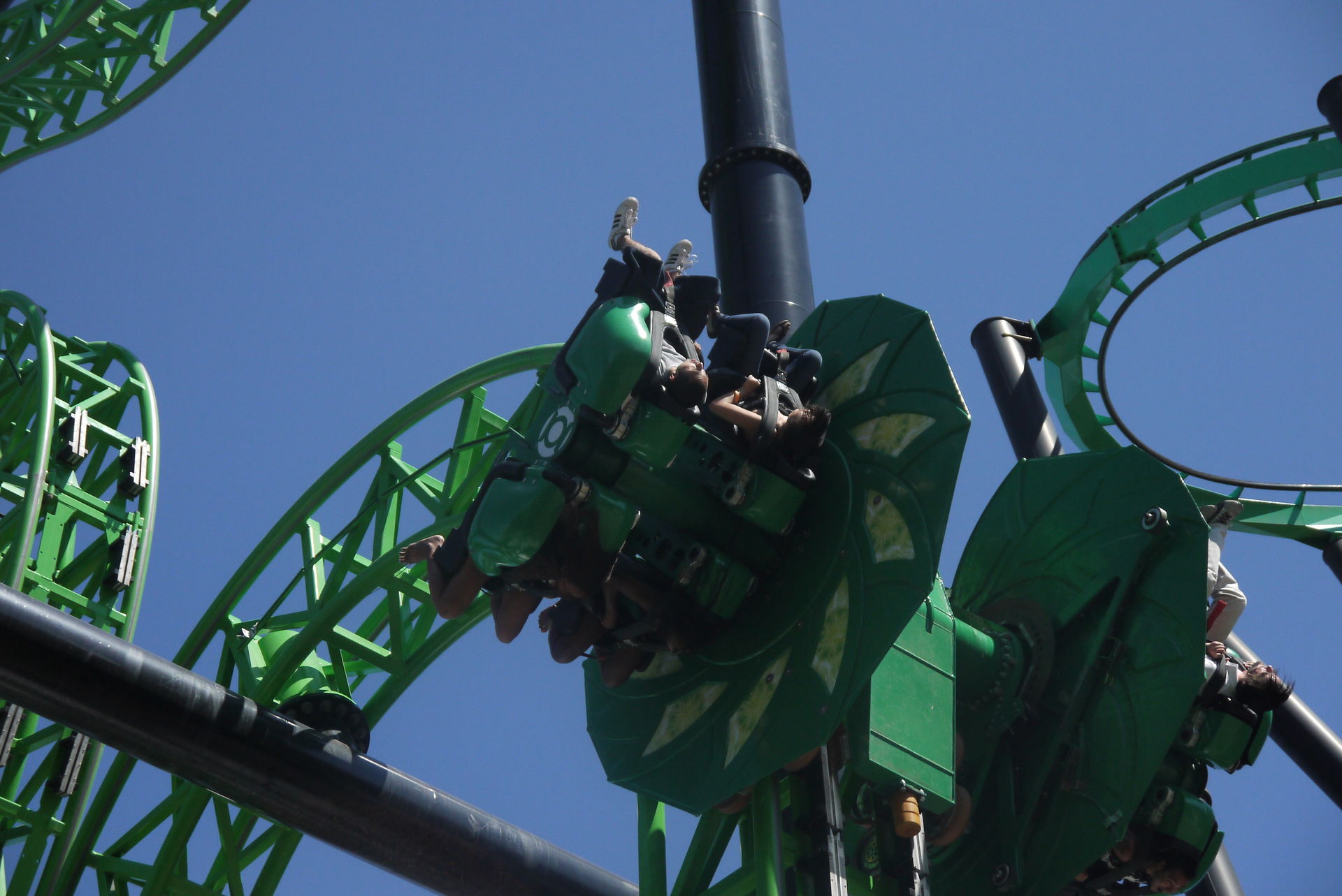 Danach gingen wir endlich zu “X2“, worauf ich mich schon seit Wochen freute. Angekommen wurden wir erst einmal von einem Schild geschockt, welches eine Wartezeit von 90 Minuten voraus sagte. Generell war der Park an diesem Tag etwas voller, leider. Nach nur einer Stunde des Wartens waren wir endlich an der Reihe und konnten in den komischen Sitzen Platz nehmen. Man saß echt etwas merkwürdig, aber es war okay. Dann ging es los. Die Fahrt an sich war sehr gut und durch die Bewegungen der Sitze wurde die Fahrt nochmal ganz anders, als man es sonst kennt. Ab und zu fand ich die Sitzbewegung etwas unsanft. Die Fahrt war aber trotzdem ein Erlebnis. Das nicht ganz so schöne Onride Foto wurde auch gleich einmal für meine Collection gekauft. Glücklich und zufrieden ging es dann zu “Superman: Escape from Krypton“ Dort fuhr aus irgendwelchen Gründen nur eine Bahn und die Wartezeit betrug deswegen auch stolze 40 Minuten. 40 Minuten für nicht einmal 30 Sekunden Fahrt. Einen Rückwärtslaunch hatte ich auch noch nie. Nachdem der Launch nicht aufhören zu schien ging es schlagartig senkrecht nach oben und dann wieder nach unten. Während der Fahrt ist es mir nicht so aufgefallen, aber die Bahn war übermäßig laut und hörte sich nach einem Düsenjet an.