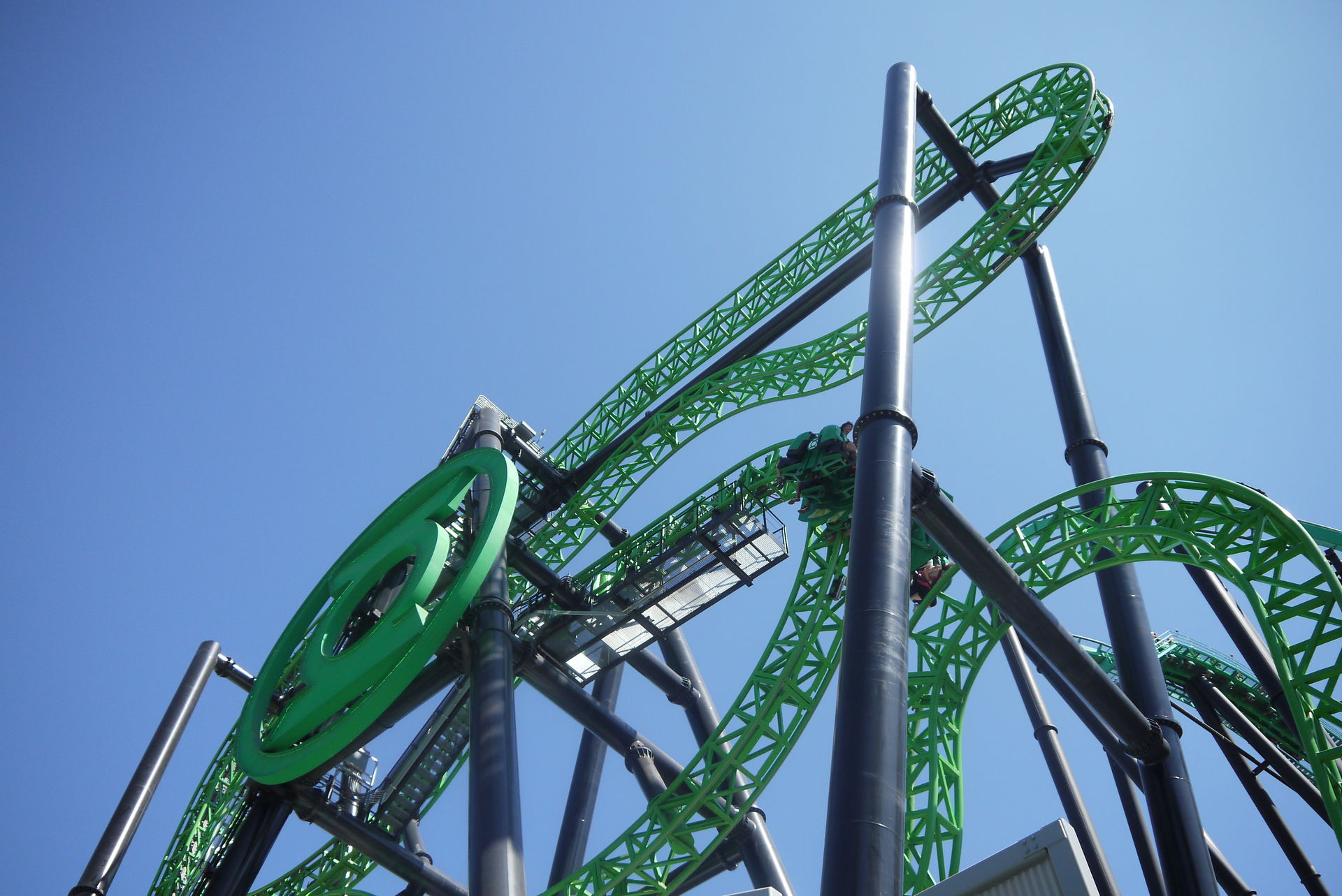 Spinning Coaster „Green Lantern“. Nach einigen “Delays“ waren wir nach knapp 50 Minuten endlich dran. Die Sitze sind nichts für kleine Leute. Ich mit meinen 164cm musste regelrecht in den Sitz klettern, um Platz zu nehmen. Sicher im Sitz ging es los. Da ich noch nie in einem