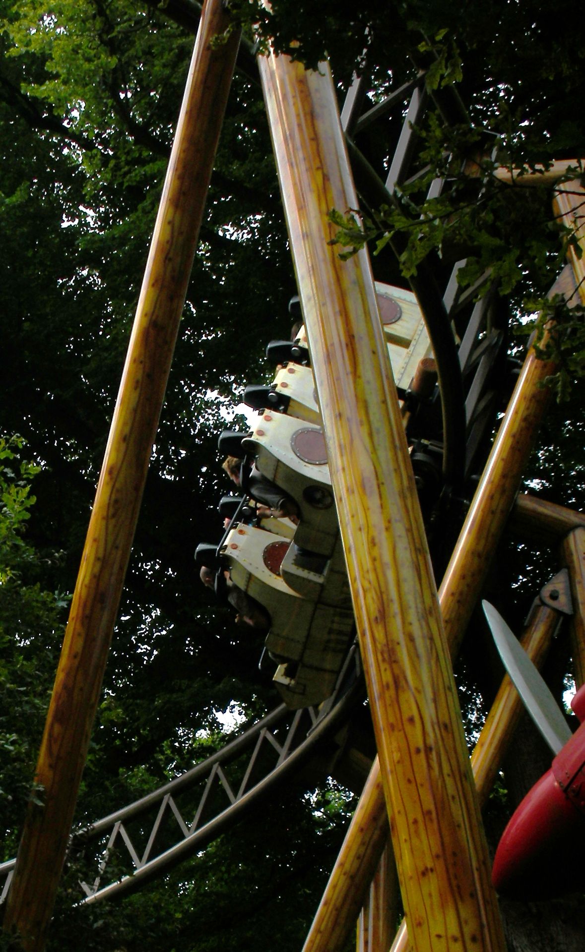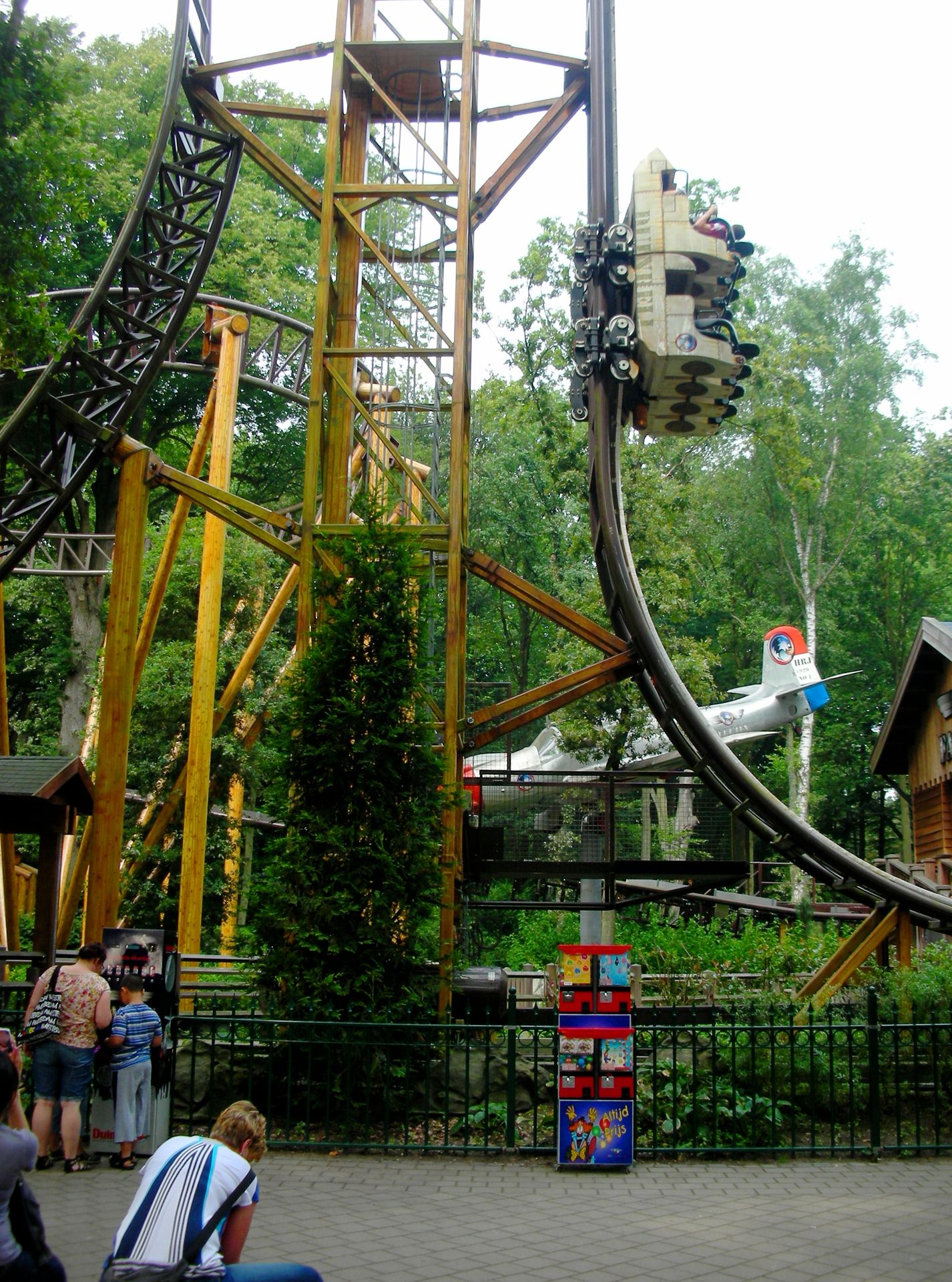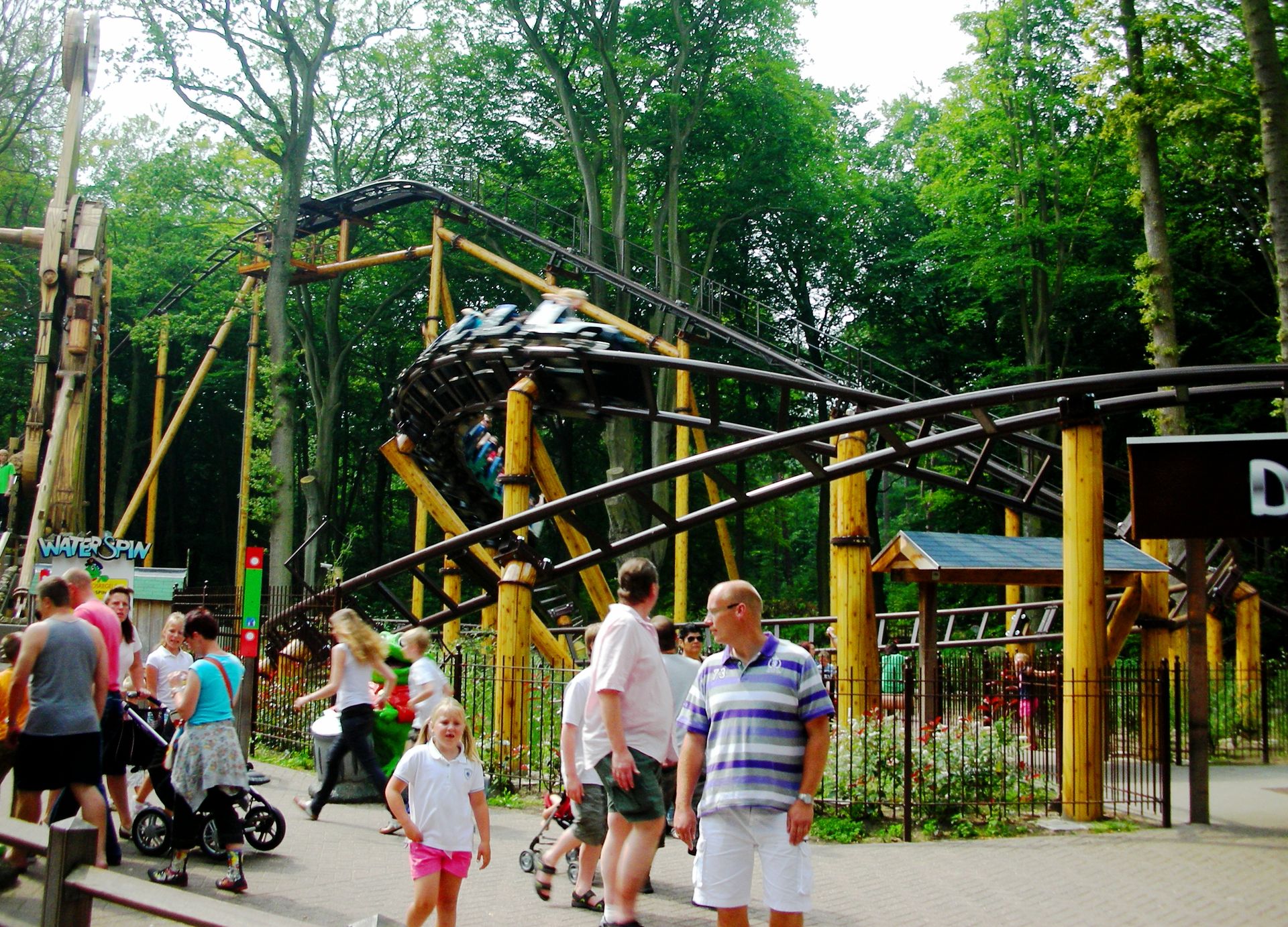 Zierer, von der aus wir uns zum deutlich knackigeren Eurofighter hocharbeiten wollten. Doch auf unserem Weg zwischen mannshohen Hecken hindurch konnten wir weit und breit nichts erblicken, was auf einen Freizeitpark hingedeutet hätte. Wir folgten unserer Nase bis zu einem schwebenden Wasserhahn mit der Aufschrift "Duinrell", der uns zumindest die Furcht nahm, von organisierten Verbrechern um den Eintrittspreis ausgenommen worden zu sein. Kaum eine Minute darauf passierten wir auch das Tikibad und gelangten nach einem weiteren Fußmarsch endlich zu einem Duinrell, wie wir es uns erhofft hatten: viel Wald, drei Coaster, ein bisschen Huss und ein Waterride - alles nahezu aufeinander gestapelt und wegen all der Bäume nicht einmal auf der kurzen Distanz von 100m komplett einzusehen. Duinrell ist anders.
