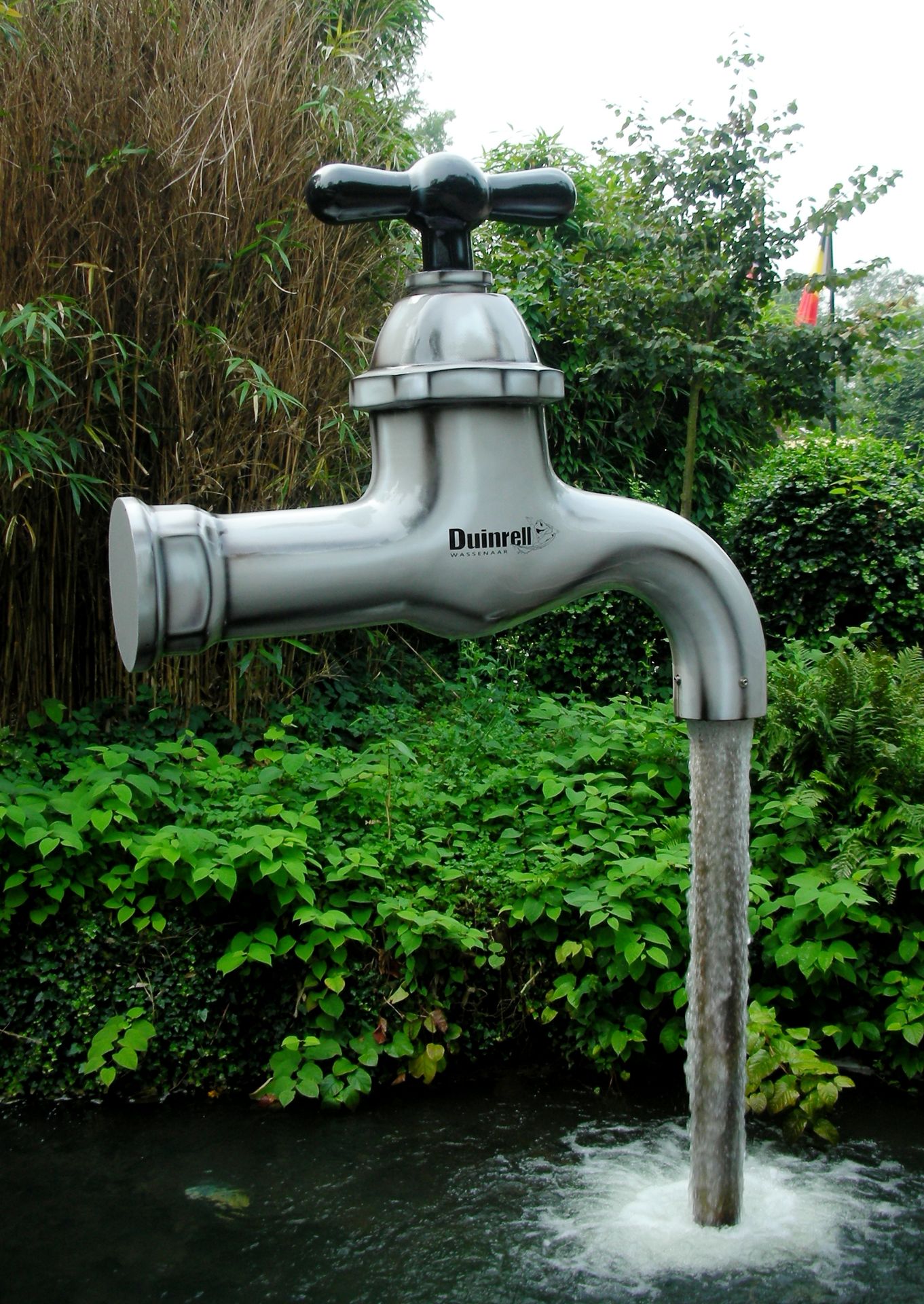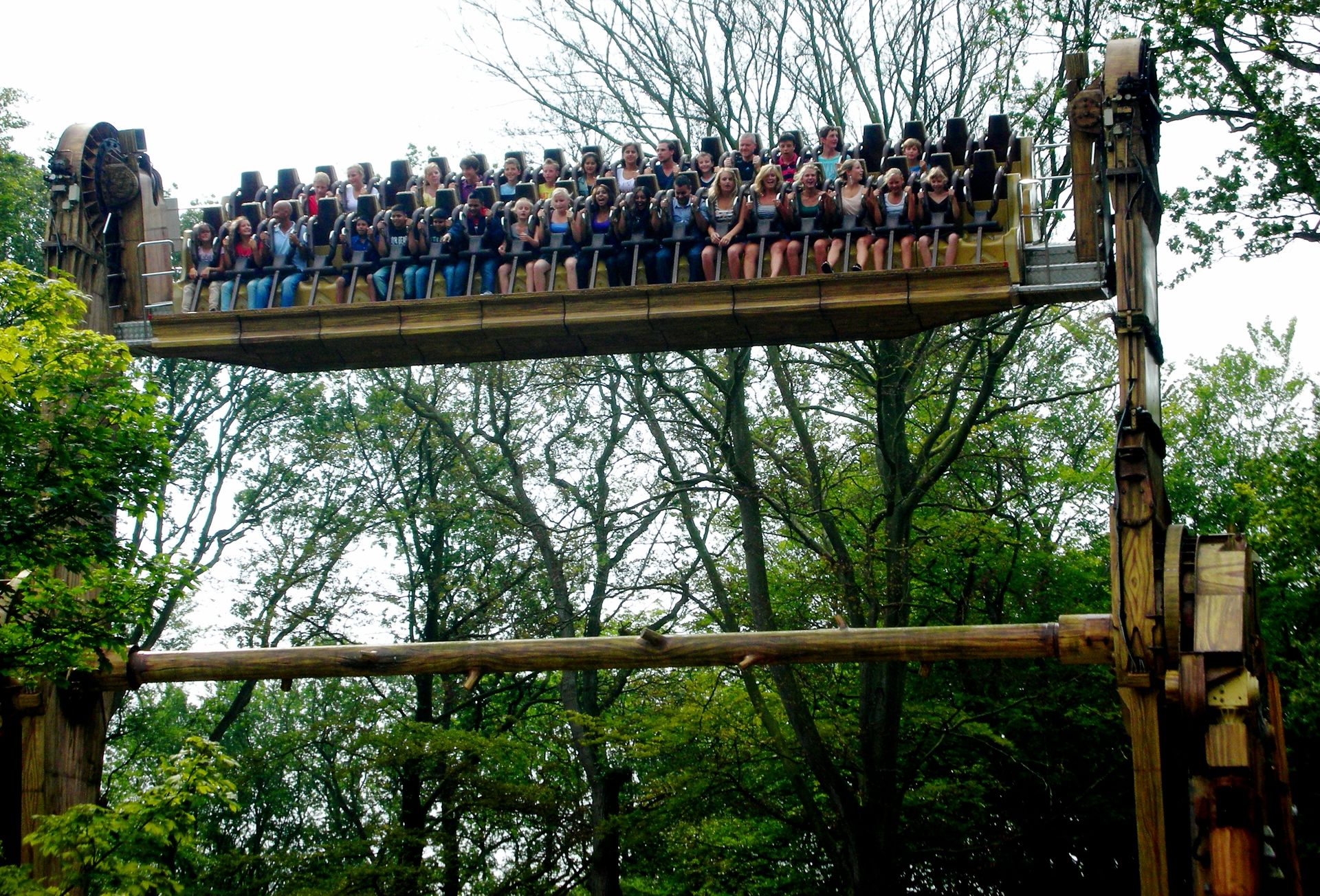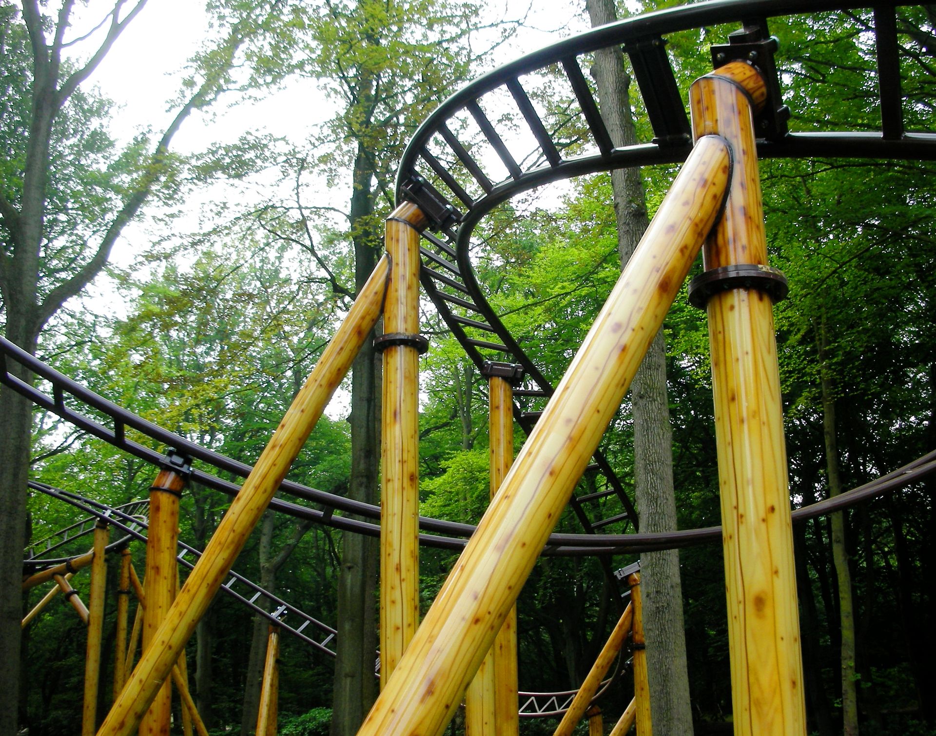 Zierer, von der aus wir uns zum deutlich knackigeren Eurofighter hocharbeiten wollten. Doch auf unserem Weg zwischen mannshohen Hecken hindurch konnten wir weit und breit nichts erblicken, was auf einen Freizeitpark hingedeutet hätte. Wir folgten unserer Nase bis zu einem schwebenden Wasserhahn mit der Aufschrift "Duinrell", der uns zumindest die Furcht nahm, von organisierten Verbrechern um den Eintrittspreis ausgenommen worden zu sein. Kaum eine Minute darauf passierten wir auch das Tikibad und gelangten nach einem weiteren Fußmarsch endlich zu einem Duinrell, wie wir es uns erhofft hatten: viel Wald, drei Coaster, ein bisschen Huss und ein Waterride - alles nahezu aufeinander gestapelt und wegen all der Bäume nicht einmal auf der kurzen Distanz von 100m komplett einzusehen. Duinrell ist anders.