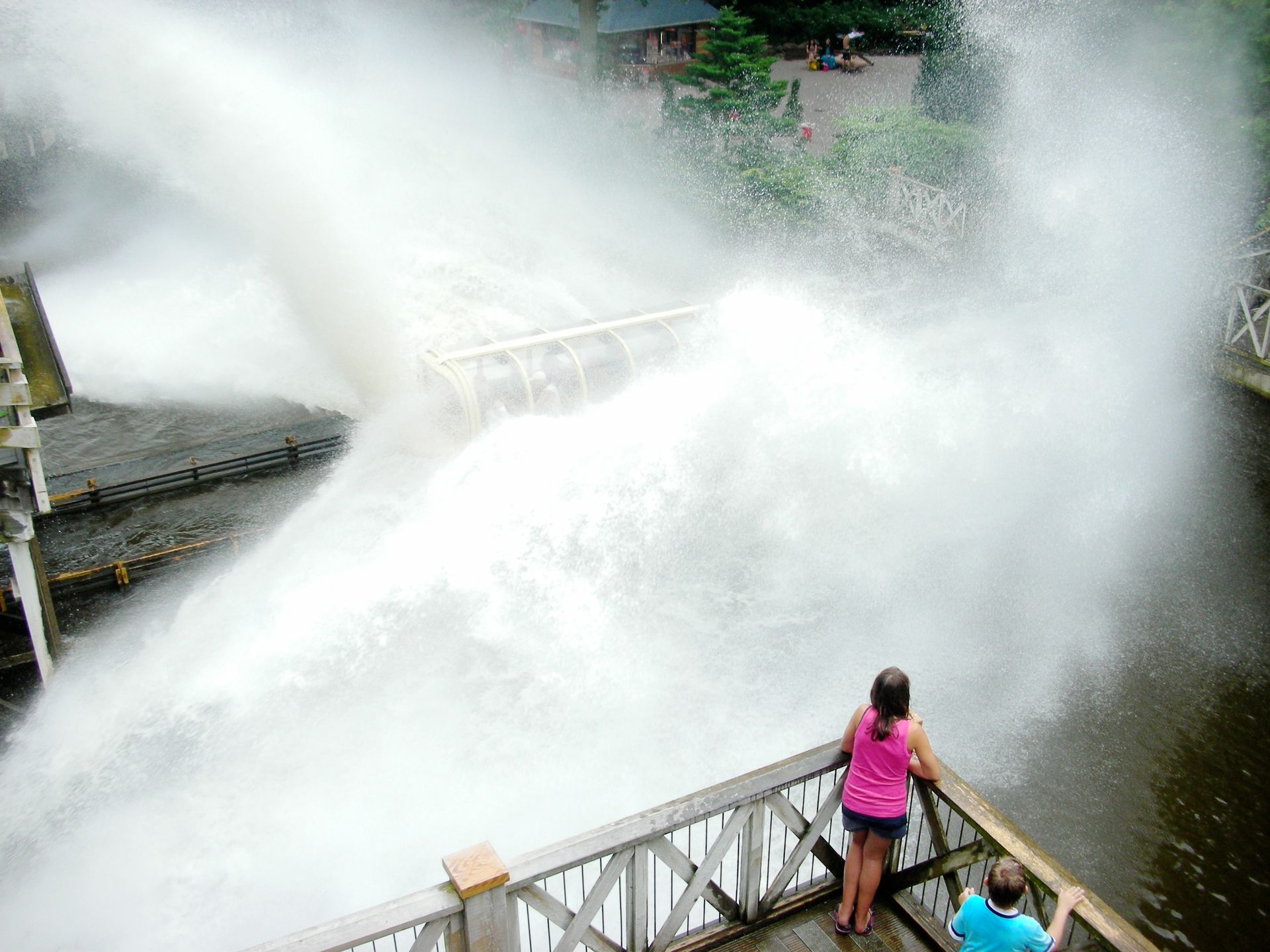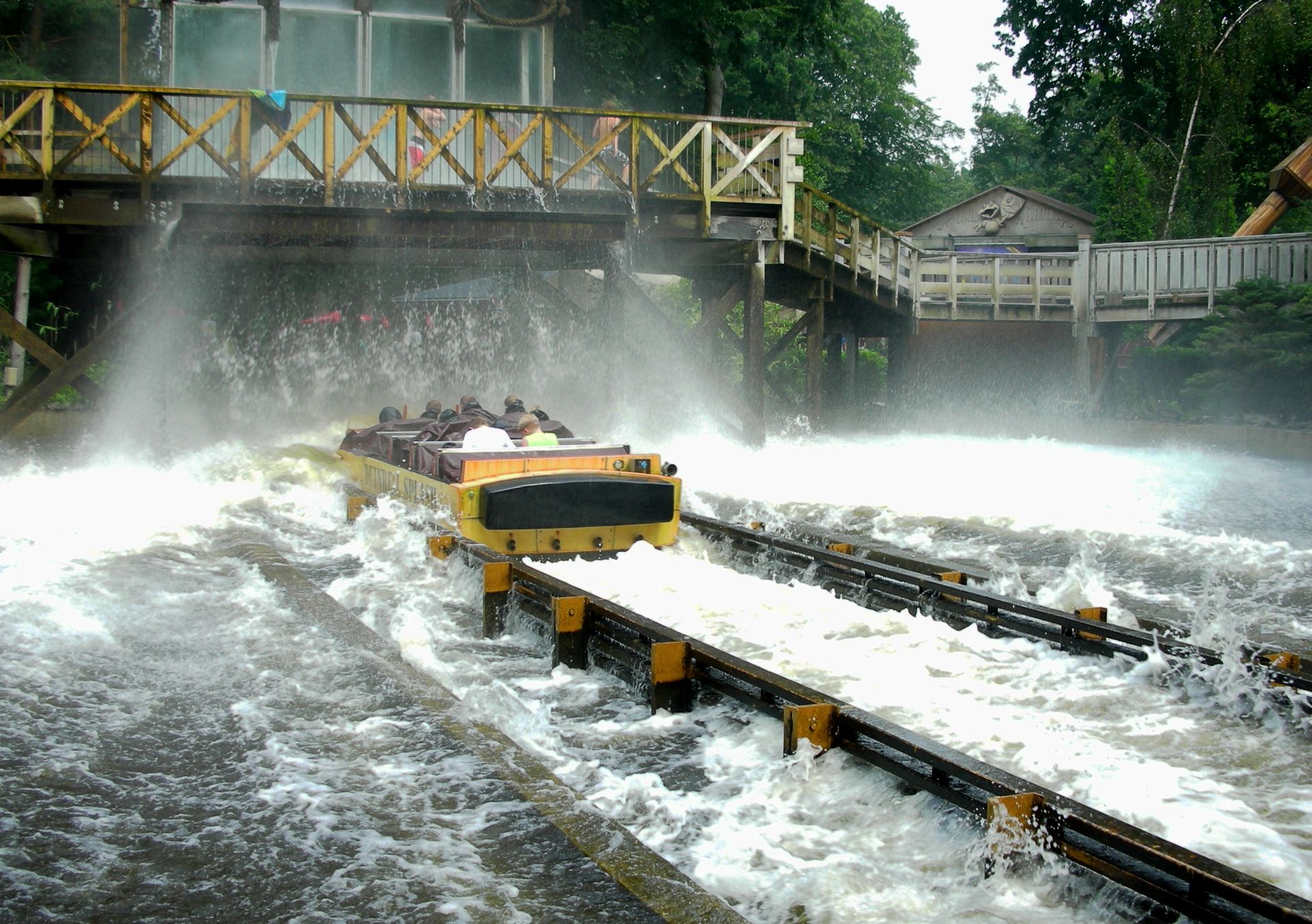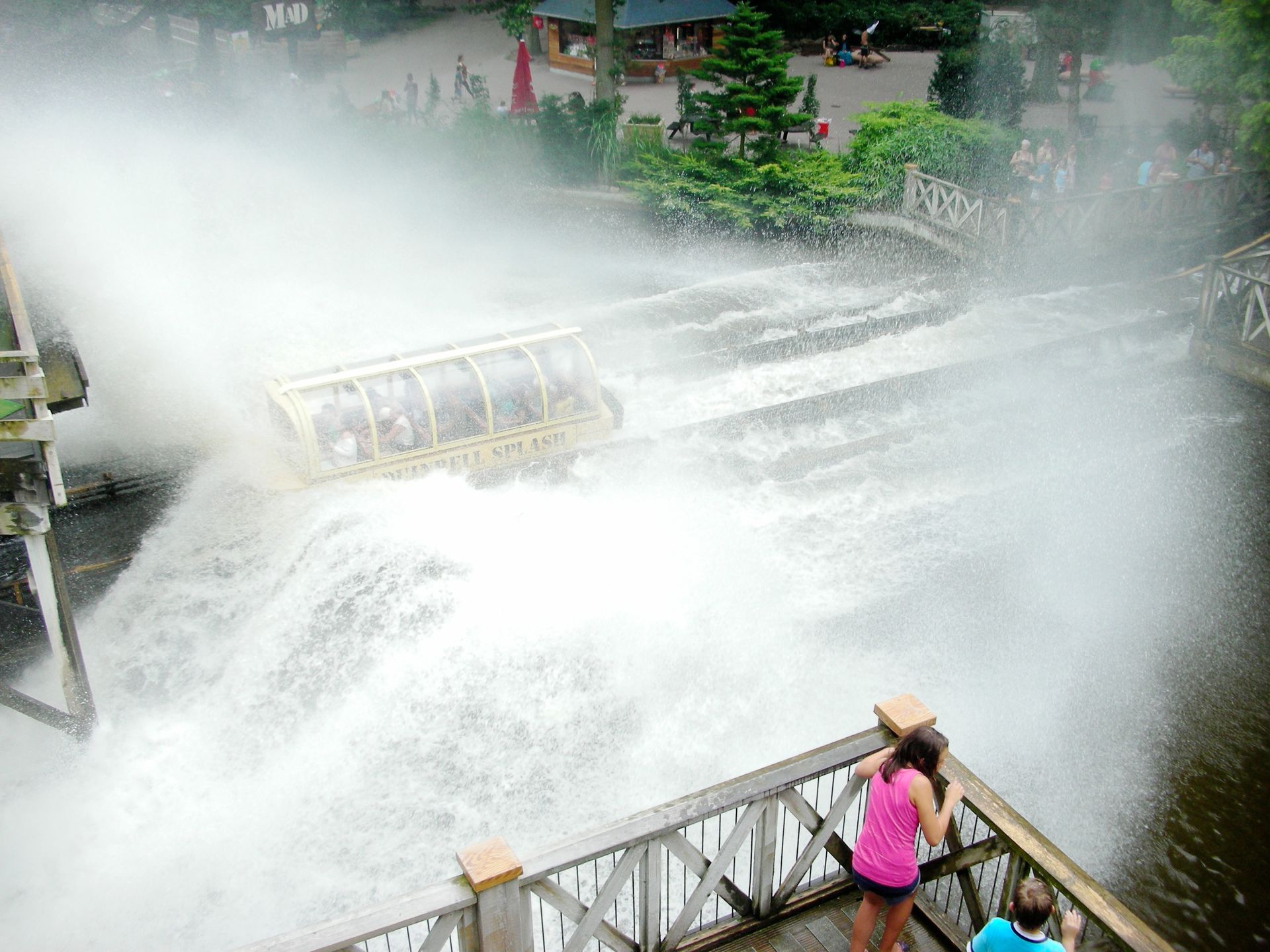 Eine Runde im Plexiglasboot gewährt tiefere Einblicke in die zauberhafte Physik dieser erbarmungslosen Dusche. Kaum dass das Boot in den Splashbereich eintaucht, türmt sich vor ihm eine haushohe Wand aus dem kühlen Nass auf. Schon Newton wusste, dass diese Konstellation zu nur einem einzigen Ereignis führen kann: Die soeben aufgewirbelten Wassermassen stürzen über den Köpfen der Fahrer ein oder krachen mit einem dumpfen Schlag auf das Dach über den Köpfen der Landratten. Dass es außerdem zur Seite spritzt, ist eigentlich nur noch Show, die das Spektakel für die Hartgesottenen in der Splashzone, die im Übrigen auch den Ausgang von Splash darstellt, optisch aufwertet.