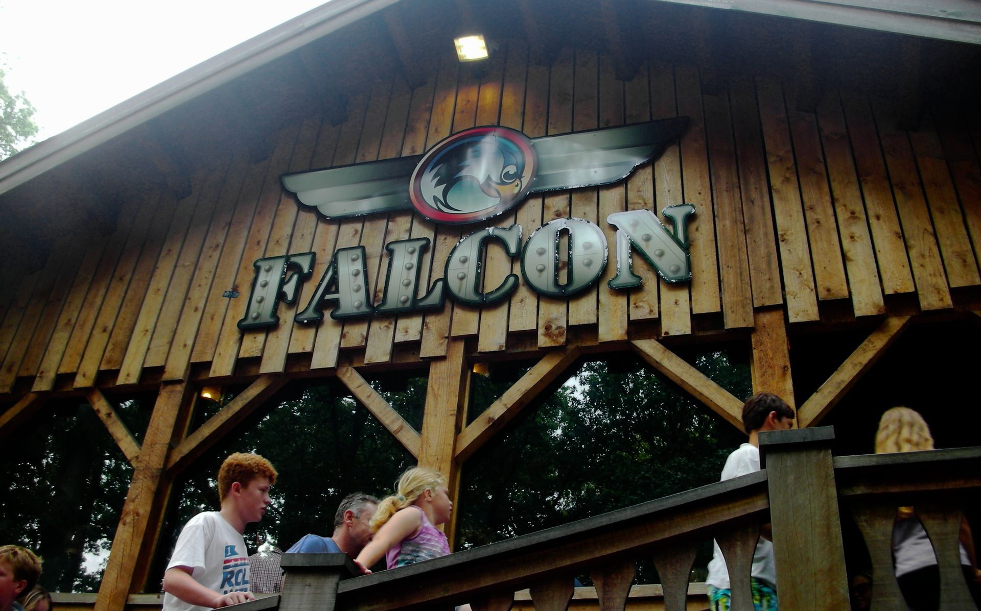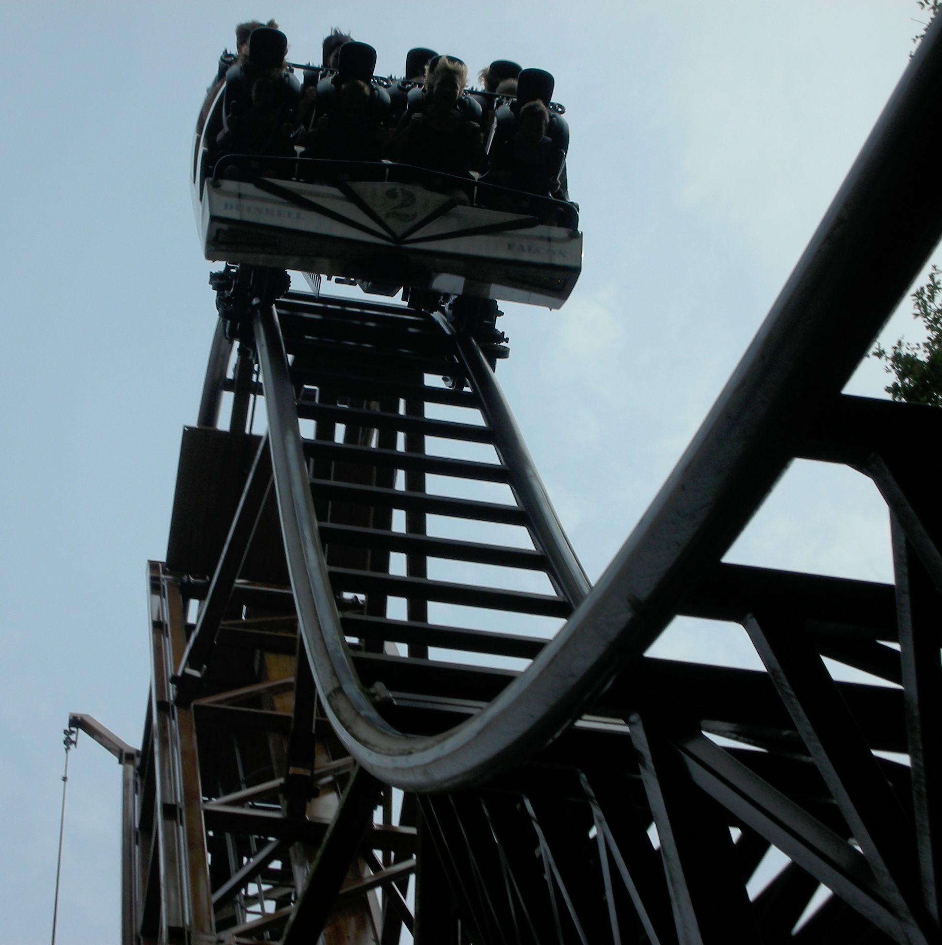 Gerstlauer auszuprobieren. Schon seit zwei Tagen brannte uns die Frage, wie sich ein 97°-Drop wohl fährt, wenn er nicht gerade in einem dunklen Turm platziert ist, und ohnehin verspricht das ultrakompakte Layout von Falcon eine Fahrt am Rande des Wahnsinns. Da es im überschaubaren Wartebereich recht flott voranging, konnten wir ohne lästiges Anstehen unsere Plätze im Eurofighter einnehmen. Leider sind auch die Fahrzeuge von Falcon sehr knapp bemessen: Zieht man die Schulterbügel herunter, muss man sich schon beinahe mit seinem Sitznachbarn absprechen, wer die Arme oben und wer sie unten hält.