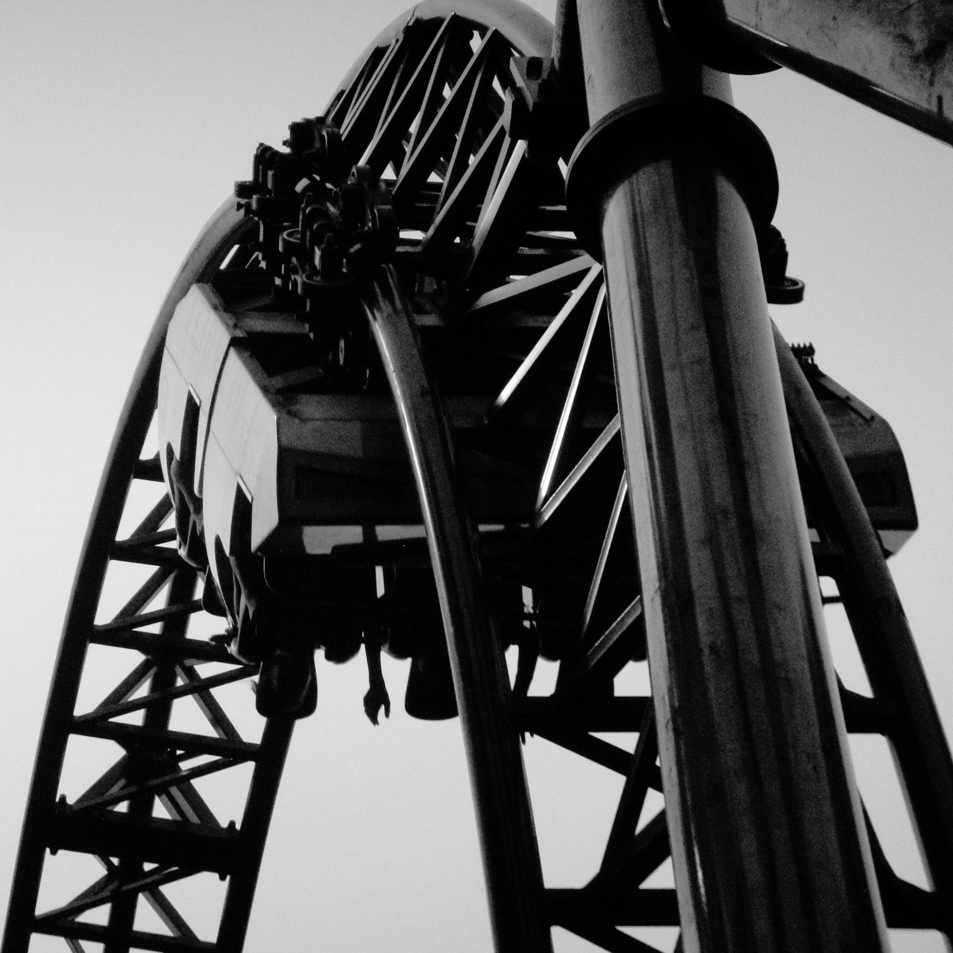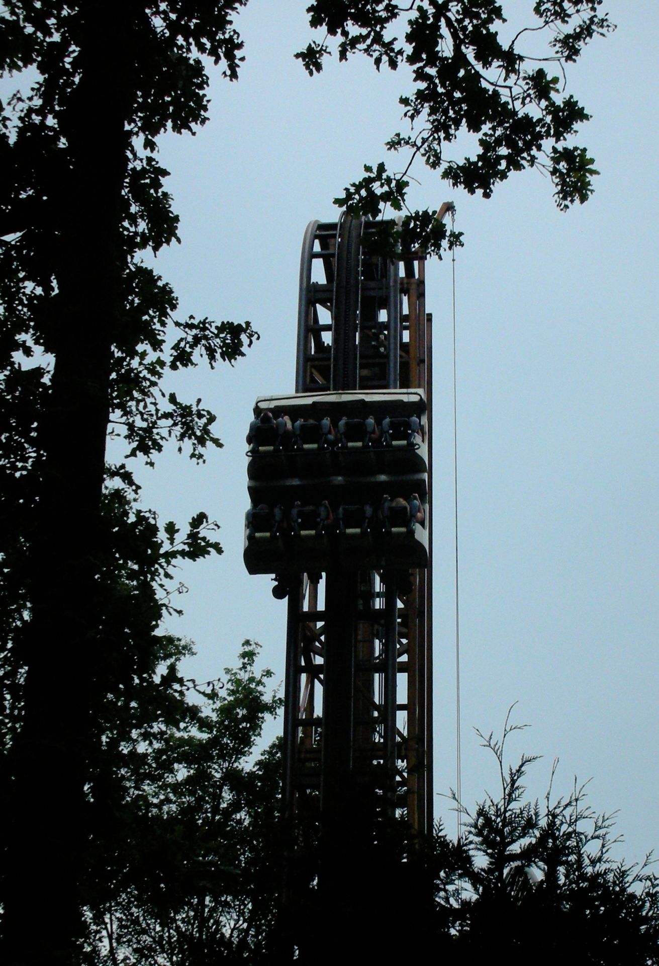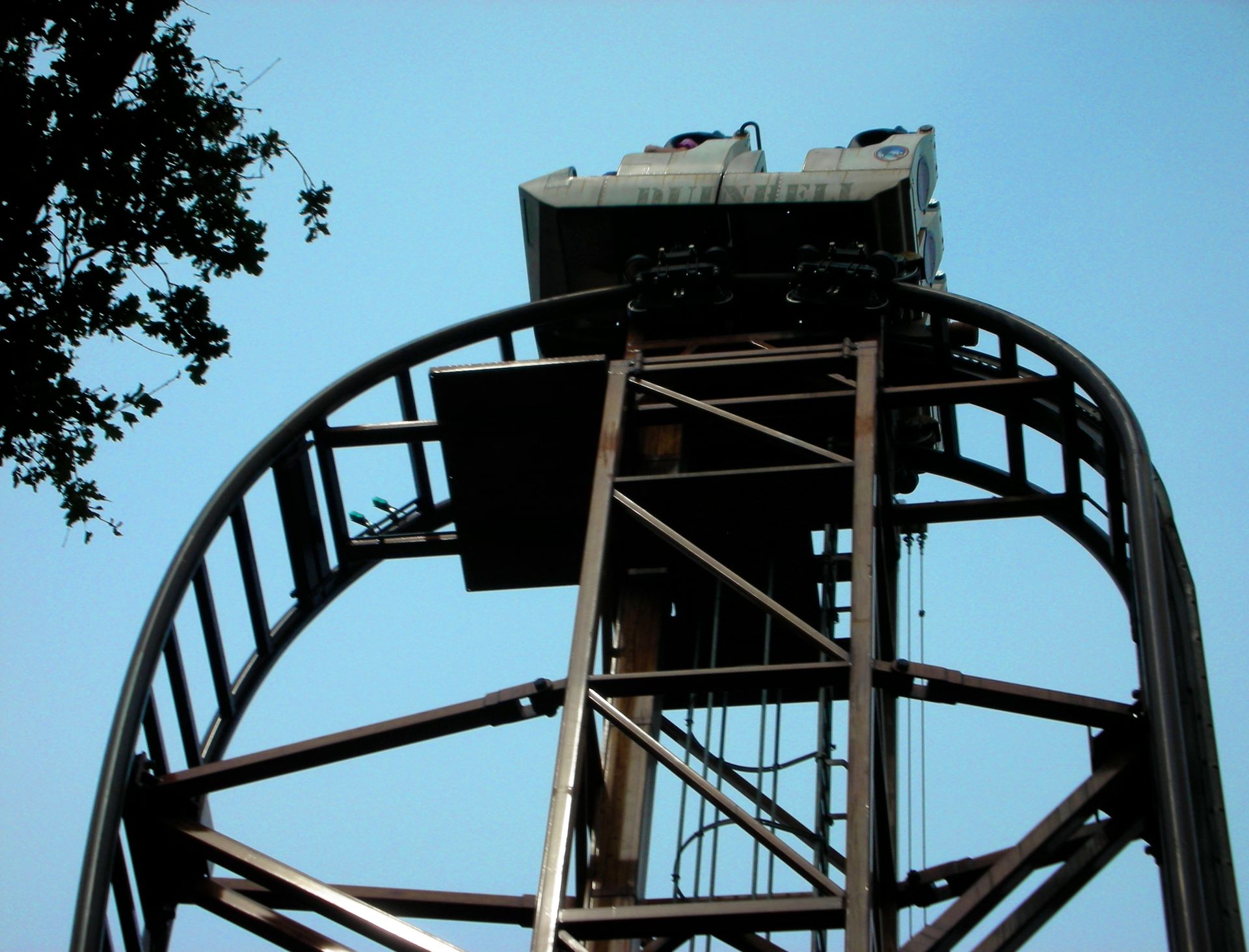 Eine enge Rechtskurve führt zum Lift, der uns sofort auf den Rücken legt. Dem gleißenden Sonnenlicht entgegen geht es vertikal nach oben, bis sich am höchsten Punkt der Achterbahn langsam das eigene Körpergewicht vom Rücken auf den Hintern umverteilt; wir sitzen wieder waagrecht. Der Radius am Ende des Lifthills ist dermaßen eng, dass man nicht mehr wirklich sieht, wohin die Schiene eigentlich verschwindet. Dennoch rollt man unerbitterlich auf dieses Nichts zu, kippt nach vorne um und findet sich plötzlich im Tal wieder, wo man alsbald in den