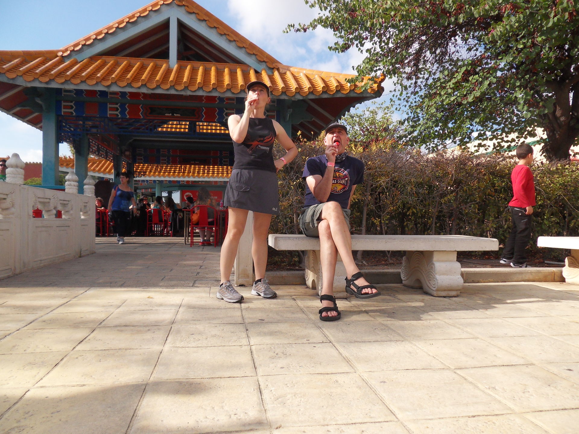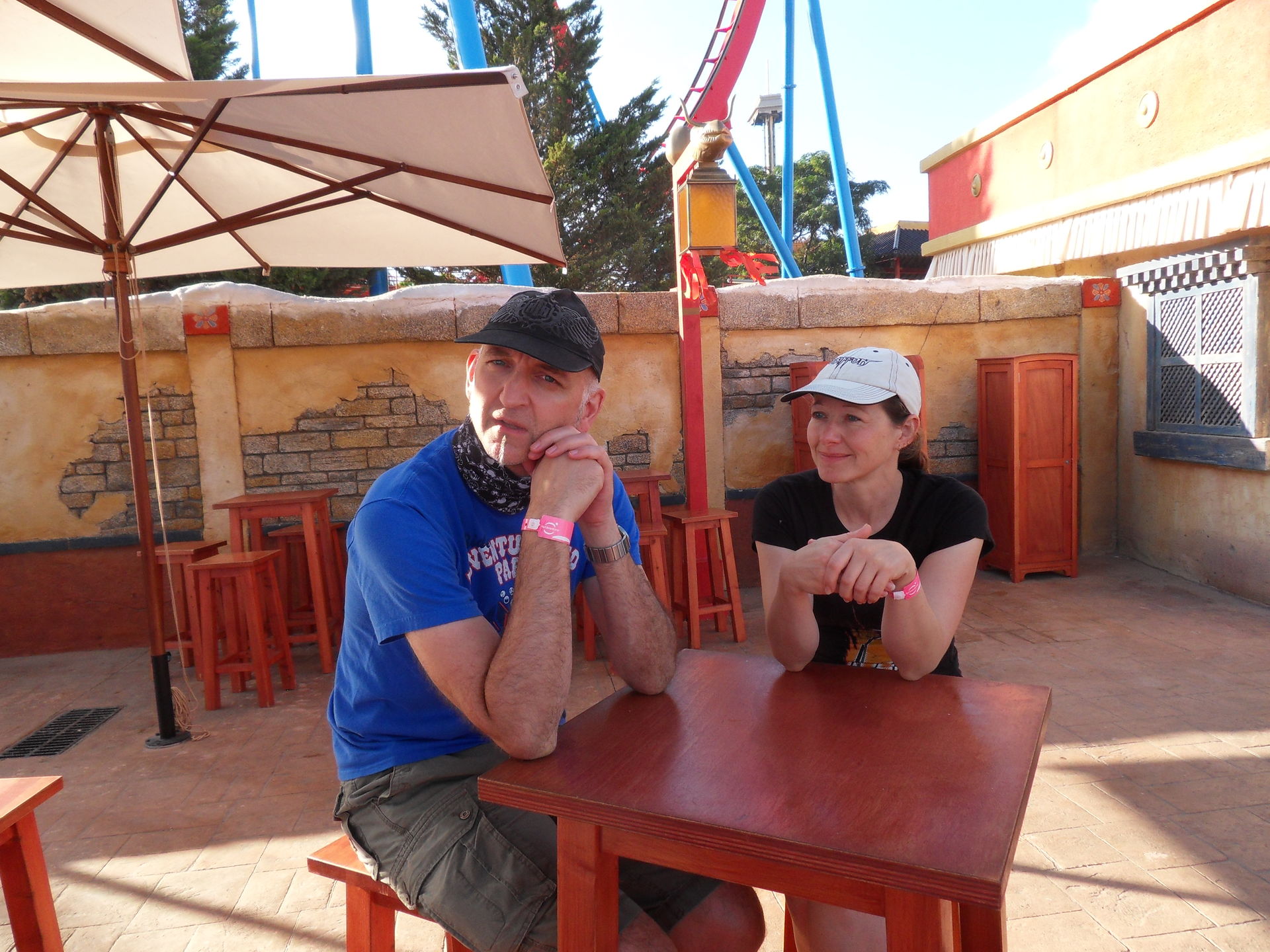 Der erste Tag ging nun zu Ende. Wir haben uns auf unseren Zimmern etwas entspannt und dann das Buffet im Golden River Hotel genossen. Dort gab es neben Fritten und Hähnchenoberschenkeln auch lokale Spezialitäten. Nach der Speisung haben wir uns draussen auf ein Bierchen hingesetzt und der Elmo-Kindershow gelauscht