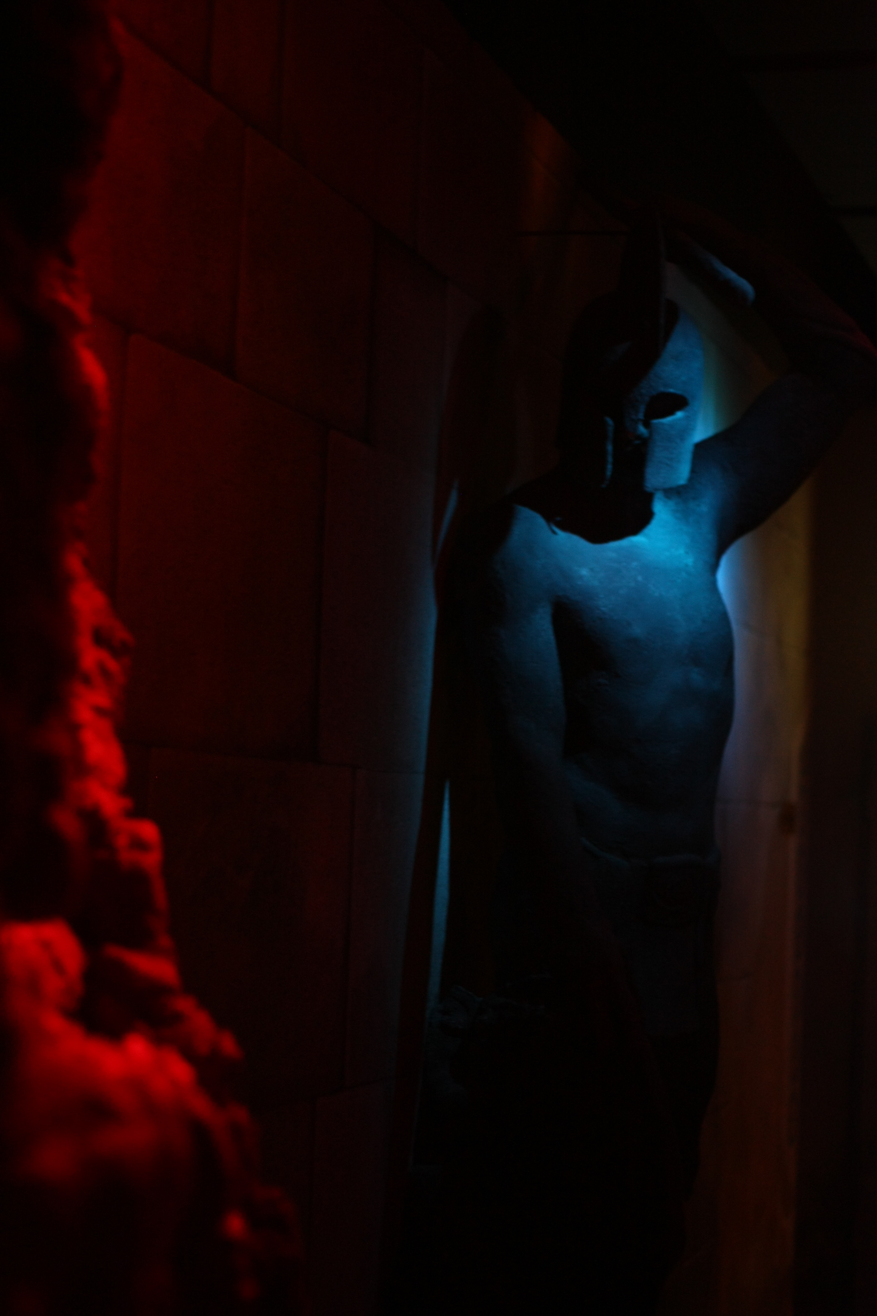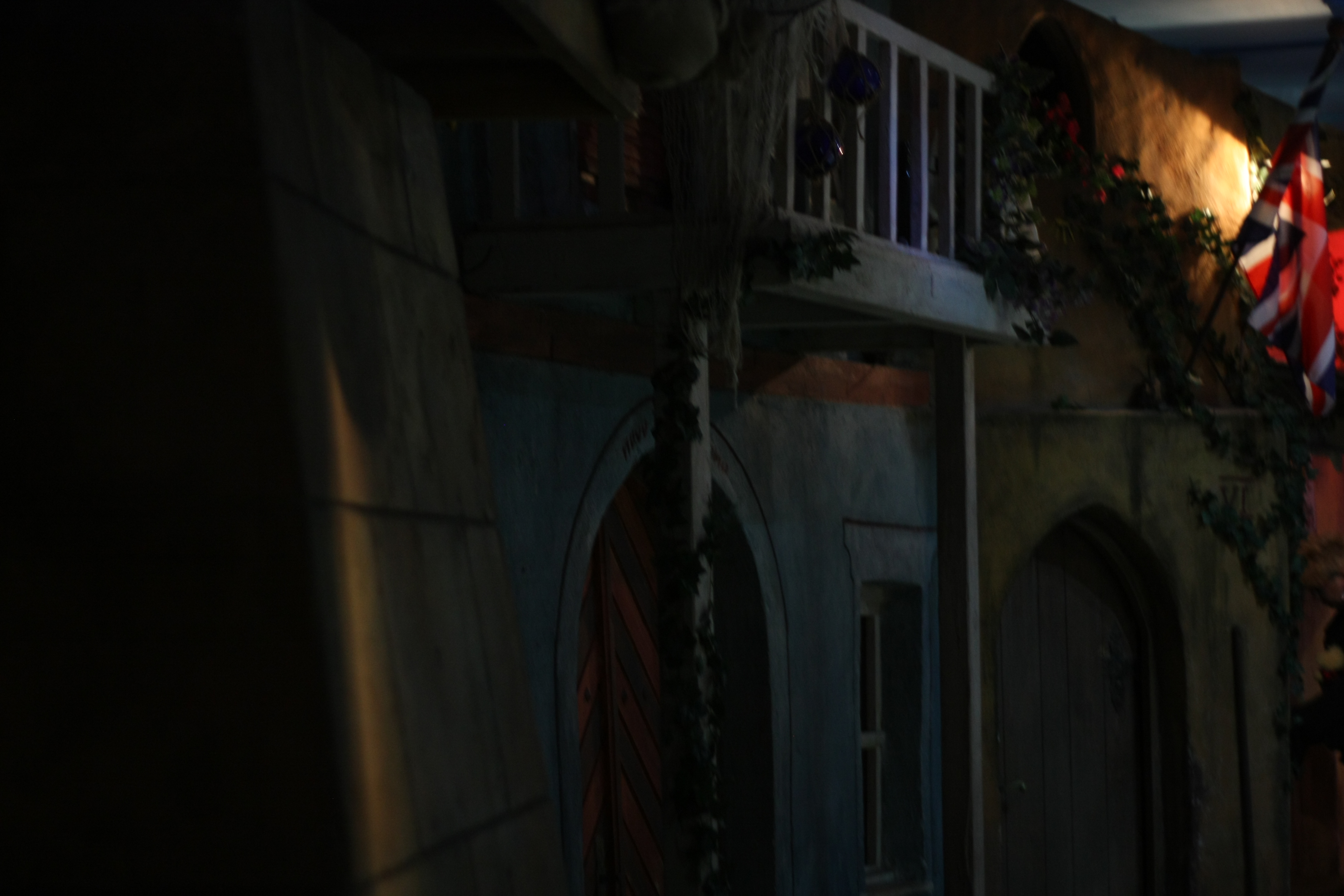 Nachdem sich dann die mechanische Schiebetüre öffnet, gelangt man in den ersten Raum, welcher mit seinen steinigen Bögen und Statuen-Versatzstücken eher "gotisch-veträumt" daherkommt, also durchaus stimmig.