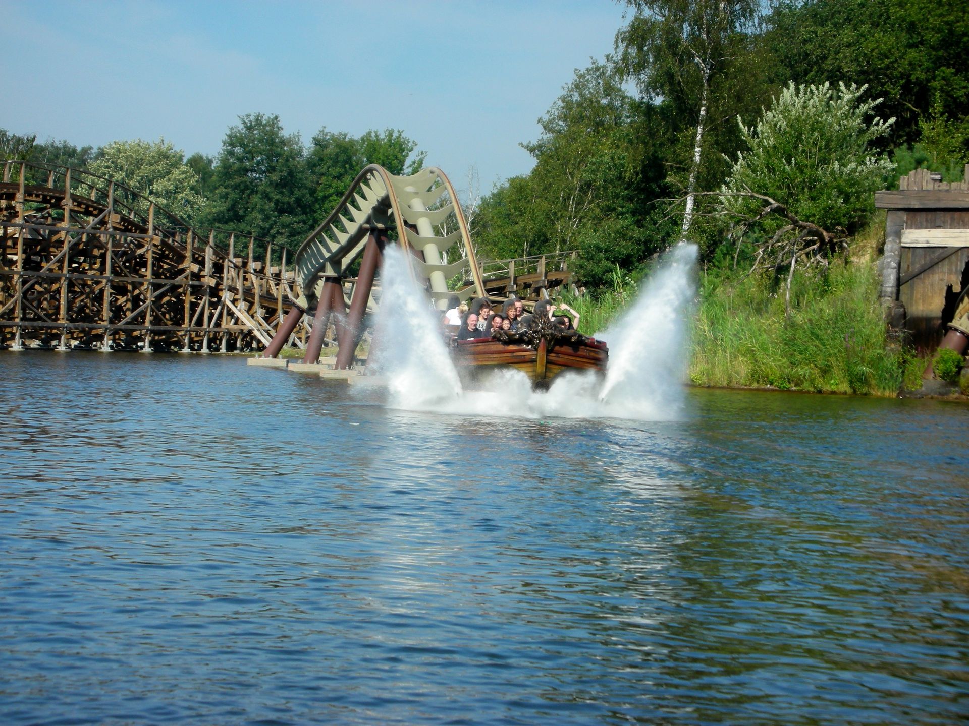 Der First Drop - das Boot verliert auf seiner Achterbahnreise ordentlich Wasser und verteilt es gerecht an die darunterstehenden Besucher