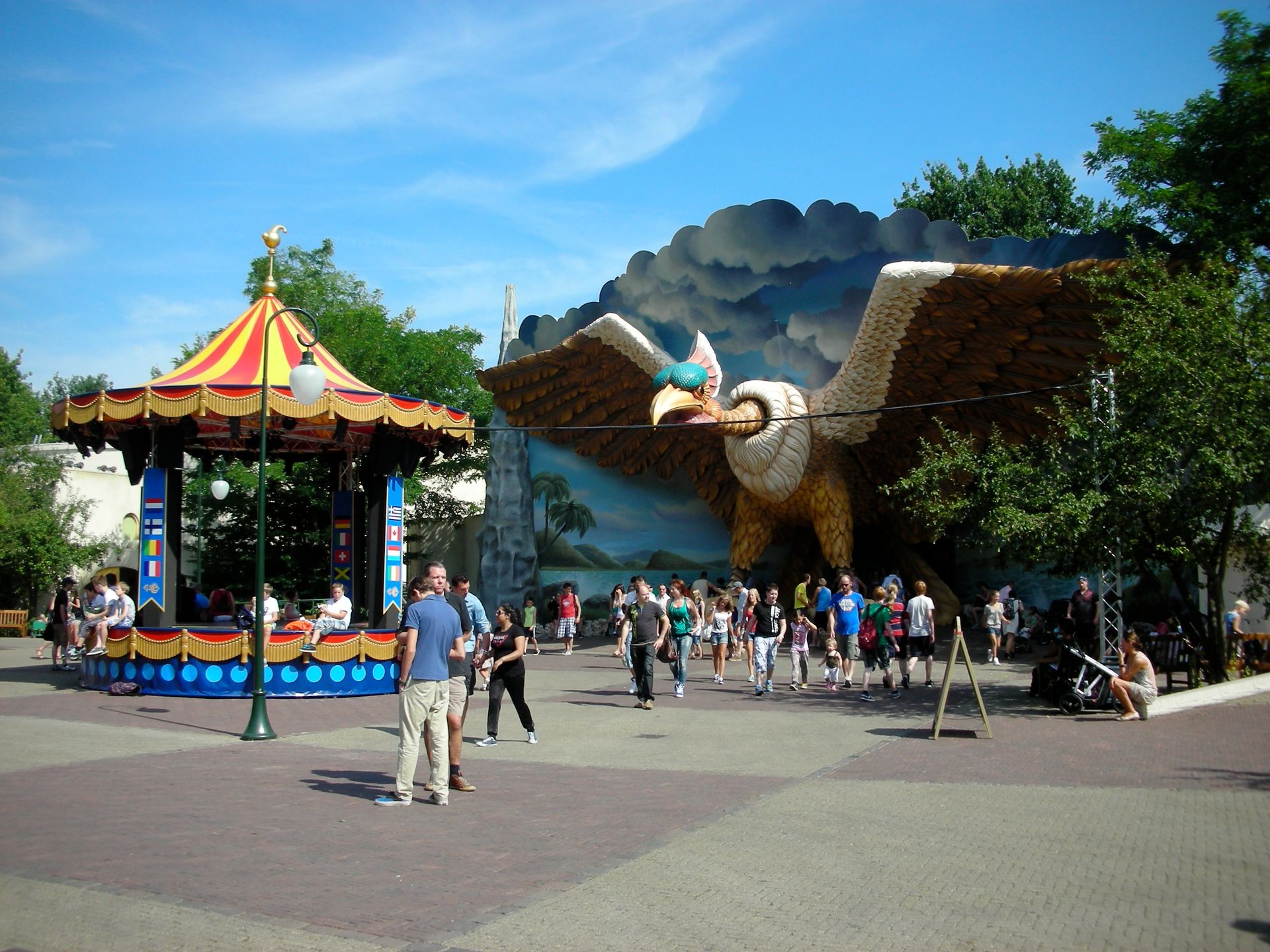 Vekoma Indoorcoaster Vogel Rok sein, weshalb wir den Themenbereich "Ruigrijk" verlassen mussten und nach "Reizenrijk" aufbrachen. Angeheizt wurde zumindest ich auf dieser Reise von zwei mit Wasserpistolen bewaffneten Mitarbeitern in der Game Gallery, die mich nach einem kurzen Blickwechsel zuerst tanzen und schließlich rennen ließen. Nach einem langen Spaziergang quer durch Efteling, bei dem man alle Sorgen weit hinter sich ablegen kann, fanden wir vor uns endlich das stolz aufgespannte Federvieh. Um eine Fahrt auf Vogel Rok anzutreten, muss man jedoch erst einmal den Mut aufbringen, dem Ungetüm frech zwischen den Beinen hindurchzulaufen.