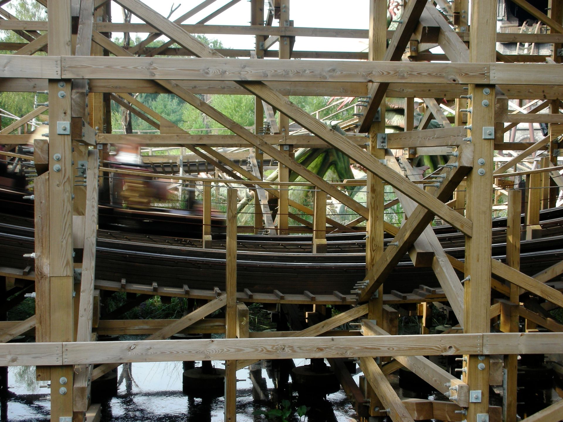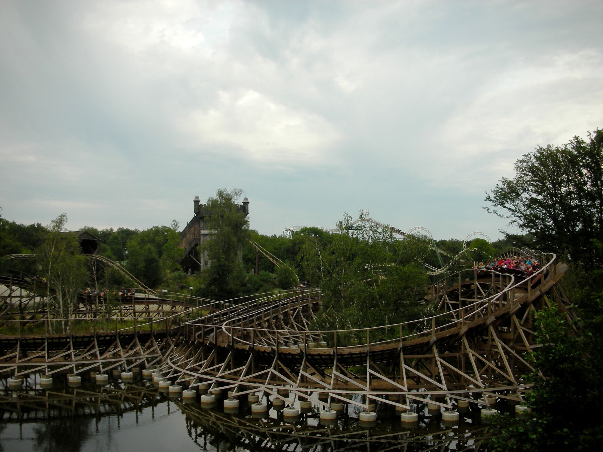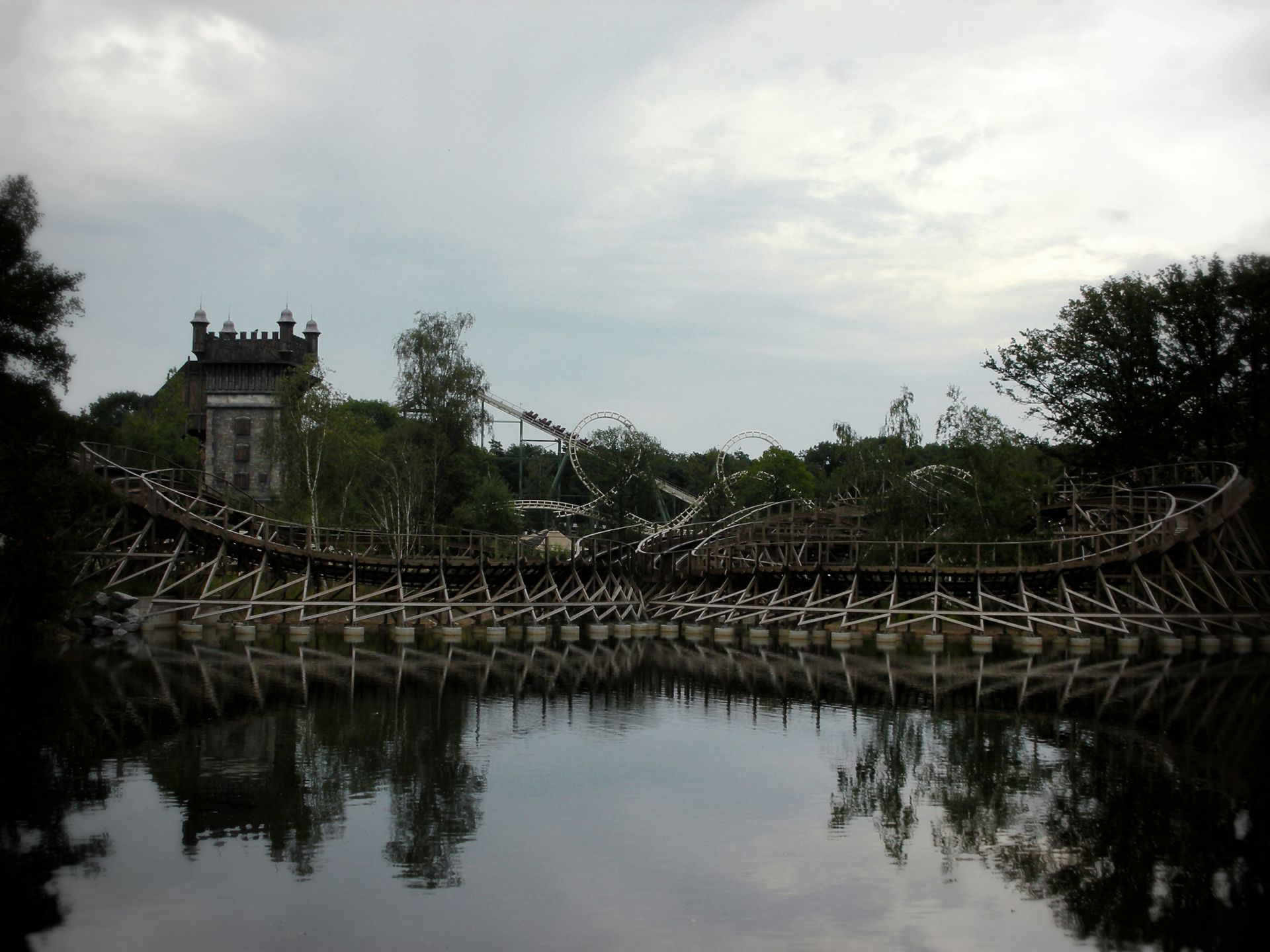 First Drop und die erste Auffahrt, die gleich drei Airtimemomente bietet, der beiden Bahnen verlaufen exakt spiegelverkehrt nebeneinander; einer der beiden Züge führt hier jedoch bereits immer das Rennen an, was mich jede Fahrt mit einem vervösen Blick auf die Konkurrenten völlig aufwühlte. Mit der ersten Speedkurve gehen die Tracks Vuur und Water getrennte Wege, wahren allerdings immer die Nähe zueinander. Beide Strecken führen dabei über den See, wo Feuer und Wassereffekte die Fahrt untermalen. Bevor jedoch das gegenüberliegende Ufer erreicht ist, fahren beide Woodys in einer Kehrtwende aufeinander zu und liefern sich auf dem Rückweg meist ein spannendes Kopf-an-Kopf-Rennen, welches vom lauten Tosen der Züge und den anheizenden Schreien der Fahrgäste begleitet wird. Wer auf diesen letzten Meter ruhig Blut bewahrt, ist entweder nicht zu begeistern oder grenzenlos mit der Physik der Achterbahn überfordert.