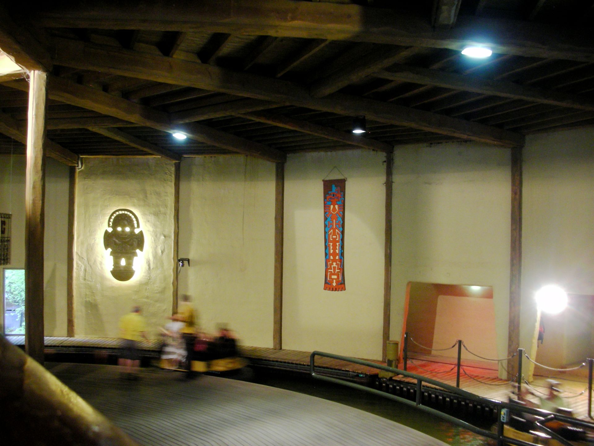 Durch Drehkreuze gelangten wir in einen ausgeschmückten Raum, den ich erneut als "geil" befand. Als alle Besucher eingetreten waren, schlossen sich die Türen, sodass die stimmige Beleuchtung im Inneren ihr Übriges tun konnte, das ohnehin schon antiquarische Flair zu verstärken. Sofort begann eine Stimme von oben zu erzählen und zu erzählen und zu erzählen... Selbstredend konnten wir keinem Wort folgen. Was den Unterhaltungsgrad allerdings nicht gerade aufbesserte, war die Tatsache, dass während dieses Rezitats vom Band im Raum selbst absolut nichts Beeindruckendes vor sich ging, wie es zum Beispiel in Merlin's Haunted Castle (in Walibi Holland) der Fall war.