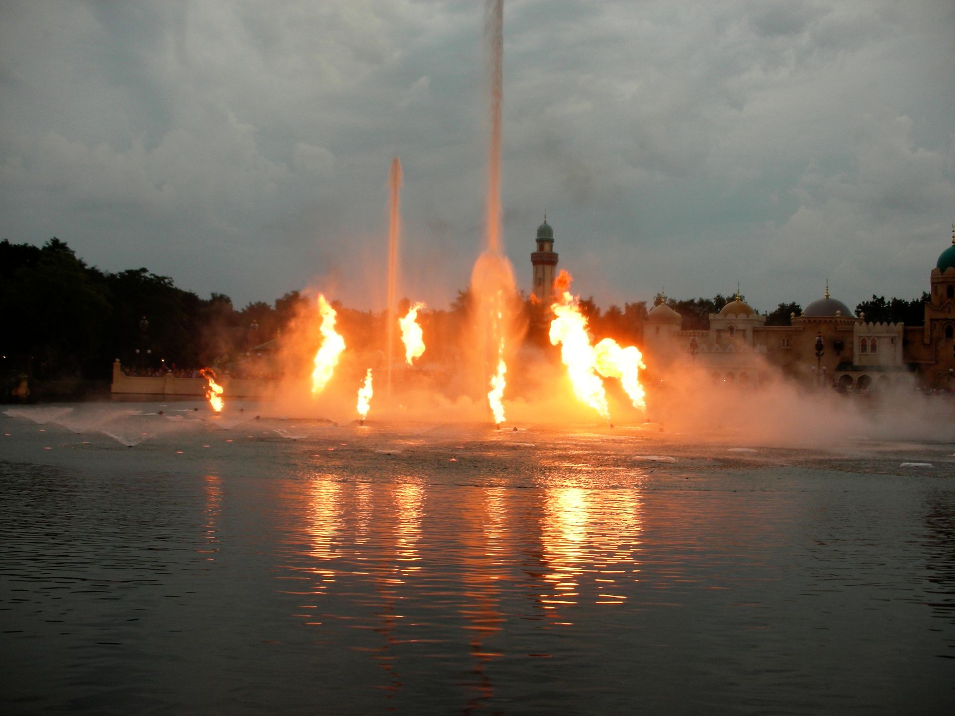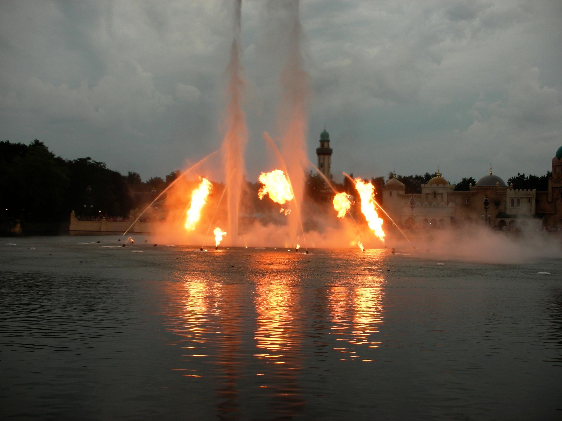 Das Zusammenspiel der kalt berechneten Wasserstrahlen und der wild ausschlagenden Feuerballen...