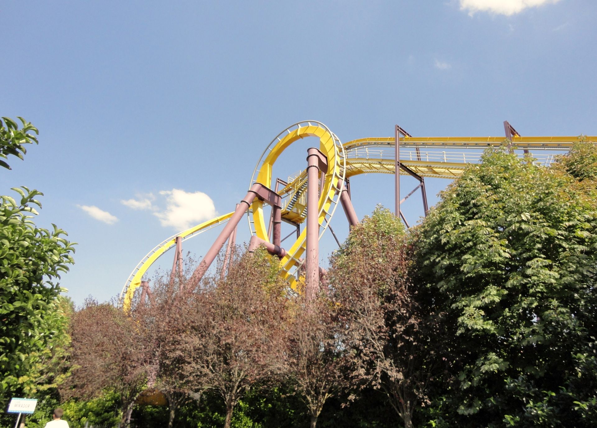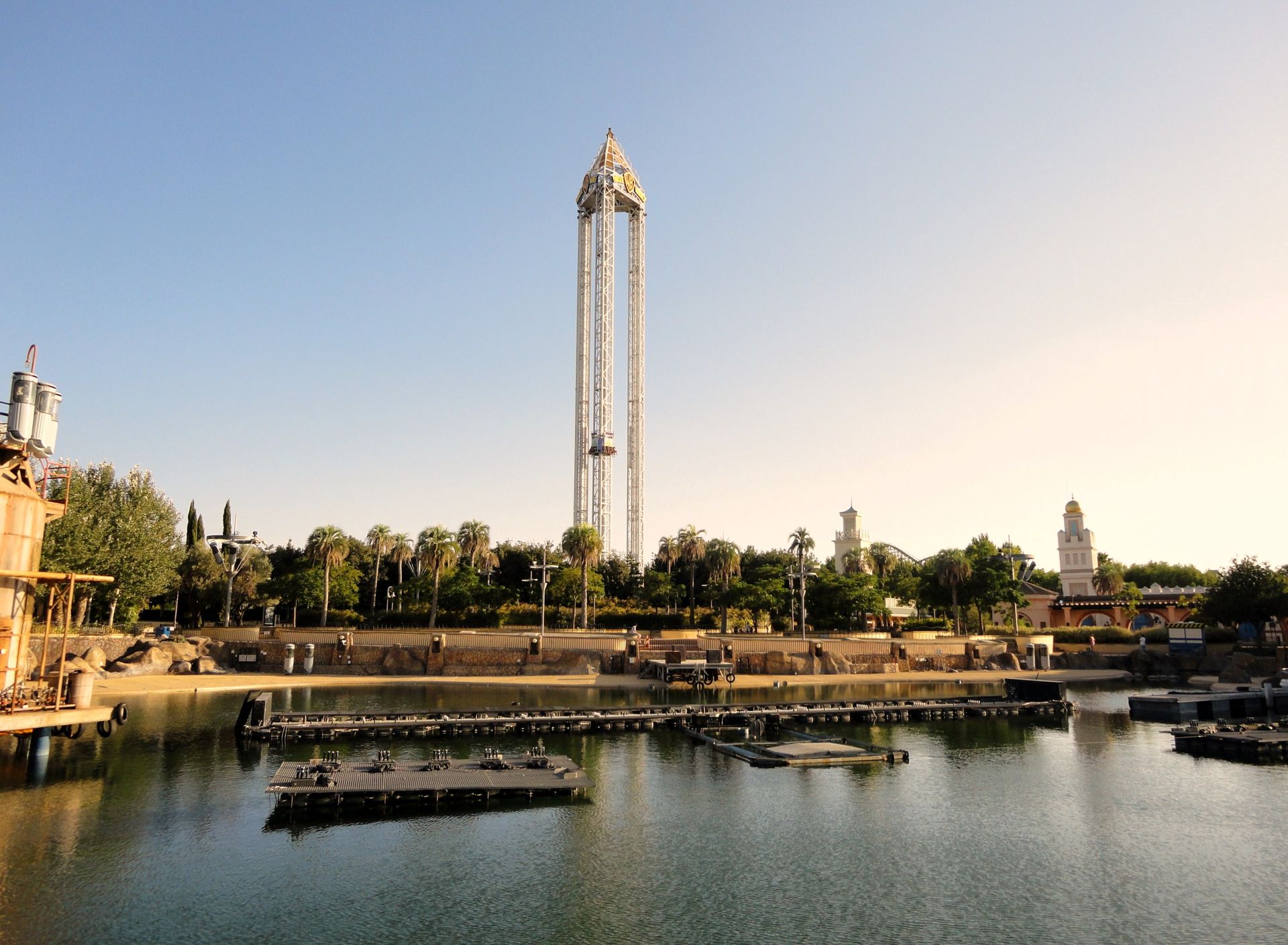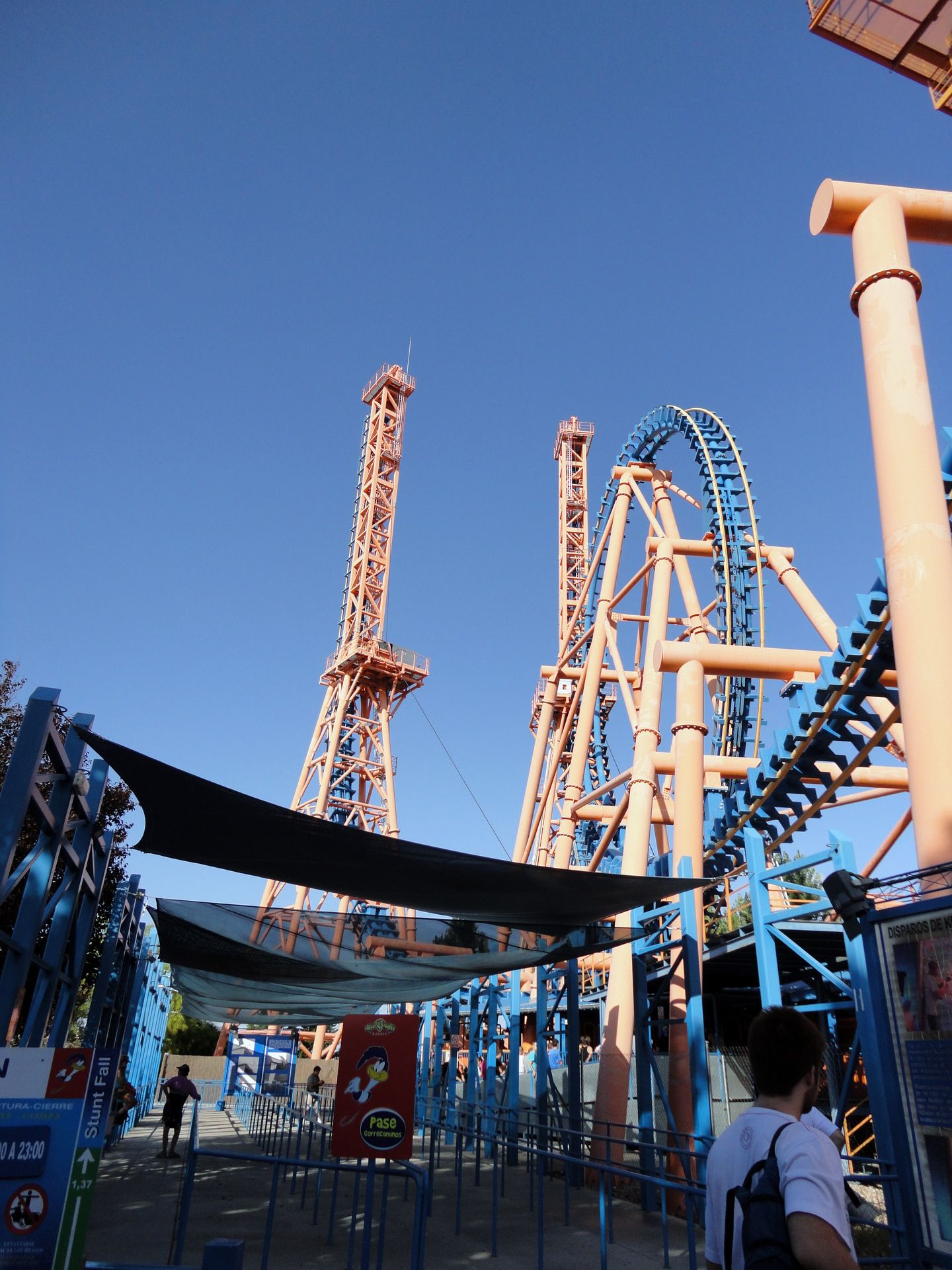 Schon am Weg von der Bahnstation zum Parkeingang sahen wir das Highlight des Parks auf der linken Seite - die Stuntfall Bahn. Eine Bahn, die uns im weiteren Verlauf des Tages noch Kopfzerbrechen bereitete. Da die Bahn aber für uns das Highlight des Parks ist, wollten wir sie am Ende fahren und durchliefen den Park gegen den Uhrzeigersinn.