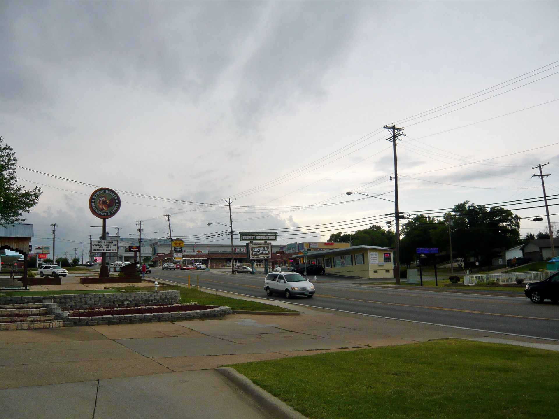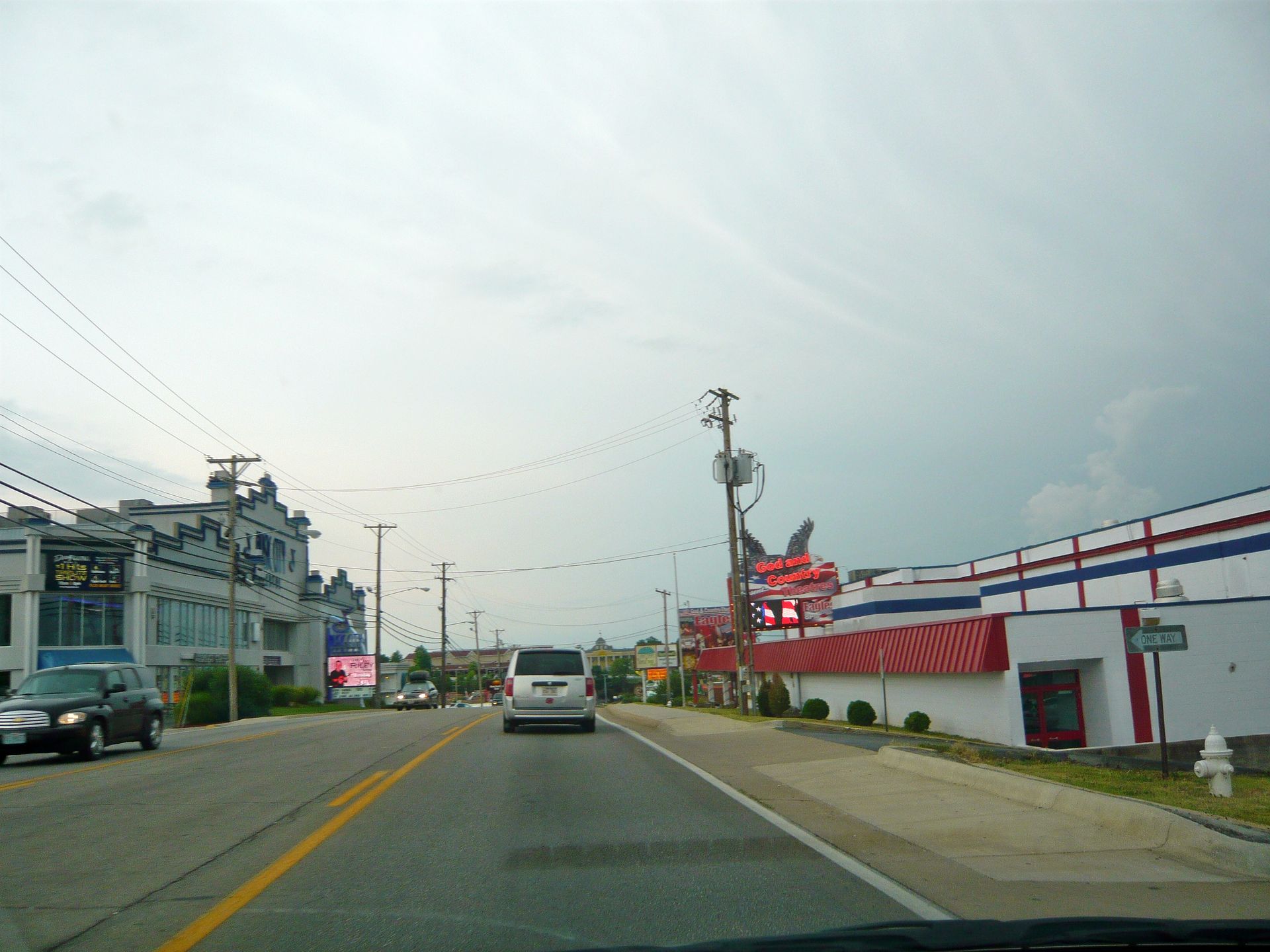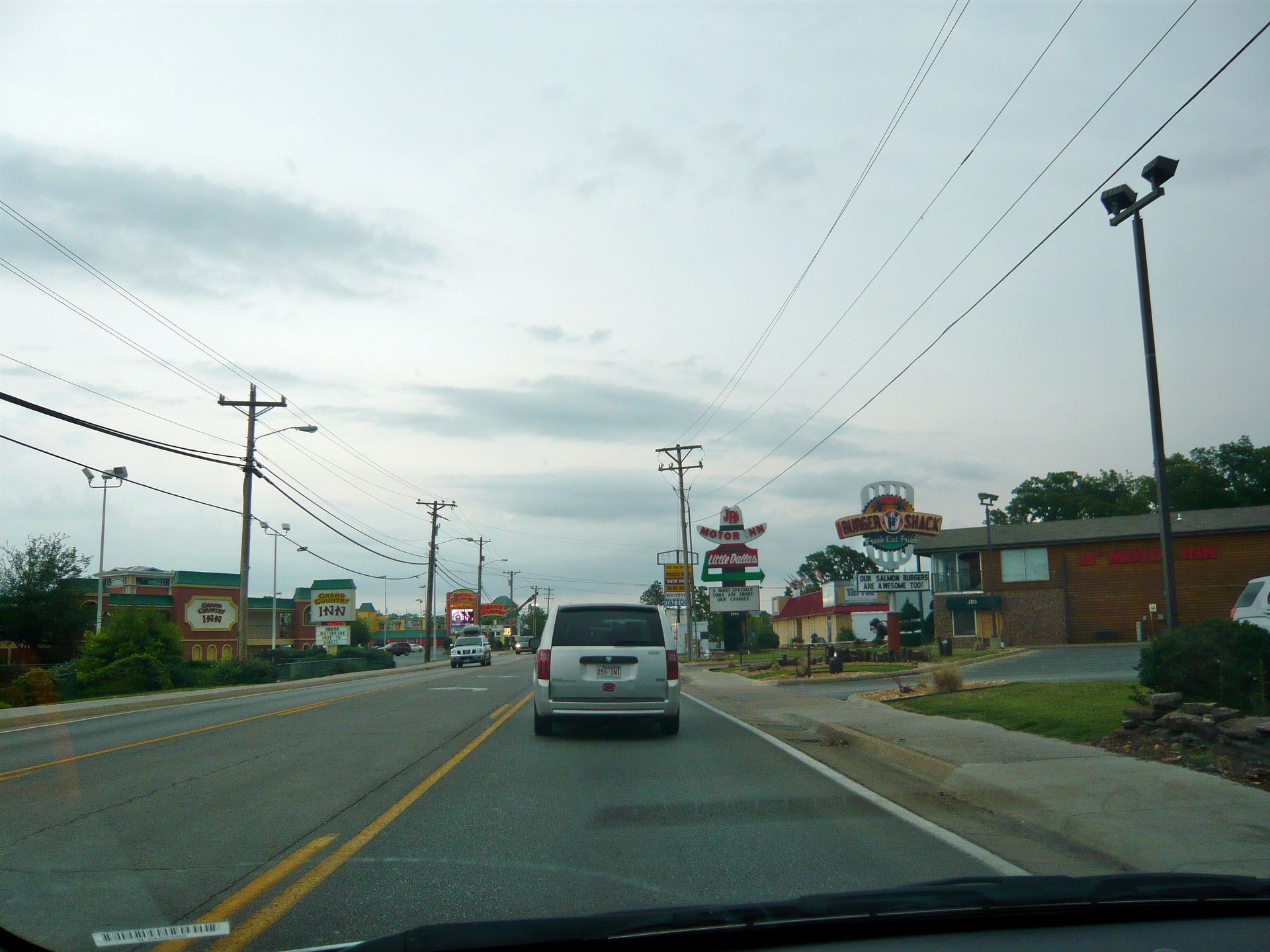 Und so war es dann auch. Mal zweispurig in jede Richtung und mit bepflanztem Mittelstreifen wie eine klassische Autobahn, in jede Richtung zweispurig ohne bepflanzten Mittelstreifen, alternierend zwei- oder einspurig in jede Richtung (entweder komplett mit meilenlangen Reissverschluss-Einfädelspuren oder dann mit welchen ohne grossartige Vorwarnung, wie wir sie ja auch von daheim kennen), mal in jede Richtung bloss einspurig, mal mit Ampeln jede halbe Meile, dann wieder eine gefühlte Stunde lang keine, mal an Outskirts von offenbar grösseren Ortschaften vorbei, mal aber auch mittendurch oder gleich wieder pfeilgerade durch die allertiefste Bauernpampa... Diese Strassen sind irgendwie als alles, was man so kennt, dahergekommen. Normalerweise finde ich gerade diese Etappen einer USA-Tour ausgesprochen spannend. Hier wurde uns aber die kurze Nacht in unserer ja nicht allzu schmeichelhaften Unterkunft gegenüber von Worlds of Fun zum Verhängnis, sowie auch das trostlose Wetter in Form von tiefhängenden grauen Wolken und Dauernieselregen, für den es sich kaum lohnte die Scheibenwischer einzuschalten. Da meine die ganze Fahrt über schnarchenden und unter 25-jährigen Mitstreiter mich nicht entlasten konnten überfiel mich irgendwann trotz Tempomat und wenig Verkehr die Krise, so dass ein kurzes Not-Nickerchen auf irgendeinem Landsupermarkt-Parkplatz abgehalten werden musste. Dieses wirkte dann aber wahre Wunder, so dass daraufhin die letzten paar Dutzend Meilen in Richtung Branson in Angriff genommen werden konnten.