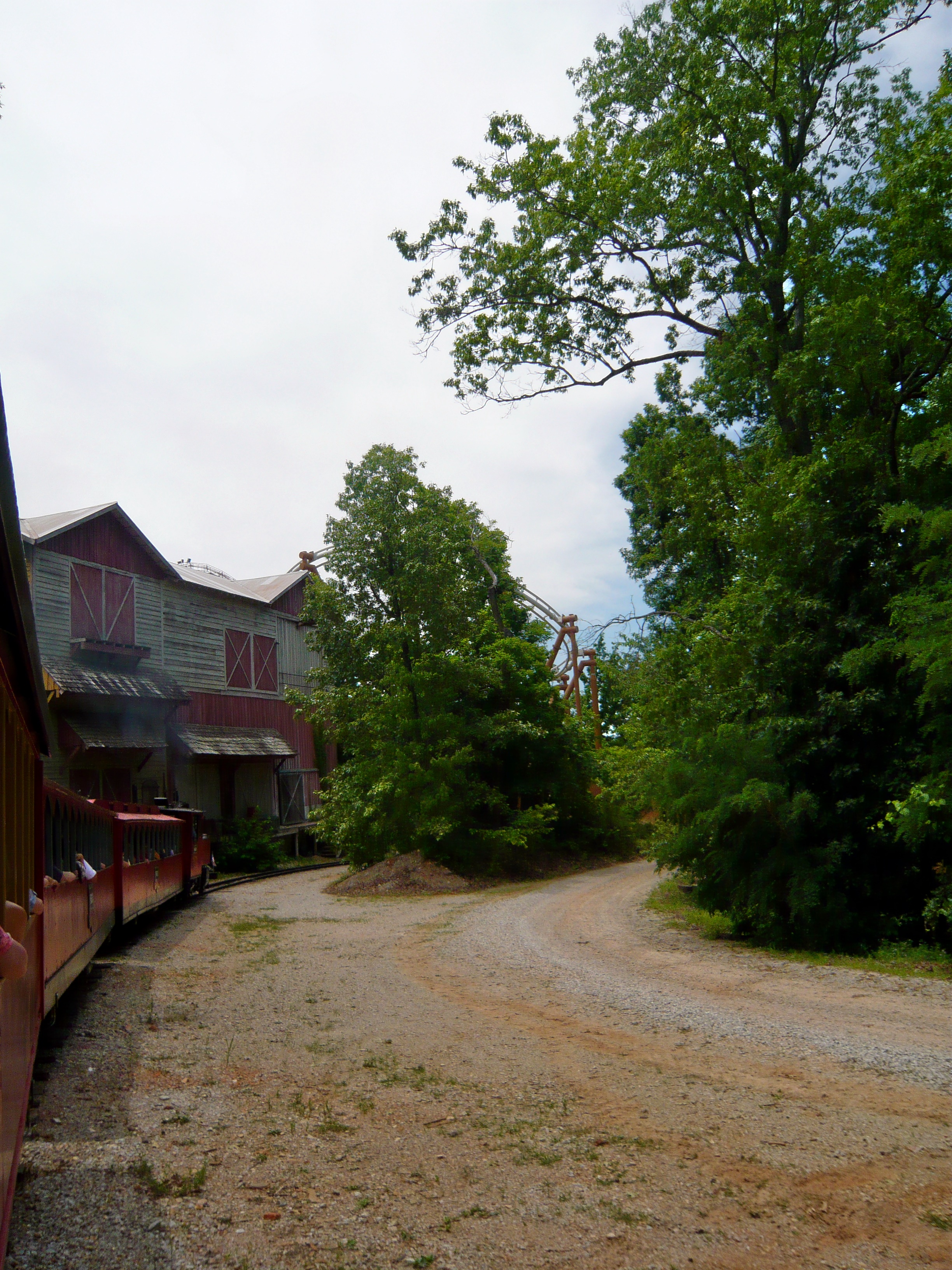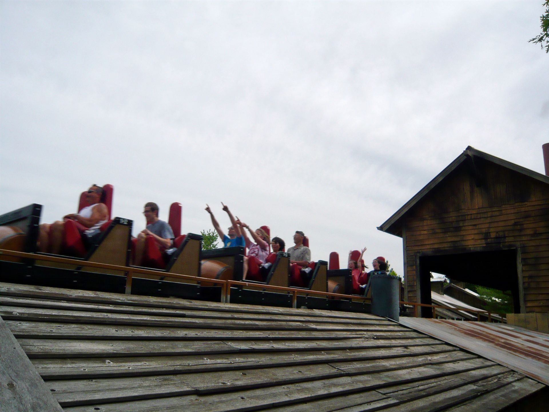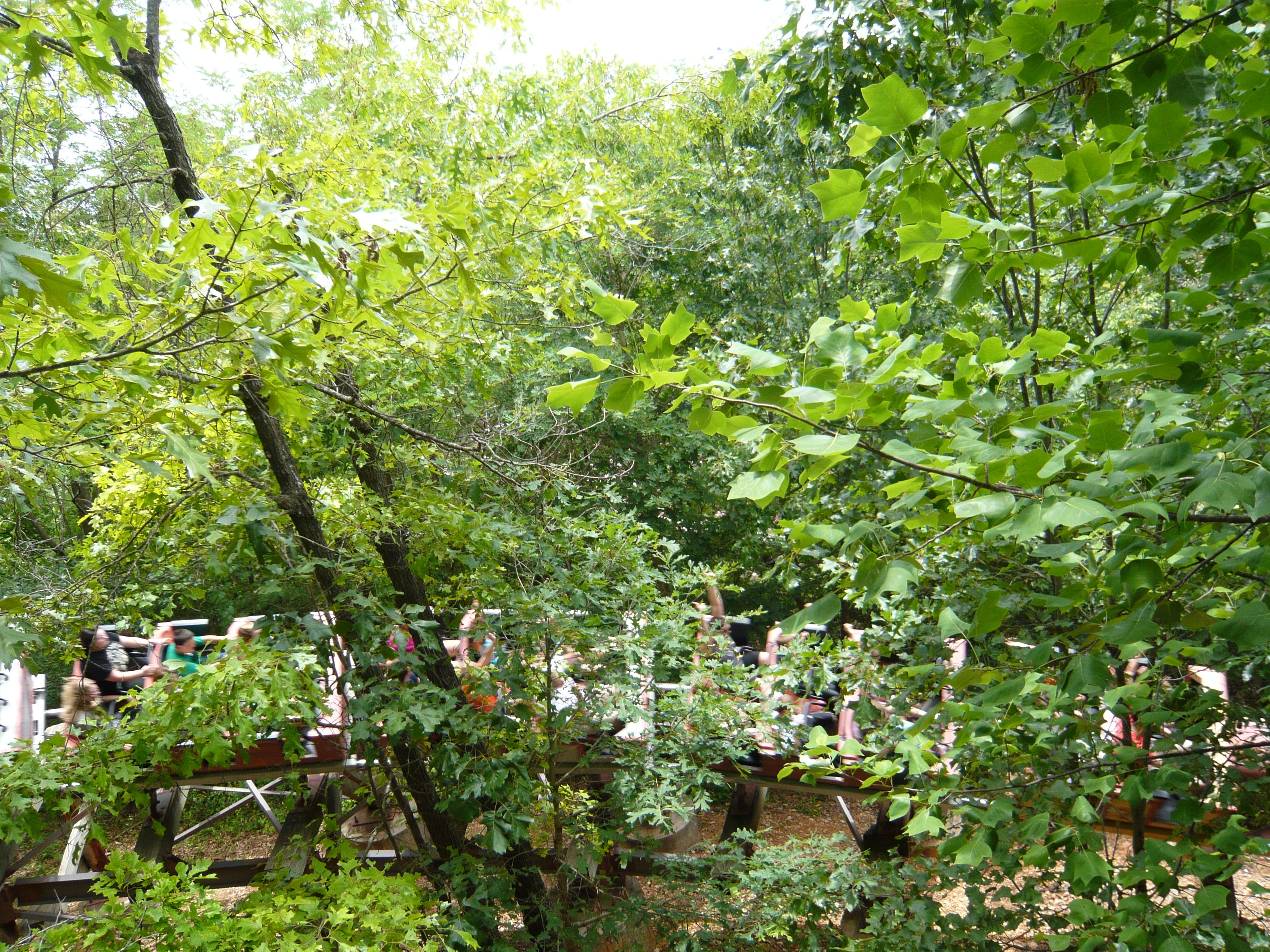 Airtime, stark gebankten Kurven und grandiosen "Tauchfahrten" ins Grüne! Und irgendwann - voll WTF - ändert sich das Schienenprofil, auf dem der Zug dann eine letzte weite Schwenkfahrt unternimmt. Und dann, tja, wird man abgebremst und erklimmt den noch bestehenden Hügel der alten Buzz Saw Falls-Wasserbahn. Oben angekommen macht man kehrt, vollführt die ehemalige Talfahrt (sogar Wände des Wasserbeckens unten sind noch übrig!), daraufhin eine abschliessende