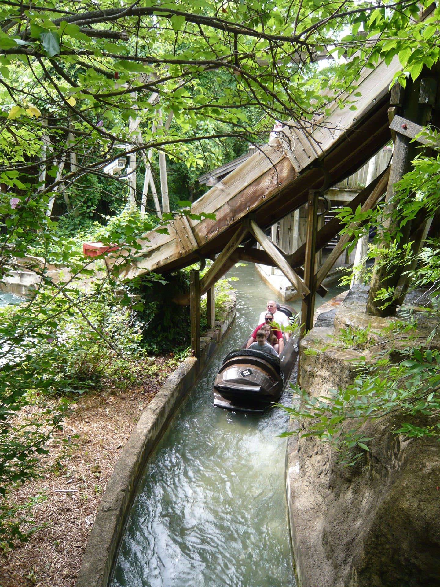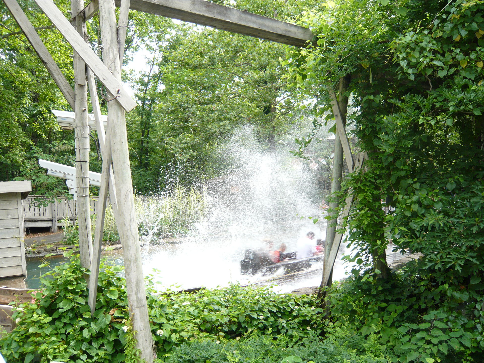 Brav wie wir sind folgten wir den Anweisungen des Parkpersonals: den Mitstreitern wurden die beiden vorderen Plätze und mir der hinterste Platz im Baumstamm zugewiesen. Langsam setzten wir uns von der einen in Betrieb befindlichen Stationshälfte in Bewegung und rauschten dann gemächlich den Kanal entlang. Unterwegs folgt ein langer, dunkler und etwas ereignisloser Tunnel, der aber einen recht speziellen Ausgang hat: die Kanalwände gehen da sozusagen direkt in Minenschachtwände neben einem über, was eine interessante Optik und ein irgendwie beklemmendes Gefühl ergibt. Nach anschliessendem Rumgondeln durch eine nett gemachte künstliche Schlucht mit immer genau im rechten Moment abschaltenden Wasserspeiern gehts dann auch schon aufwärts zur einzigen, 15 Meter hohen Schussfahrt der Anlage. Und hinterher kann ich nur eins sagen: Setzt euch auf keinen Fall ohne ein menschliches Schutzschild direkt vor einem in diese vermaledeiten Baumstämme! Der Kollege ganz zuvorderst und ich ganz hinten bekamen das ganze Spritzwasser ab - der Mitstreiter in der Mitte blieb absolut trocken! Und irgendwie wurde der ganze Schwall auch überhaupt nicht gehindert, von allen nur möglichen Seiten auf uns andere zwei reinzuprasseln: die Boote haben nämlich lächerlich niedrige Seitenwände im Vergleich zu denen auf anderen Wildwasserbahnen. Unsere T-Shirts waren jedenfalls zum Auswringen gesoakt und die Haare trieften nur noch so. Und irgendwie hat die Bahn es geschafft, dass