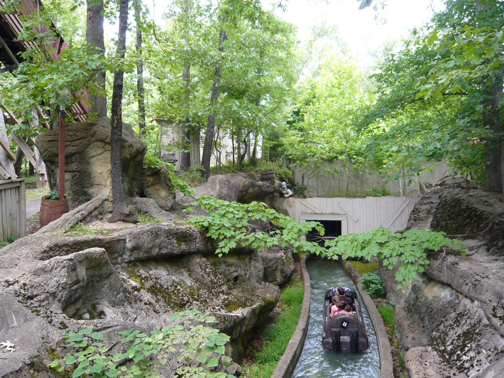 Nicht weit entfernt von diesem idyllischen Wasserfall ganz in der Nähe des Ausgangs von American Plunge machten wir eine interessante Entdeckung: dort führen weitere, scheinbar stillgelegte Segmente der Wildwasserbahn vorbei. Im Netz und auf Fanseiten haben wir nichts über eine Verkürzung der Strecke oder eine andere ähnliche Attraktion, die sich vielleicht mal hier befunden hätte, gefunden. Weiss jemand, was es damit auf sich haben könnte?