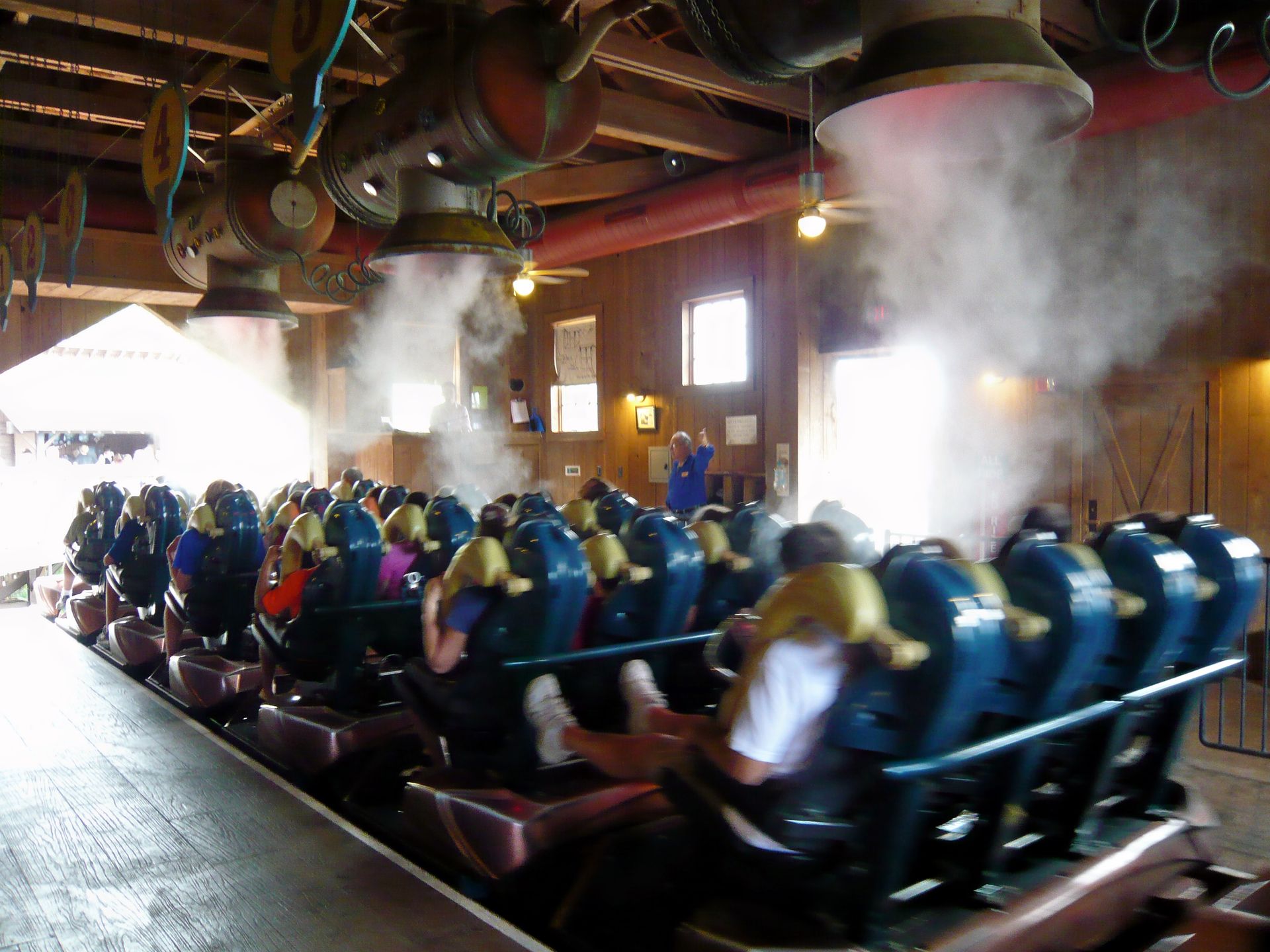 Die recht publikumswirksame Inszenierung der Bahn mit dem imposanten Aussichtsdeck, von wo aus man einen tollen Weitblick auf die Anlage selbst und auch ins Tal dahinter hat, bewirkte dass Wildfire an diesem Besuchstag die mit Abstand beliebteste Attraktion im Park war. Die irrwitzig als verrücktes Labor anno 19. Jahrhundert gestaltete Queue mit dem kultigen grünen Blubberkessel, an dem man diverse Knöpfe, Steuerräder und Schalter bedienen darf (und damit ganz Unterschiedliches auslöst), verkürzt die ohnehin recht kurze Wartezeit bei Einzugbetrieb ungemein. Weil wir uns jeweils einzeln mit anderen Dreiergruppen verpartnern konnten, waren wir schon nach drei Zugladungen an der Reihe und nahmen in einem der speziellen Züge Platz, die ähnlich wie diejenigen auf den