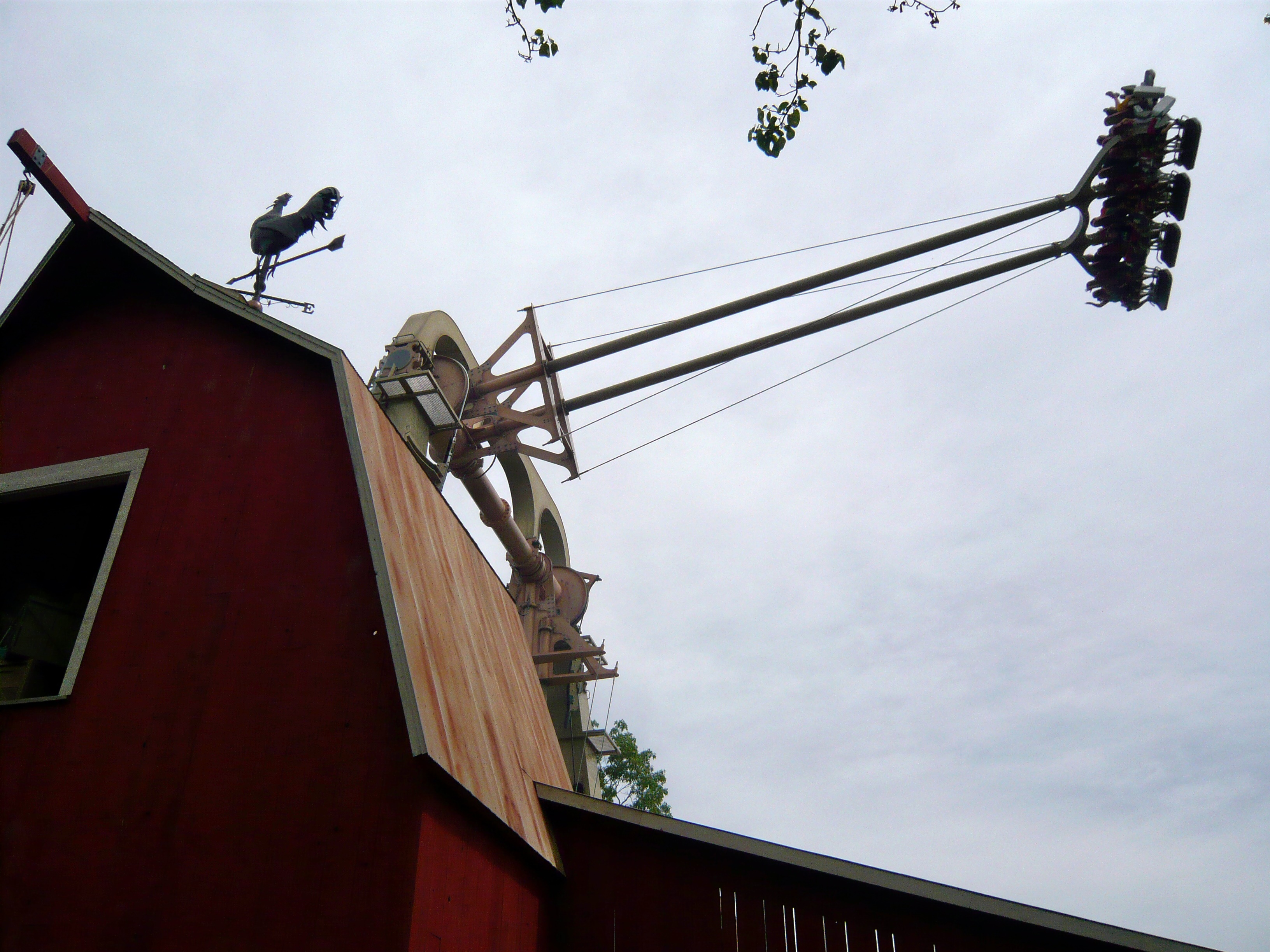 Beim Giant Swing angekommen konnten wir trotz des Umstands, dass nur eine Seite geöffnet war, nach nur einem Zyklus Platz nehmen und uns herrlich durch die Lüfte schleudern lassen. Auffallend war hier ähnlich wie beim Barnstormer in Dollywood die schöne Scheunengestaltung, die vor allem auf den Aussensitzen schöne Near-Misses hervorbringt. Eine weitere Gemeinsamkeit: das "Cousin Elmer Vegetables"-Themeing-Werbeschild, das man in Dollywood absolut identisch vorfindet.