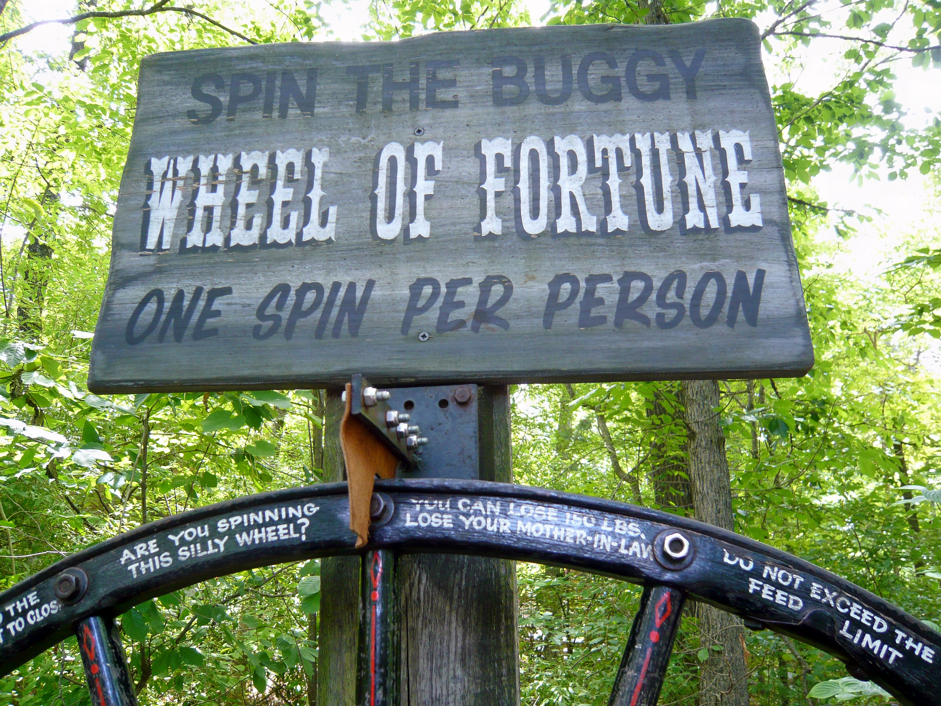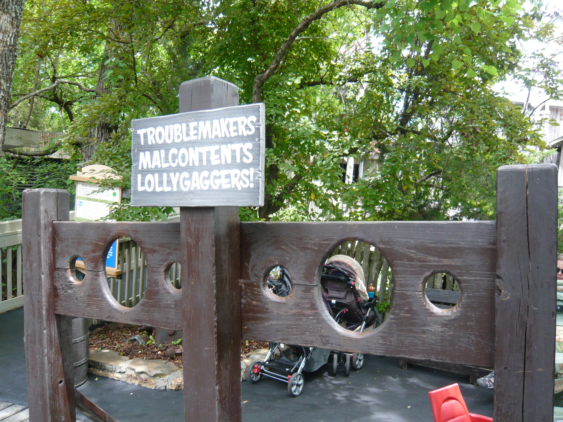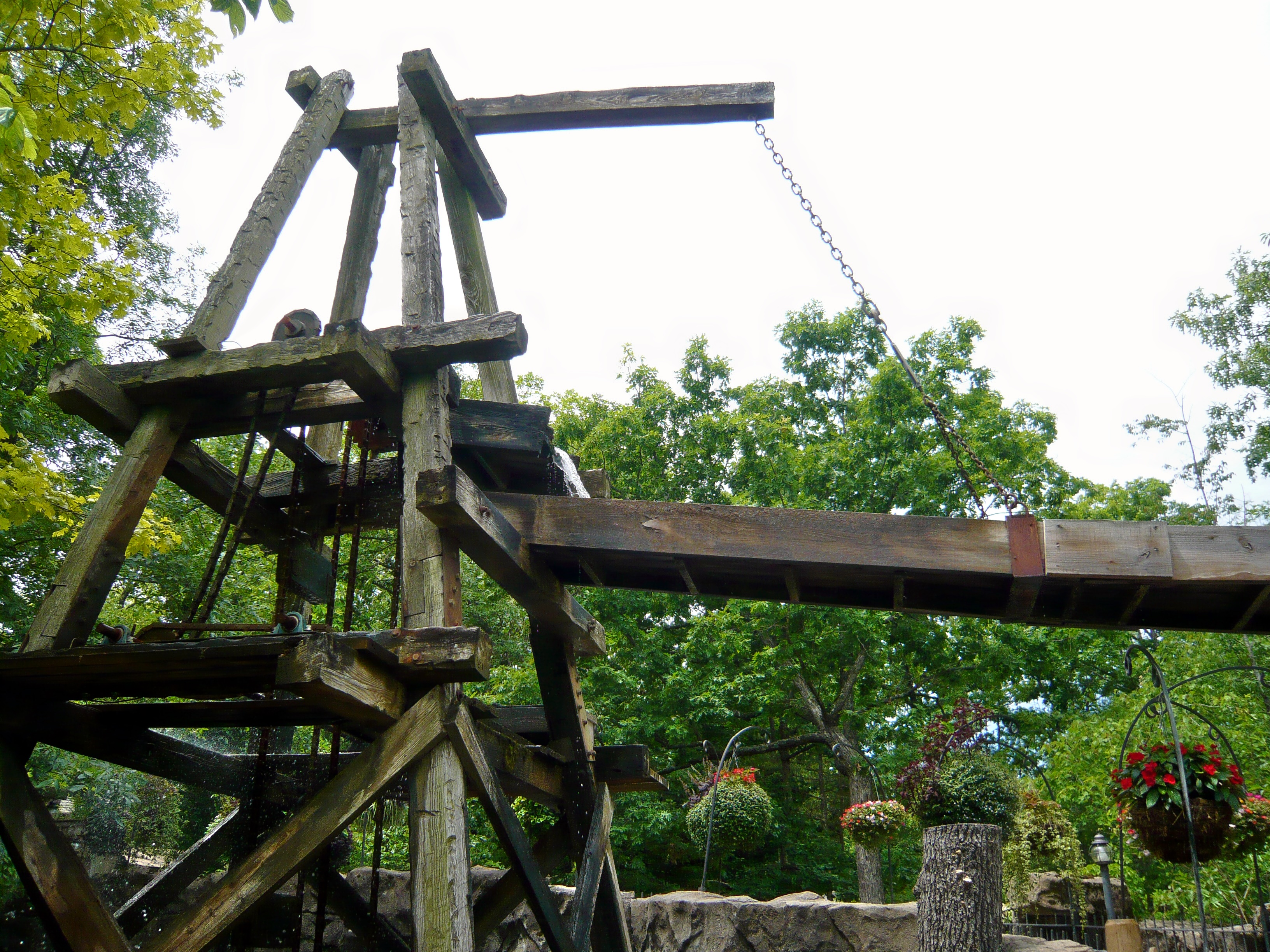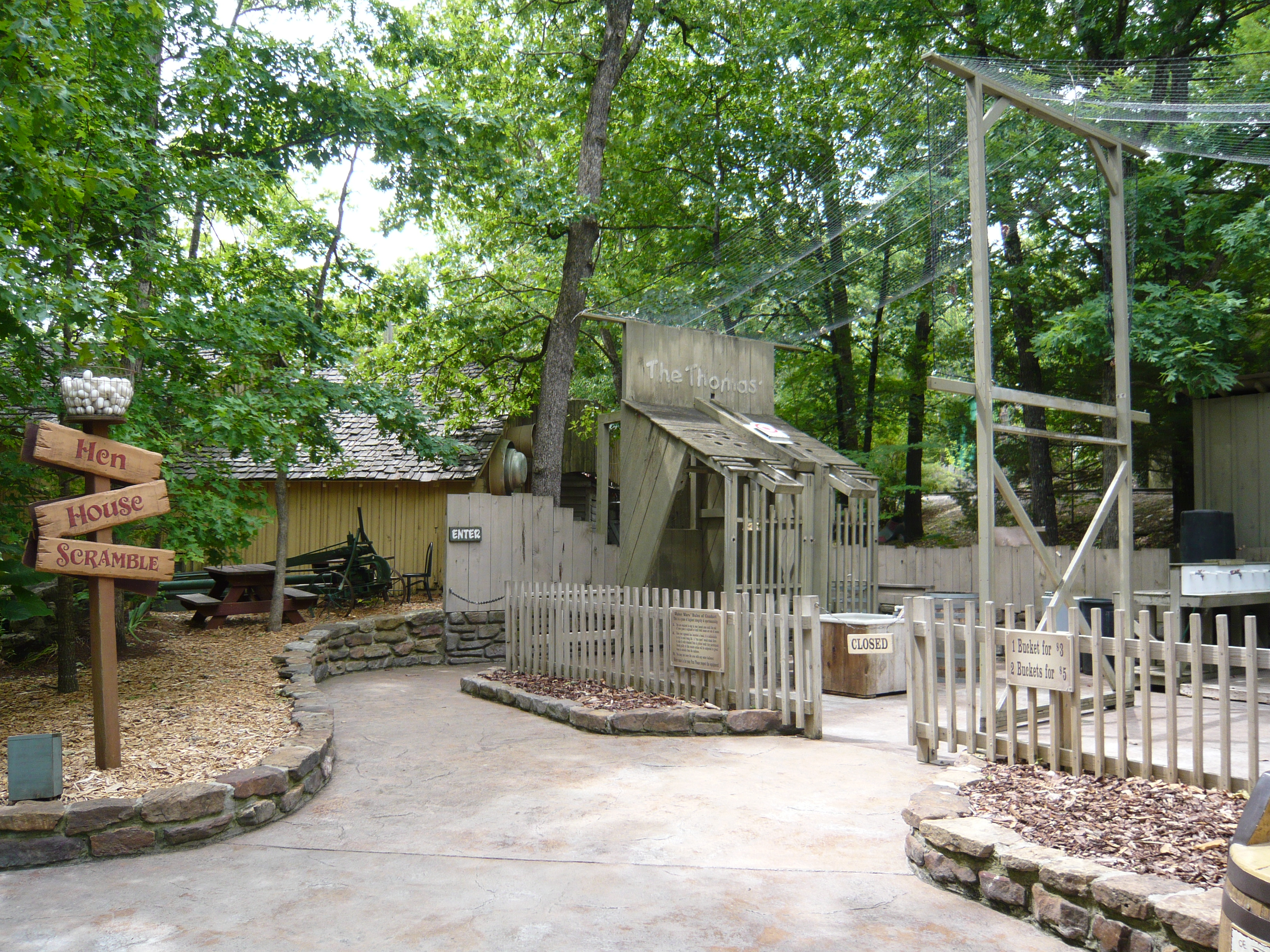 In dieser Parkecke gibt es ausserdem zwei ausgesprochen erheiternde Fundstücke, durch die sich Silver Dollar City weiter aus dem üblichen Themenpark-Einheitsbrei hervortut. Bei der oben abgebildeten Apparatur handelt es sich um ein Gratis-Spiel, bei dem es gilt, möglichst schnell an einem Rand zu drehen, um mit dem dadurch eingepumpten Wasserschwall Froschfiguren aus Plastik ans andere Ende der Wanne zu befördern! Was für eine lustige Idee - ideal für Familienmitglieder, die vielleicht warten müssen, während die Grossen mit dem Giant Swing fahren.