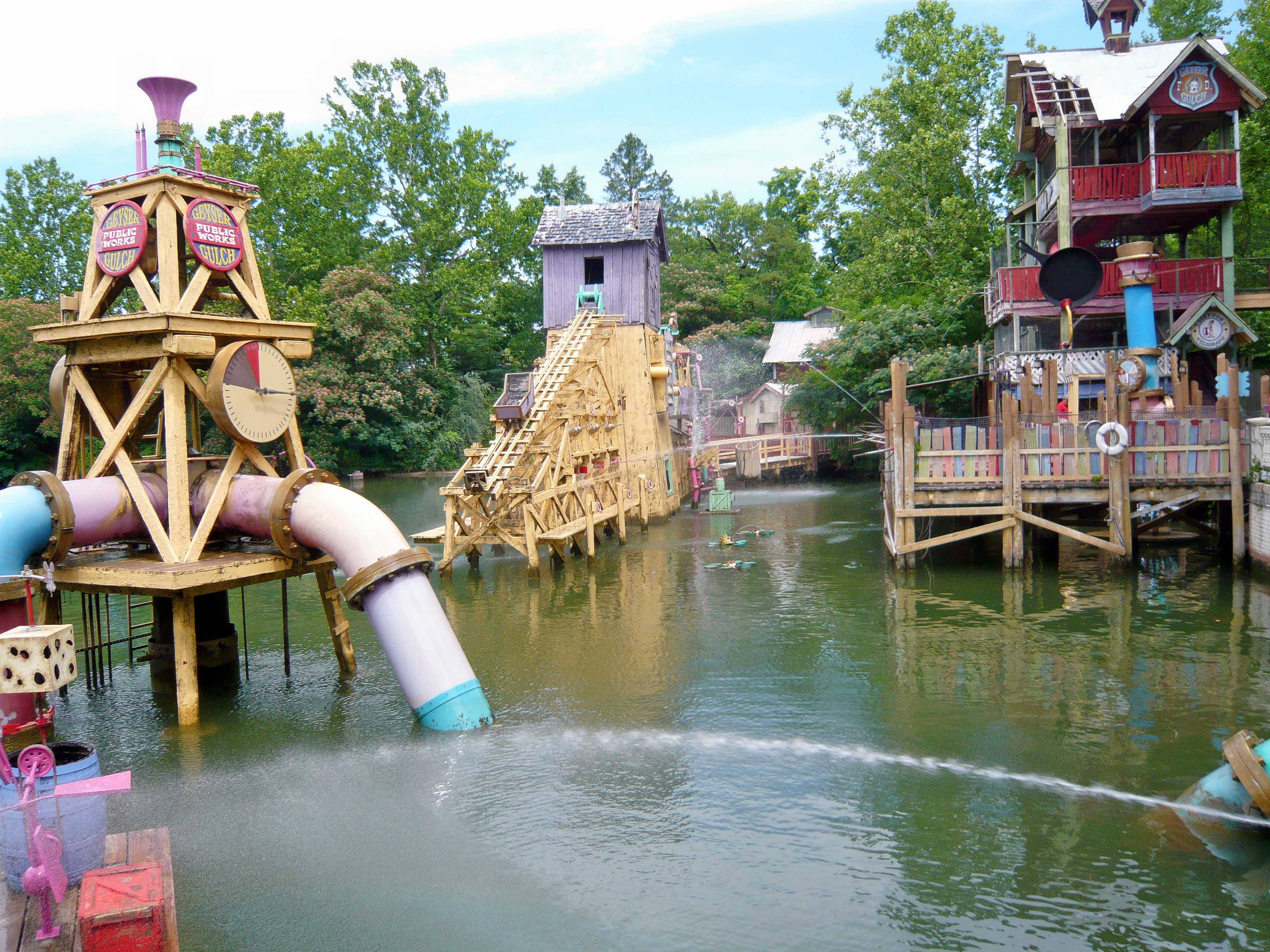 Setzt man den Parkrundgang von da aus fort, landet man irgendwann zwangsläufig beim unfassbar witzig gestalteten Wasser-Abenteuerspielplatz Geyser Gulch, der in einer übergrossen, verwinkelten Kletterkonstruktion klassische Spielplatzelemente, Schaukeln, Balancierattraktionen, Wasserkanonen und -spiele jeglicher Couleur zu einem umwerfenden Gesamterlebnis für die kleinen Gäste vereint. Als Kind hätte man mich da wohl kaum wieder wegzerren können.