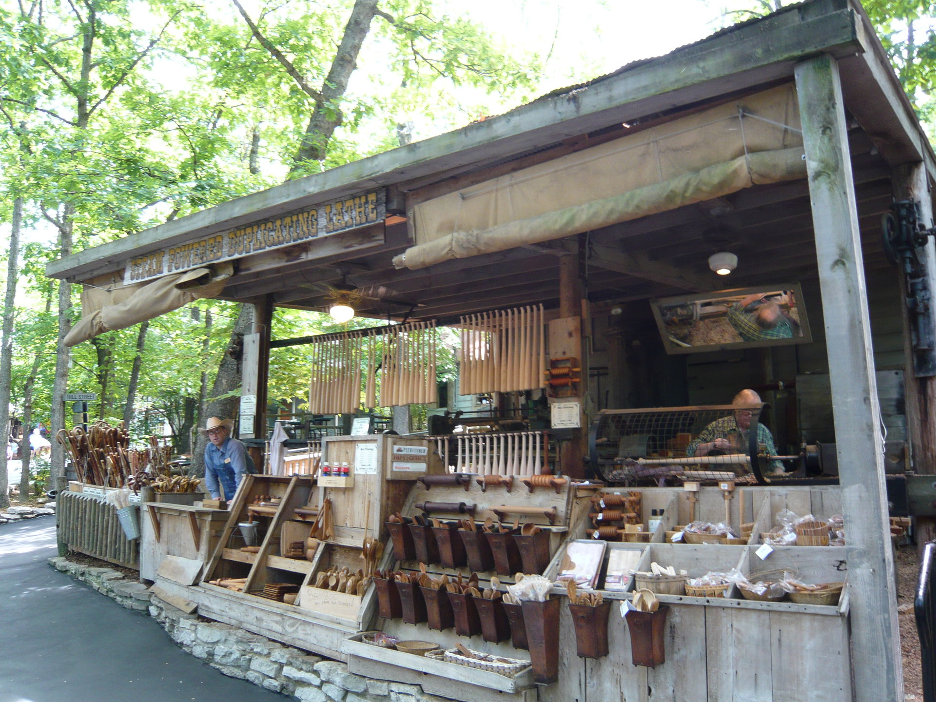 Einer von zwei Standorten im Park, wo man sich personalisierte Sachen aus Holz schnitzen lassen kann - z.B. einen Spazierstock oder einen Baseballschläger.