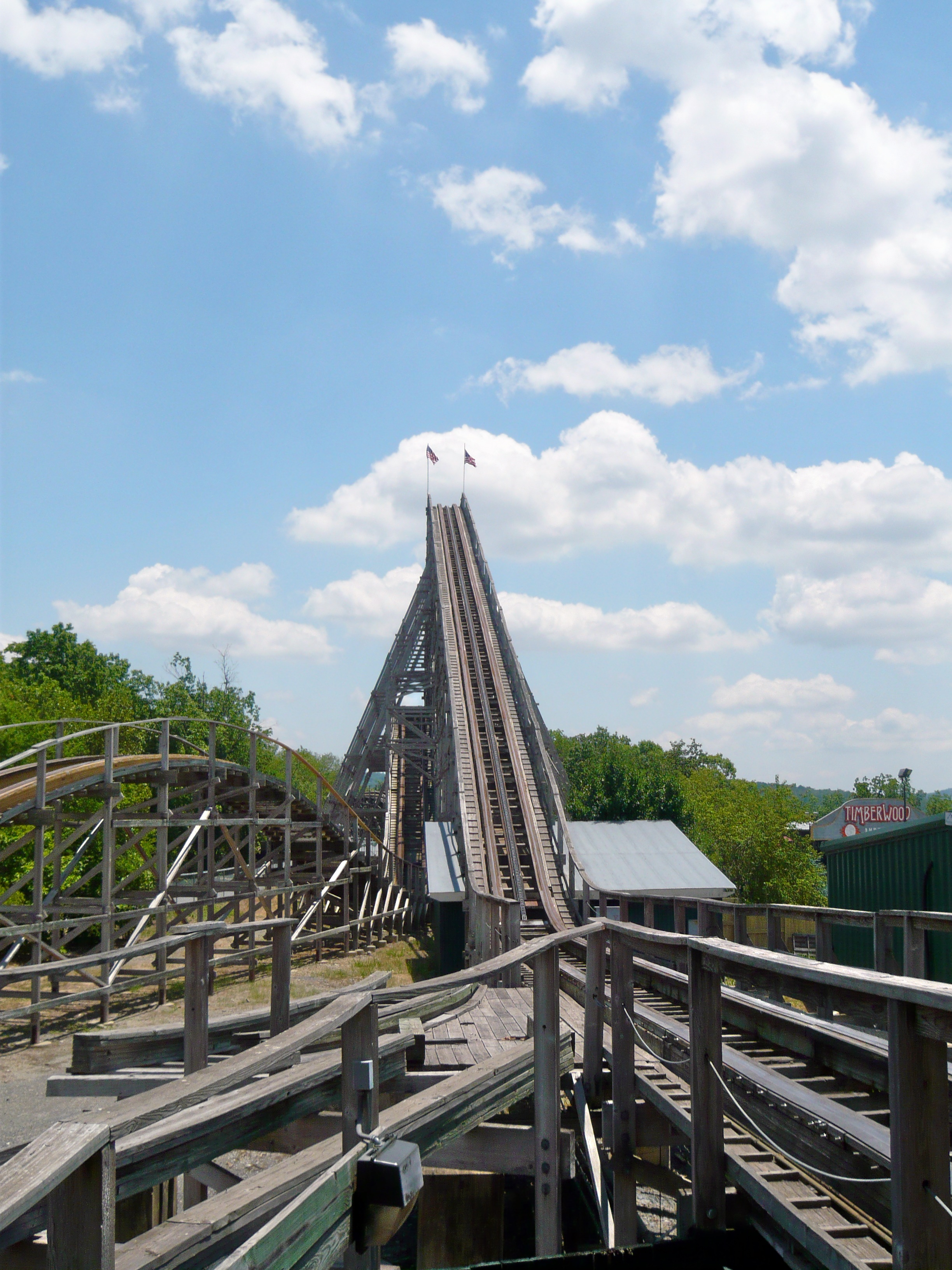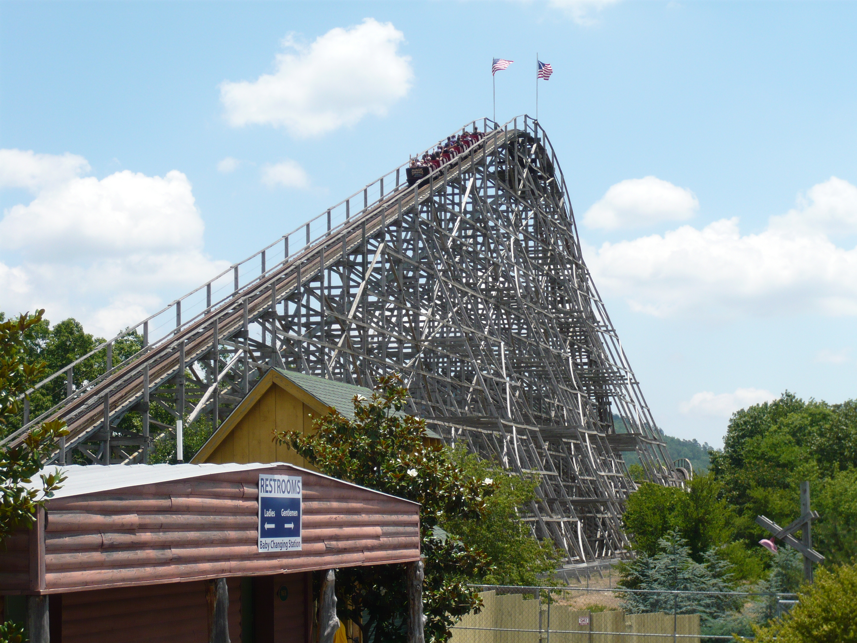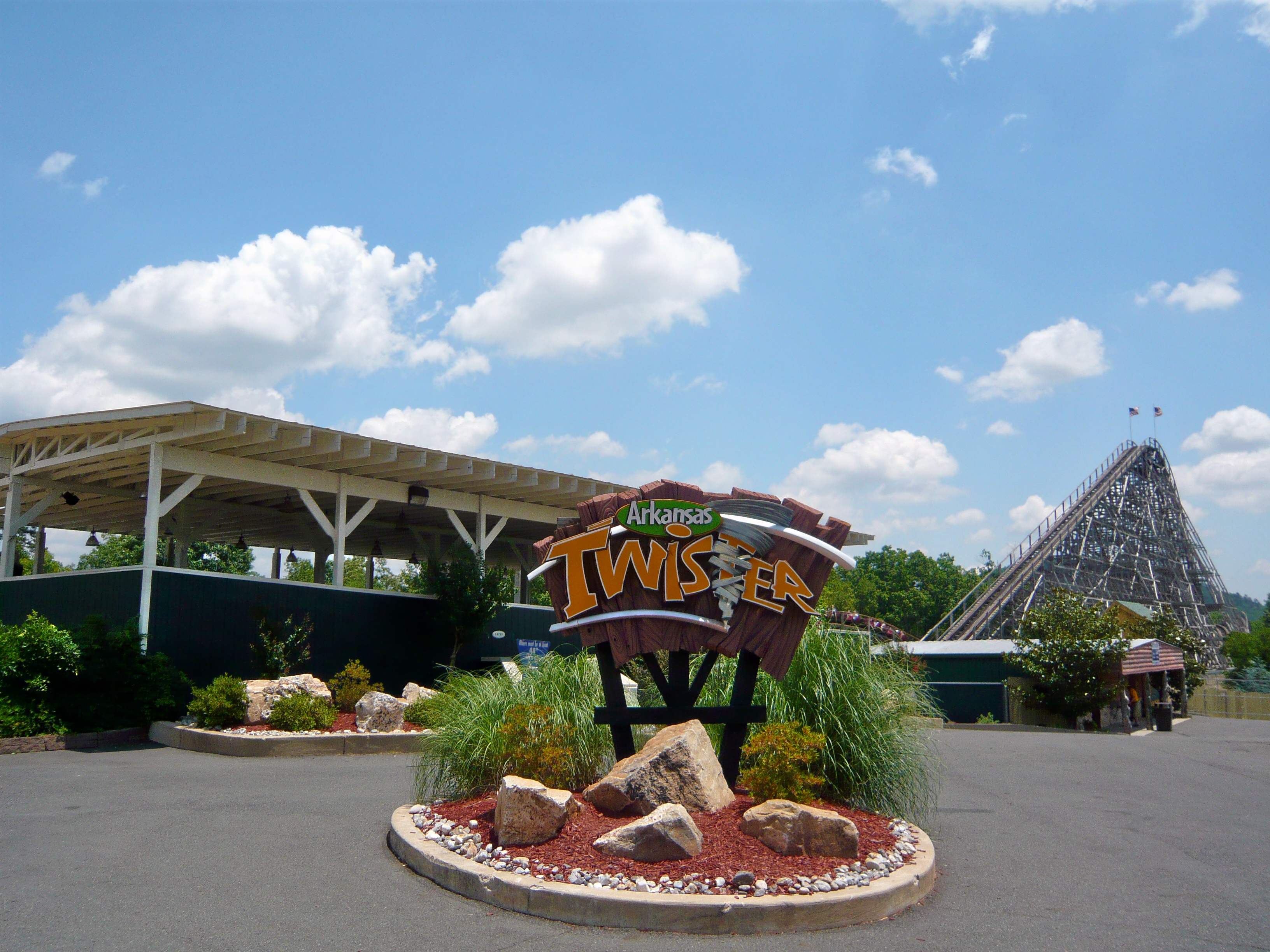 Nach erfolgter Fahrt auf dem X-Coaster spazierten wir also wieder hügelaufwärts in Richtung Parkeingang, machten hierauf einen Abstecher mitten durch den Wasserparkbereich durch und landeten schlussendlich dann beim noch fehlenden Coaster, dem Woodie Arkansas Twister.