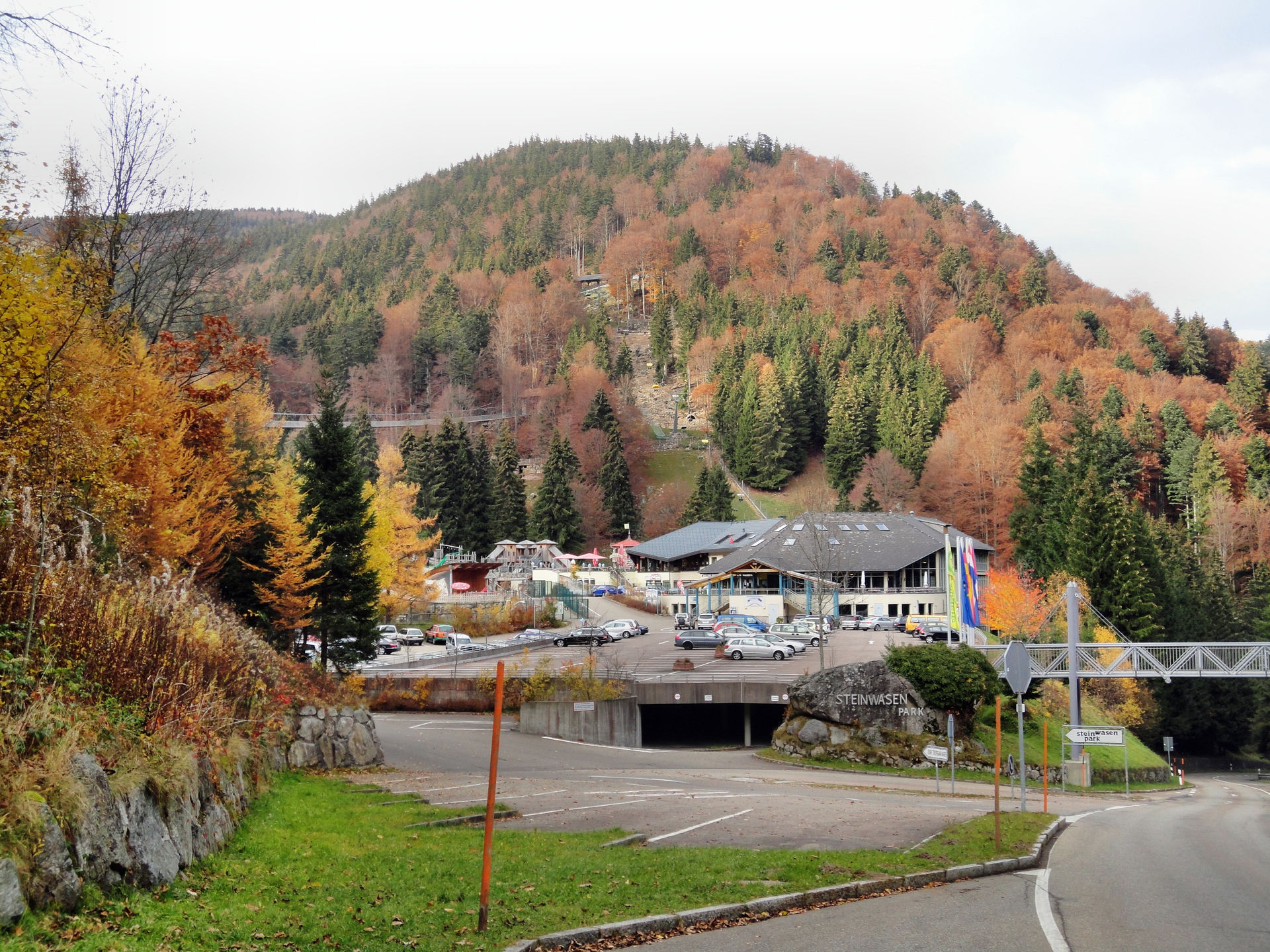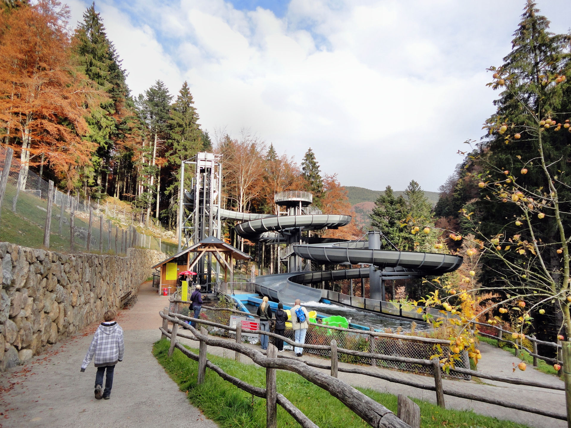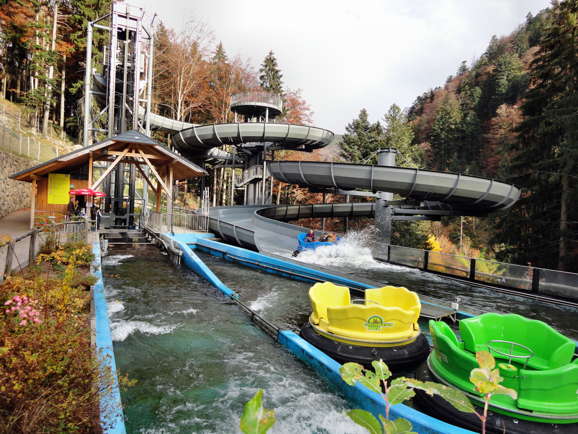 Vom Alpin Coaster in Gutach ging es beim 3.Tag unseres 2011er Europa Park- Halloween Trips weiter in den Steinwasenpark. Nachdem der Bus direkt vor dem Eingang hielt, suchten wir kurz den Eingang in den Park. Mit etwas Verzögerung fanden wir diesen am Restaurant, auf der Vorderseite des Hauptgebäudes. Dieses Gebäude beinhaltet im oberen Bereich, neben dem erwähnten Restaurant auch mehrere Märchen und Miniaturausstellungskästen. Eine kleinere Themenfahrt und ein Kino. Ebenfalls gelangt man von hier in die so genannte Eishöhle von wo man Einblicke in die Achterbahn und Bobkartbahn im Keller des Gebäudes bekam. Nachdem wir im Außenbereich eine kleine Runde durch den Tierpark gemacht haben, ging es um das Gebäude herum und auf der Seite des Raftings hinab. Auch die Station des Sessellifts und der Ausstieg der Rodelbahn befinden sich hier. In der letzten Ecke befindet sich der Eingang für den „Keller“ des Gebäudes, wo man zu den beiden schon erwähnten Attraktionen gelangt. Anschließend ging es noch mal auf kleiner Runde durch den Tierpark und zu dem Darkride im Gebäude ehe uns der Bus über den Notschrei hinab nach Todtnau bringen sollte.