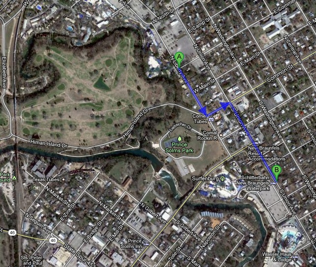 Warum jeder Schlitterbahn-Bericht mit einer Kartendarstellung beginnt? Aufgrund der Tatsache, dass dies quasi Disney World unter den Wasserparks ist! S Das Resort ist von Norden nach Süden betrachtet aus den Einzelbereichen Schlitterbahn West (Punkt A), dem originalen Teil von 1979, und Schlitterbahn East (Punkt B) zusammen gesetzt, der wiederum aus den Einzelparks Surfenburg (von 1991) und Blastenhoff (von 1996) besteht. Und weil der ursprüngliche, knapp fünfminütige Fussmarsch über den Parkplatz zwischen Blastenhoff und Surfenburg für manchen Ami eine unüberwindbare Herausforderung darstellte kam 2011 dann noch der "verbindende Themenbereich" mit dem wohlklingenden Namen Tubenbach dazu. S Zwischen Schlitterbahn West und East (also den Punkten A und B auf der Kartendarstellung) liegen etwa acht Strassenblocks und es verkehren parkeigene Shuttlebusse, deren Benutzung im Eintrittspreis inklusive ist.