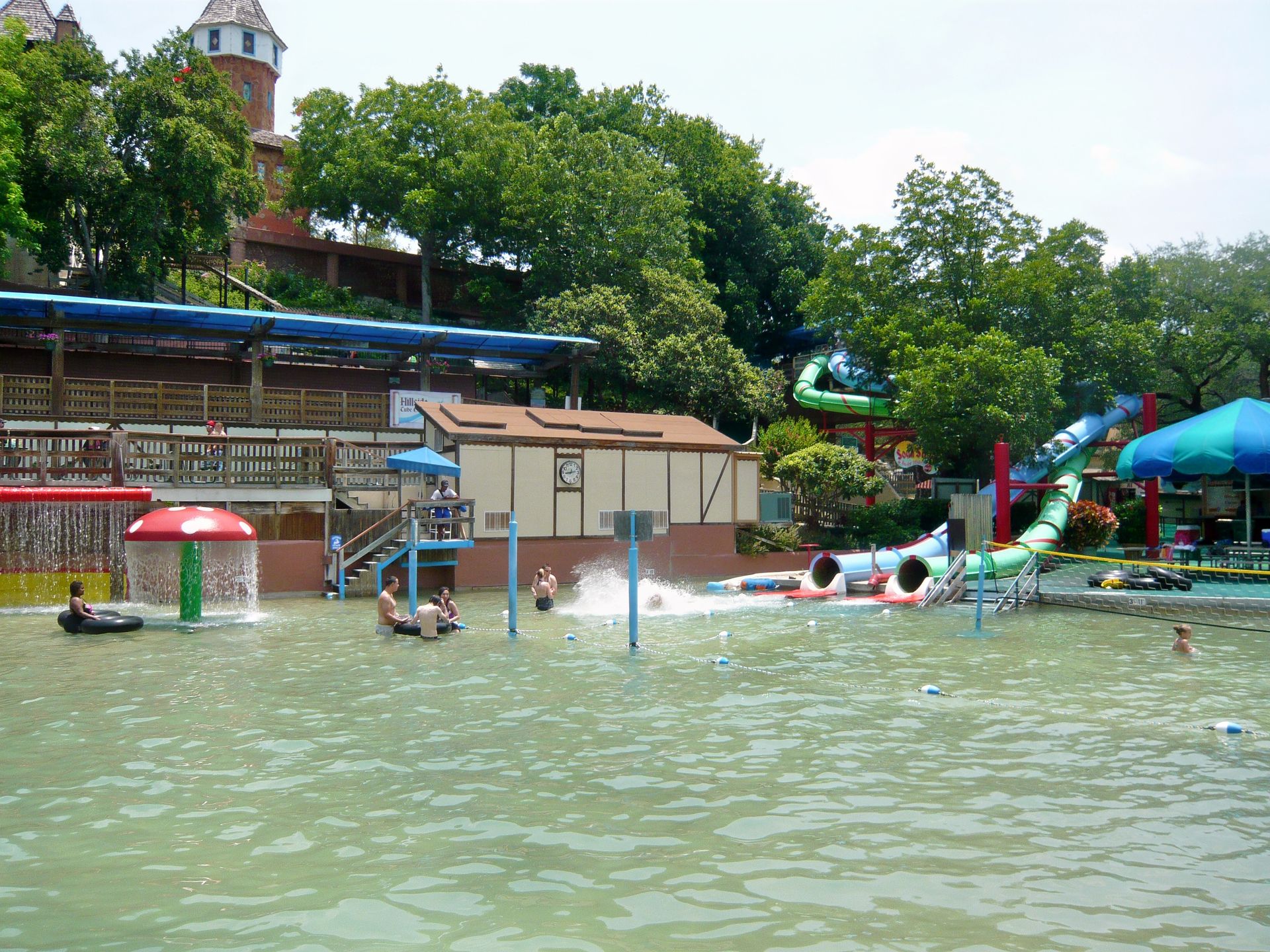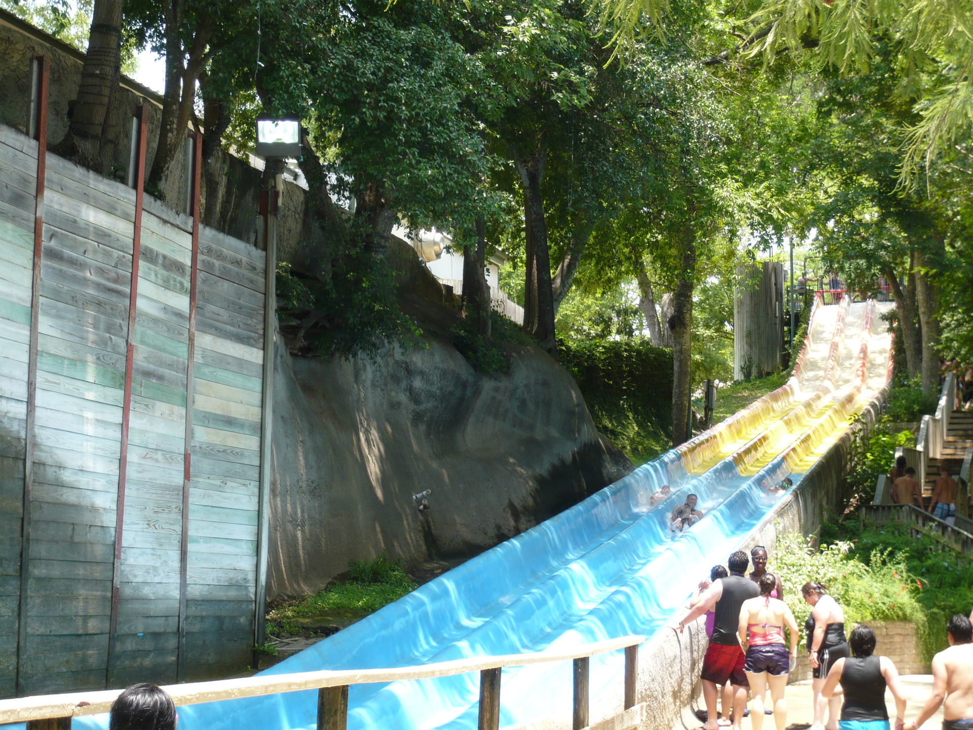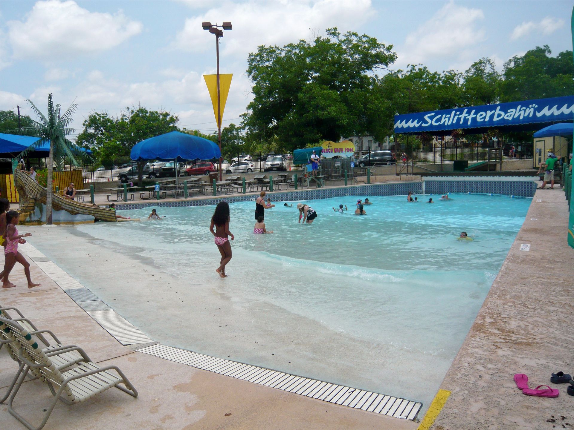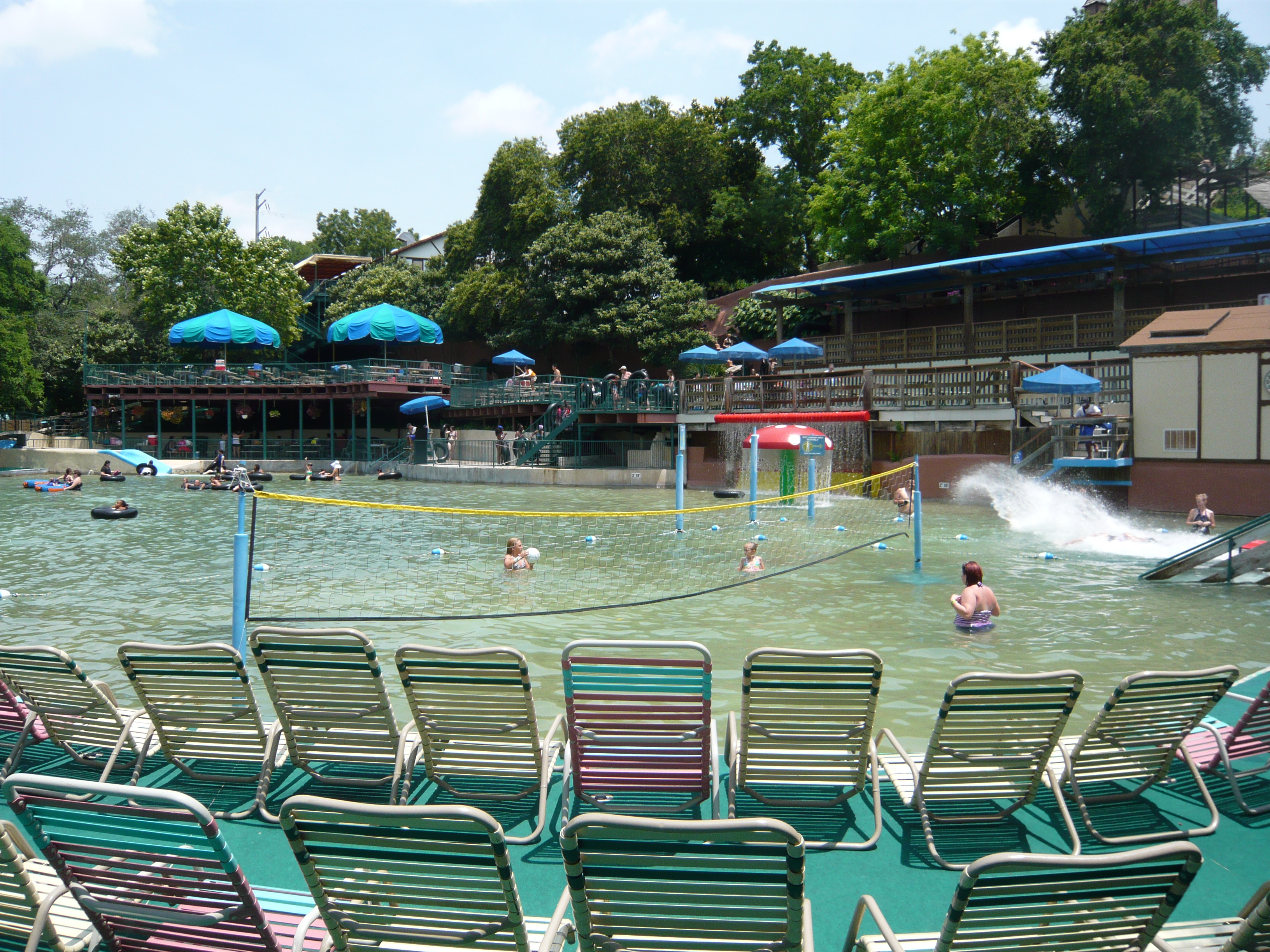 Mit den hangverbauten Holzterrassen im Hintergrund sieht das Ganze irgendwie unheimlich vertraut aus - wie irgendein See-, Fluss- oder Waldbad aus der Heimat. S Nach erstem Annetzen unter den Duschen wagen wir einen ersten Schritt ins Wasser und stellen fest: auch die Wassertemperaturen wurden scheinbar aus dem deutschsprachigen Raum mitgebracht. Das gesamte, riesige Becken und auch ein Grossteil aller Rutschanlagen im Park wird nämlich mit kühlem Flusswasser aus einem Nebenarm des durch New Braunfels fliessenden Comal Rivers gespiesen! Irgendwie herrlich unamerikanisch - und dann gerade auch wieder schon! S An diesem warmen Texas-Frühsommertag jedenfalls eine ausgesprochen willkommene Abkühlung und einfach ein Genuss durch Seltenheitswert! Im und ums Becken selbst gibt es weitläufige Liegezonen, ein paar Wasserballnetze, einen Wasserpilz, Wasserfälle, eine Poolbar und auch zwei Rutschattraktionen münden hier rein. Mit deutscher Pünktlichkeit wurden dann auch alle Rutschen präzise zur eigentlichen Parköffnung in Betrieb genommen, so dass wir erst einmal wieder den Berg hochliefen.