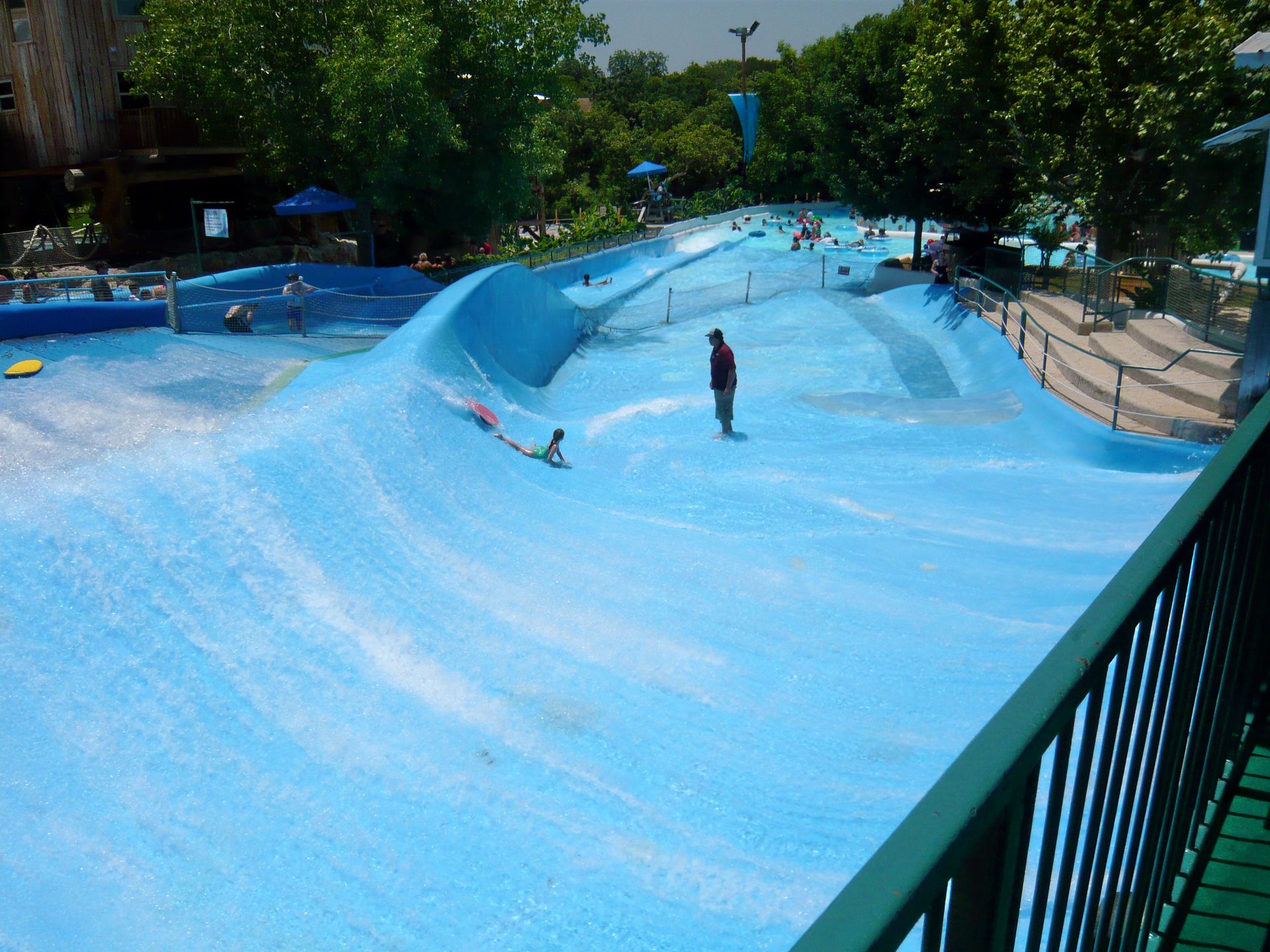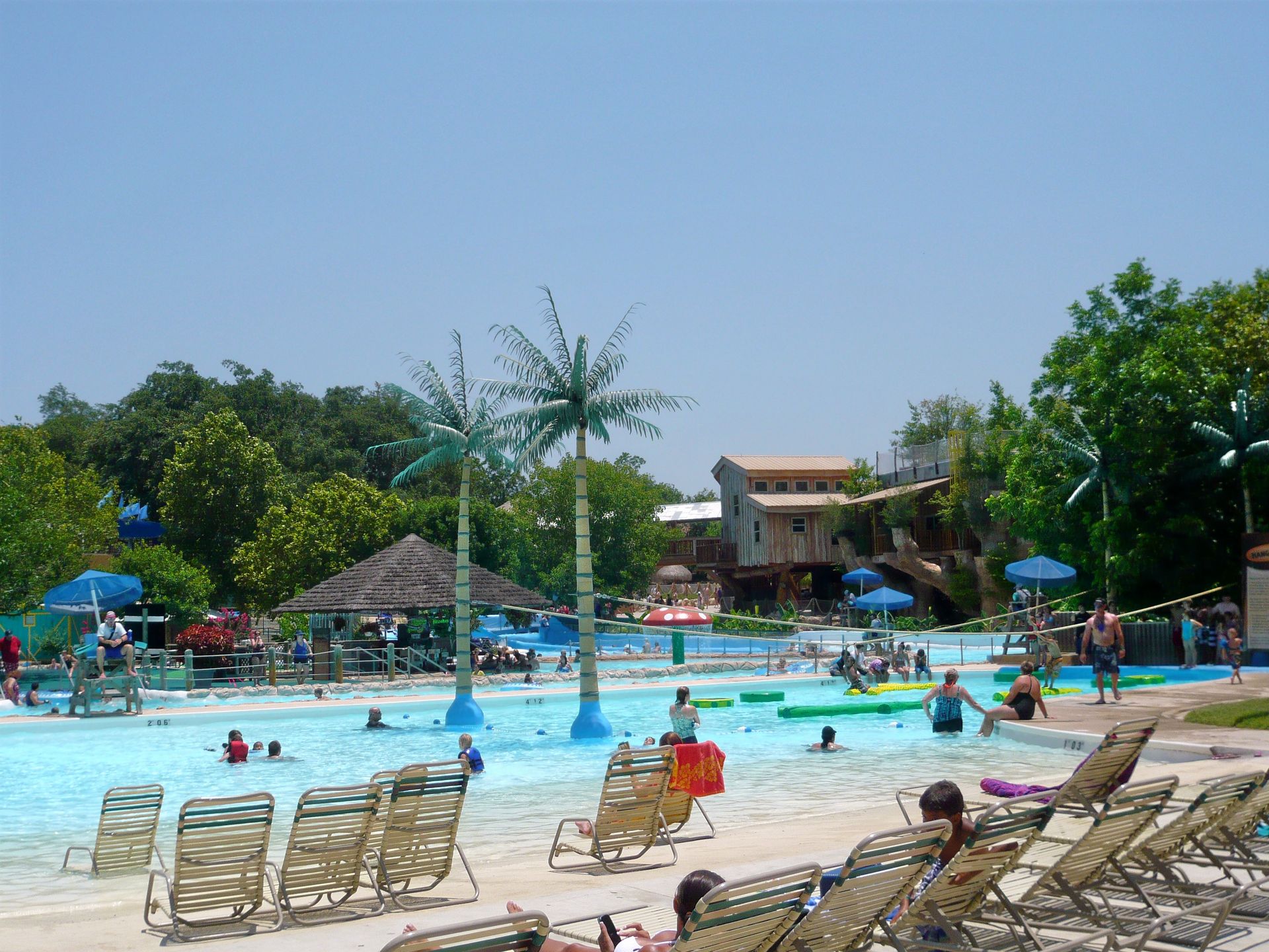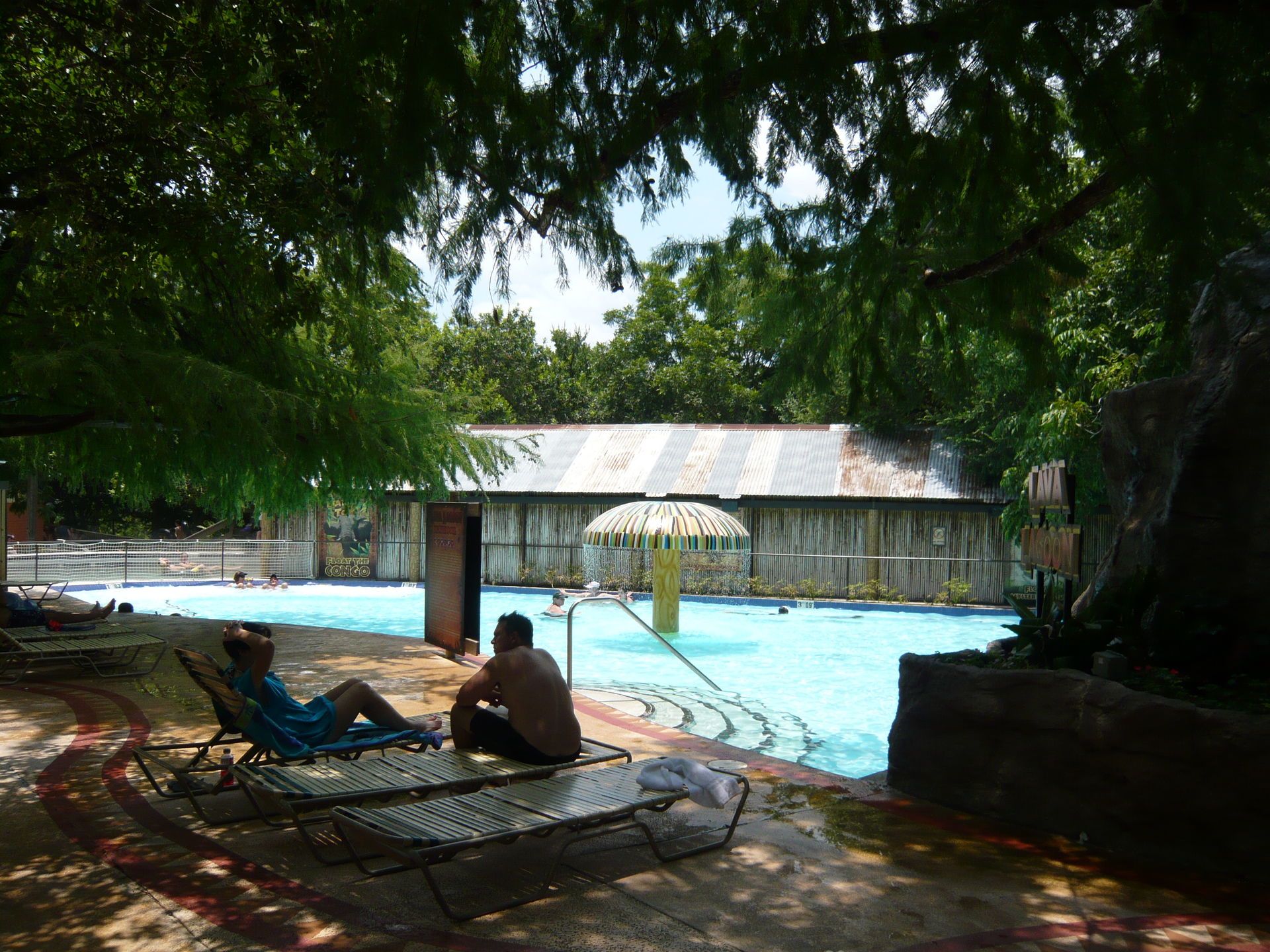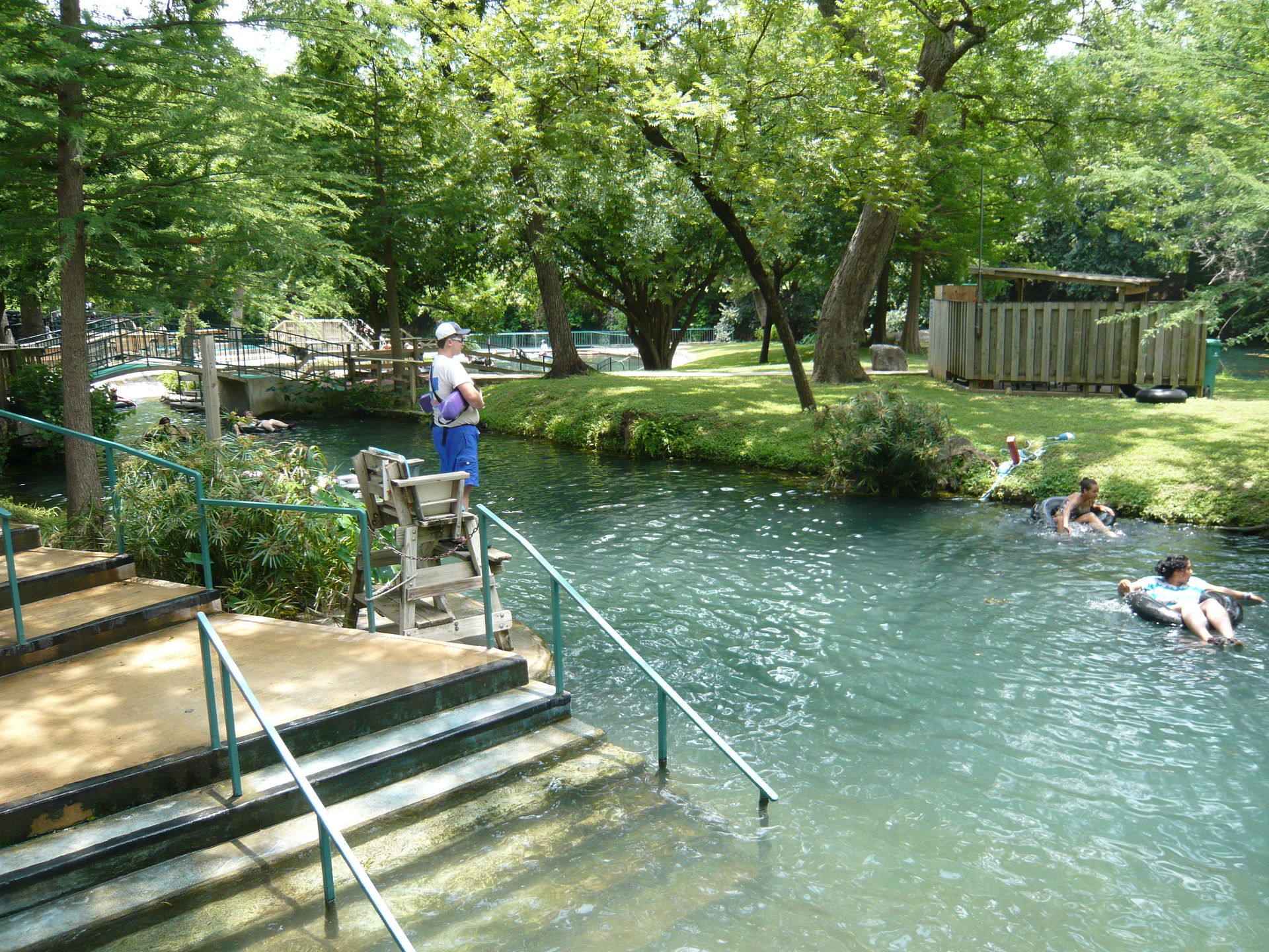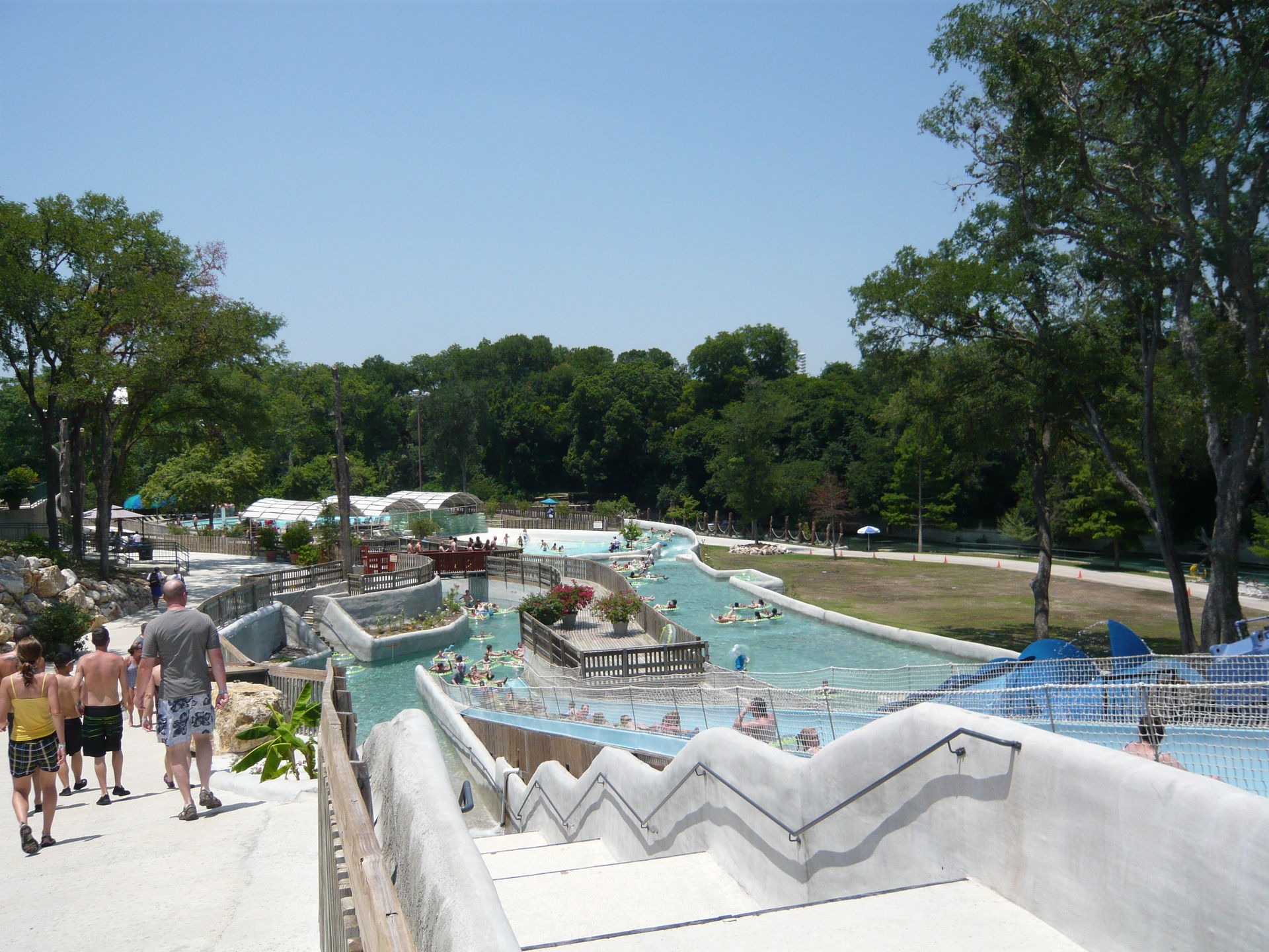 Mit den hangverbauten Holzterrassen im Hintergrund sieht das Ganze irgendwie unheimlich vertraut aus - wie irgendein See-, Fluss- oder Waldbad aus der Heimat. S Nach erstem Annetzen unter den Duschen wagen wir einen ersten Schritt ins Wasser und stellen fest: auch die Wassertemperaturen wurden scheinbar aus dem deutschsprachigen Raum mitgebracht. Das gesamte, riesige Becken und auch ein Grossteil aller Rutschanlagen im Park wird nämlich mit kühlem Flusswasser aus einem Nebenarm des durch New Braunfels fliessenden Comal Rivers gespiesen! Irgendwie herrlich unamerikanisch - und dann gerade auch wieder schon! S An diesem warmen Texas-Frühsommertag jedenfalls eine ausgesprochen willkommene Abkühlung und einfach ein Genuss durch Seltenheitswert! Im und ums Becken selbst gibt es weitläufige Liegezonen, ein paar Wasserballnetze, einen Wasserpilz, Wasserfälle, eine Poolbar und auch zwei Rutschattraktionen münden hier rein. Mit deutscher Pünktlichkeit wurden dann auch alle Rutschen präzise zur eigentlichen Parköffnung in Betrieb genommen, so dass wir erst einmal wieder den Berg hochliefen.