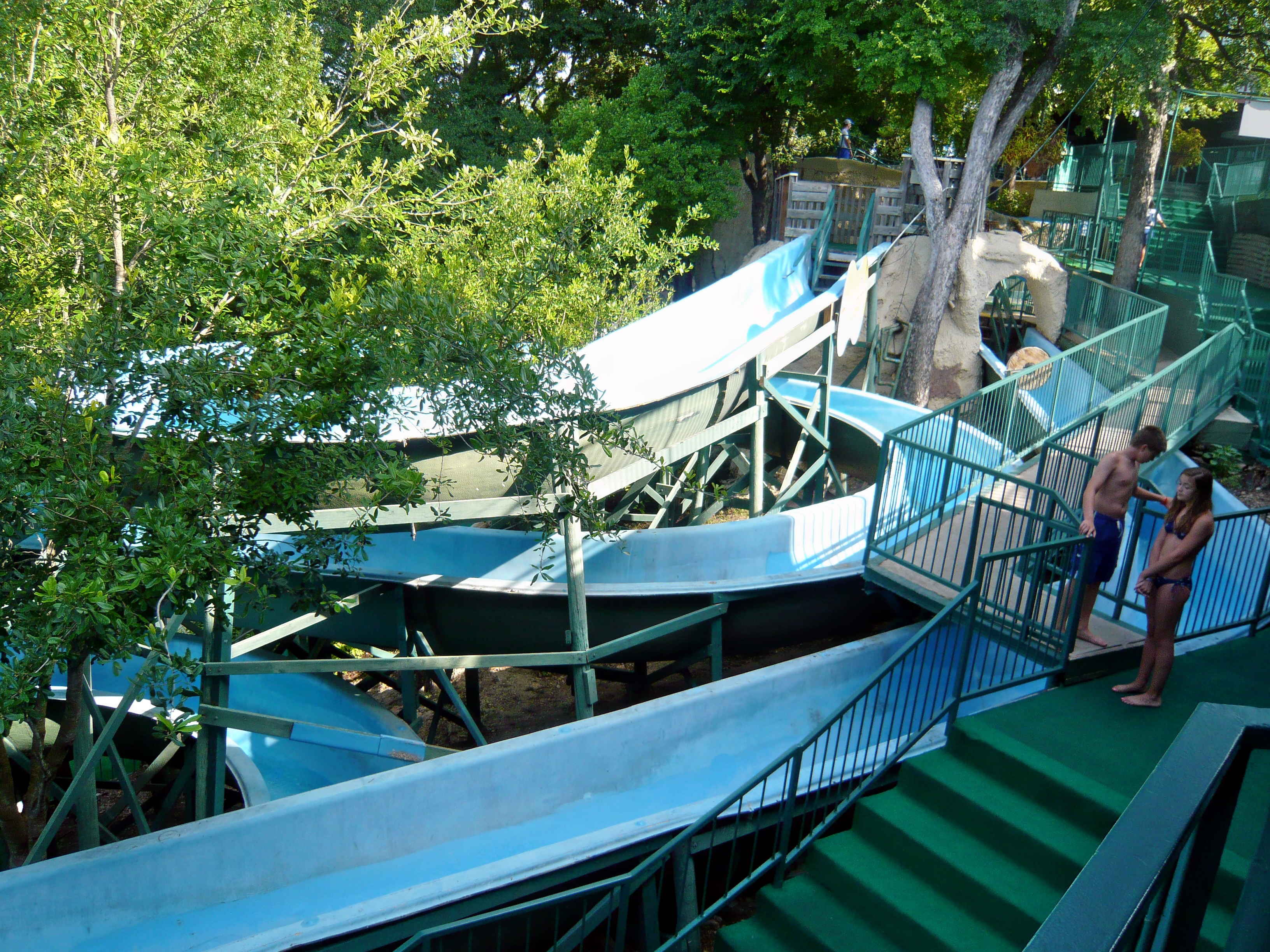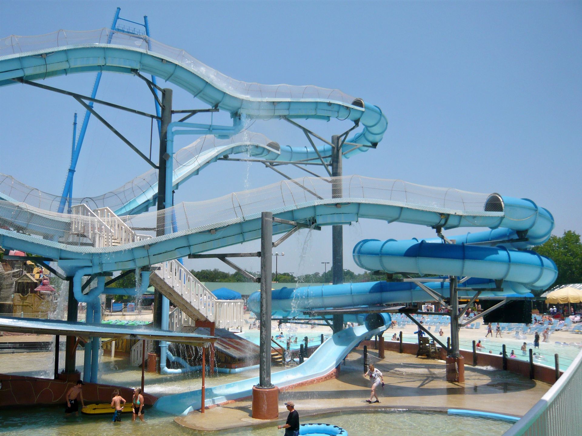 Kleiner Exkurs: Die vier Spuren des Downhill Double Racers sind mehr oder weniger direkt aufs Dach (!) des Eingangsbereichs gebaut und bieten je drei ziemlich heftige Schussfahrten, welche die kopfvoran auf Matten rutschenden Badegäste durchaus flott abheben lassen. Fazit nach drei über den Tag verteilten Rutschpartien: Diese Rutschen sind nicht herrenfreundlich und texanische Kinder sind wirklich doof genug, ihre Matte einfach in der Schlusswanne liegen zu lassen. Fail! S