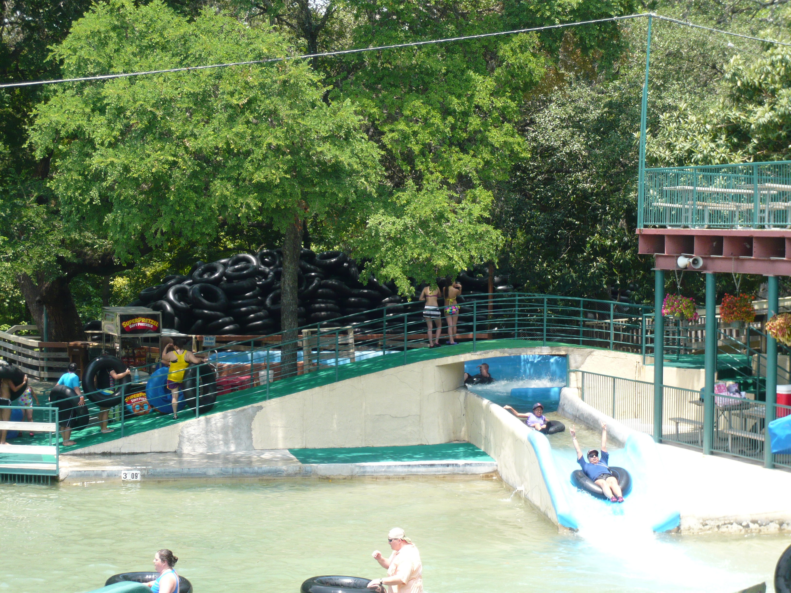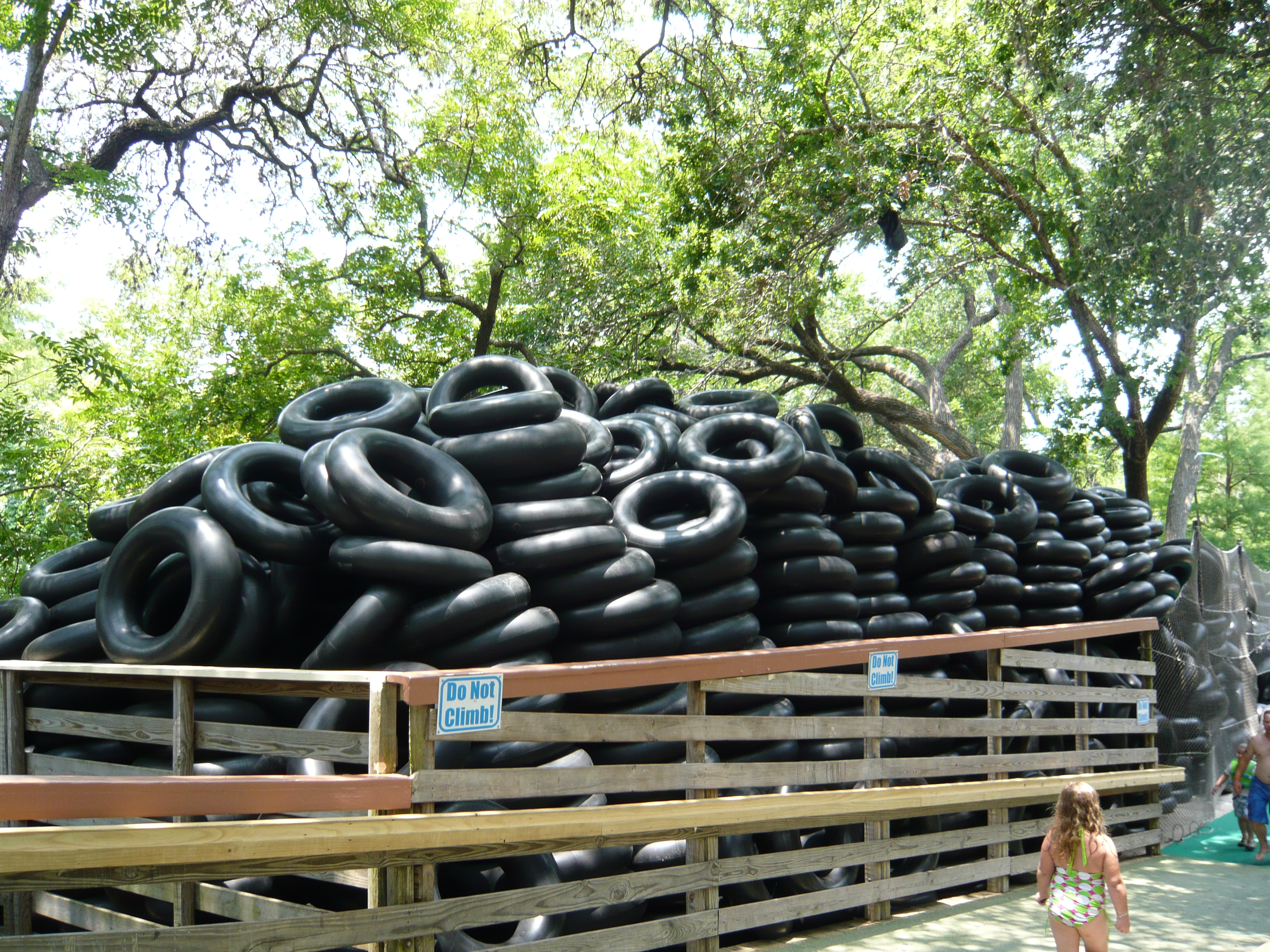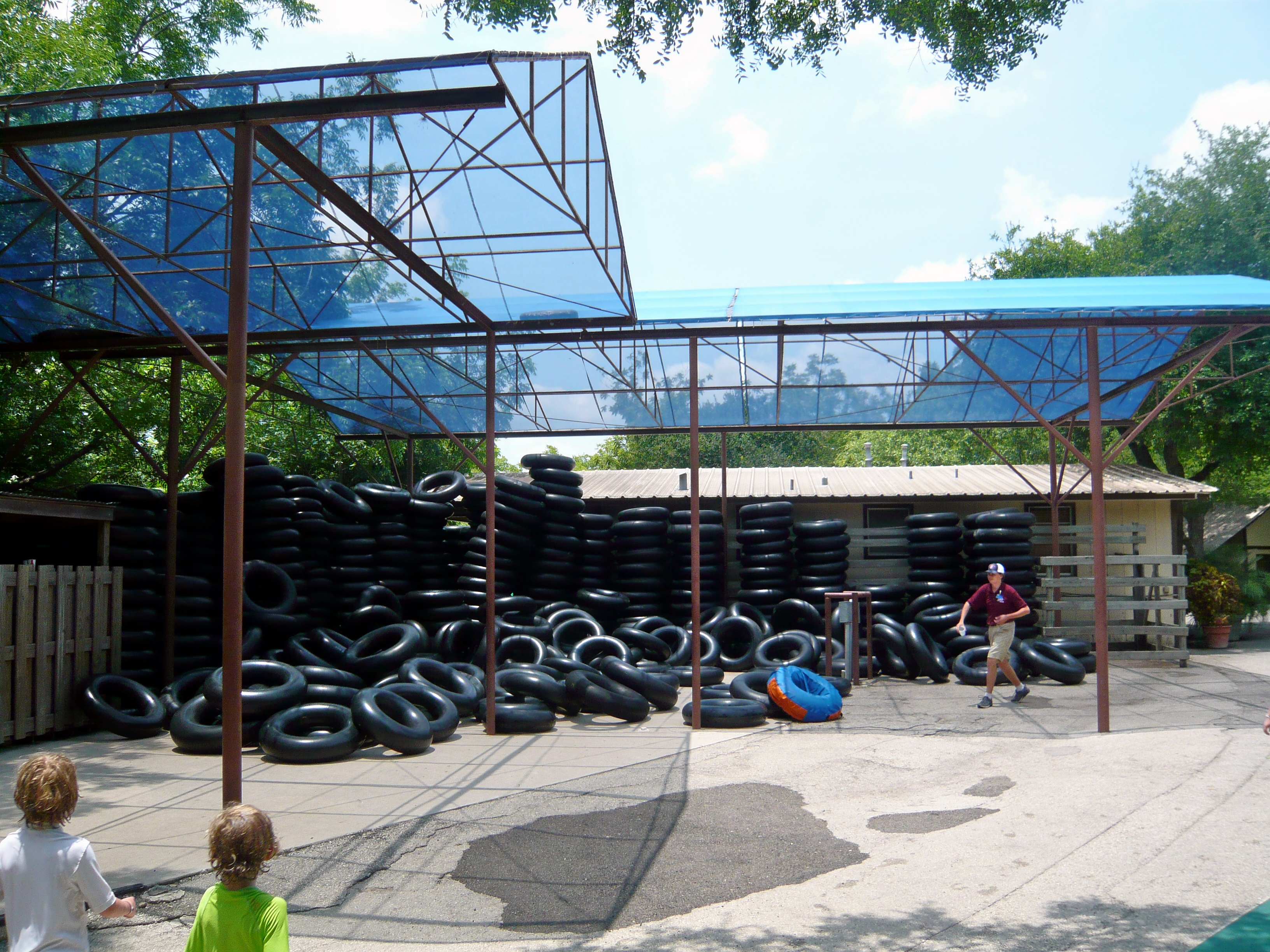 Jetzt galt es, sich einen von gefühlten 100'000 Rutschreifen zu schnappen, die im ganzen Park verteilt auf gigantischen Stapeln bereitliegen. Den gesamten Tag über wurden sie von Hilfskräften eingesammelt und dann per Golfcaddy-Anhängerchen und sogar auf einem Floss auf dem Comal River durchs gesamte Areal kutschiert und wieder verteilt. S Im wortgerechtesten Sinn der amerikanischen Bezeichnung hierfür - inner tubes - handelt es sich bei den hiesigen Exemplaren um wahrhaftige schwarze Innenschläuche von Autopneus. Einfach nur super! S