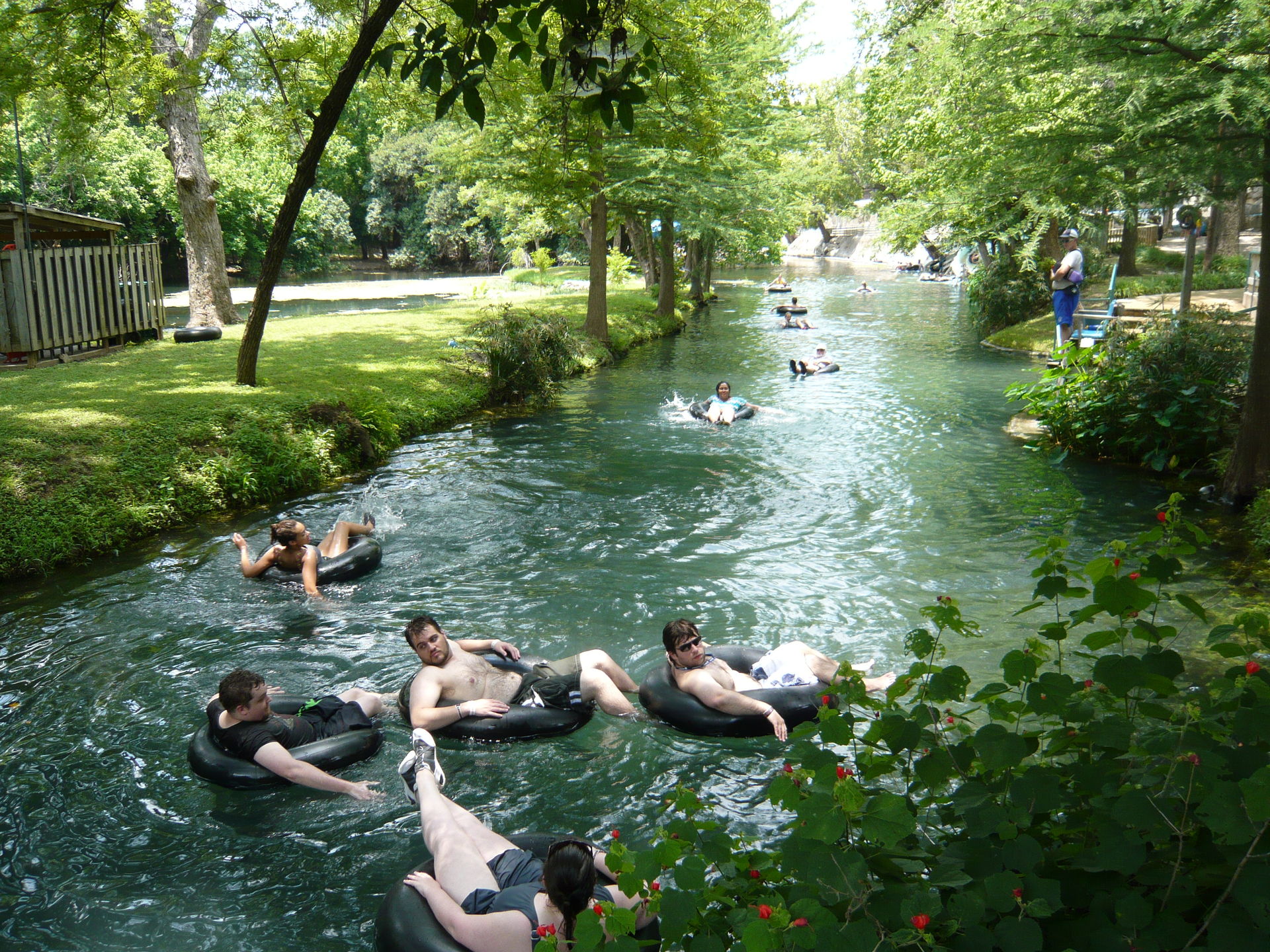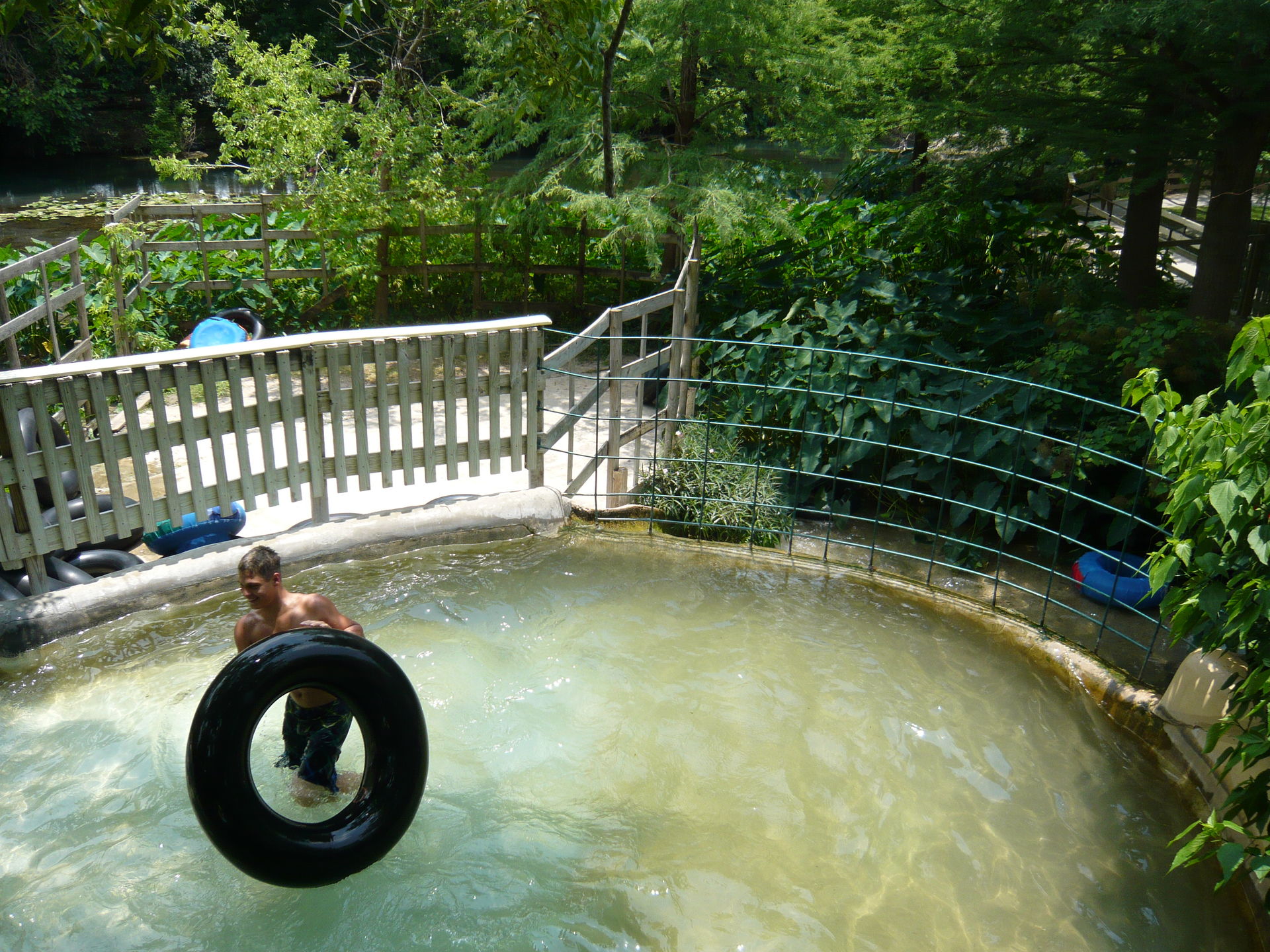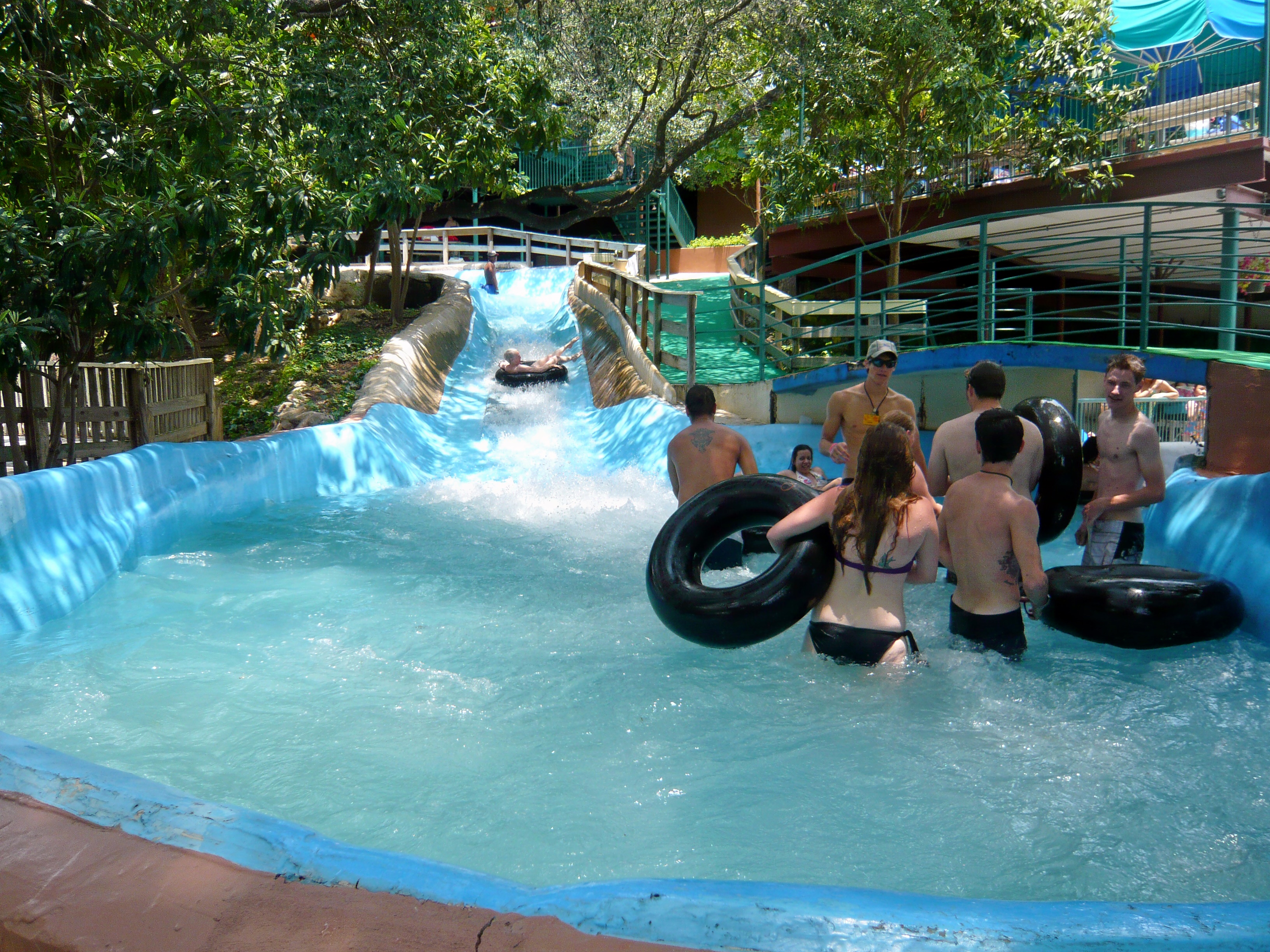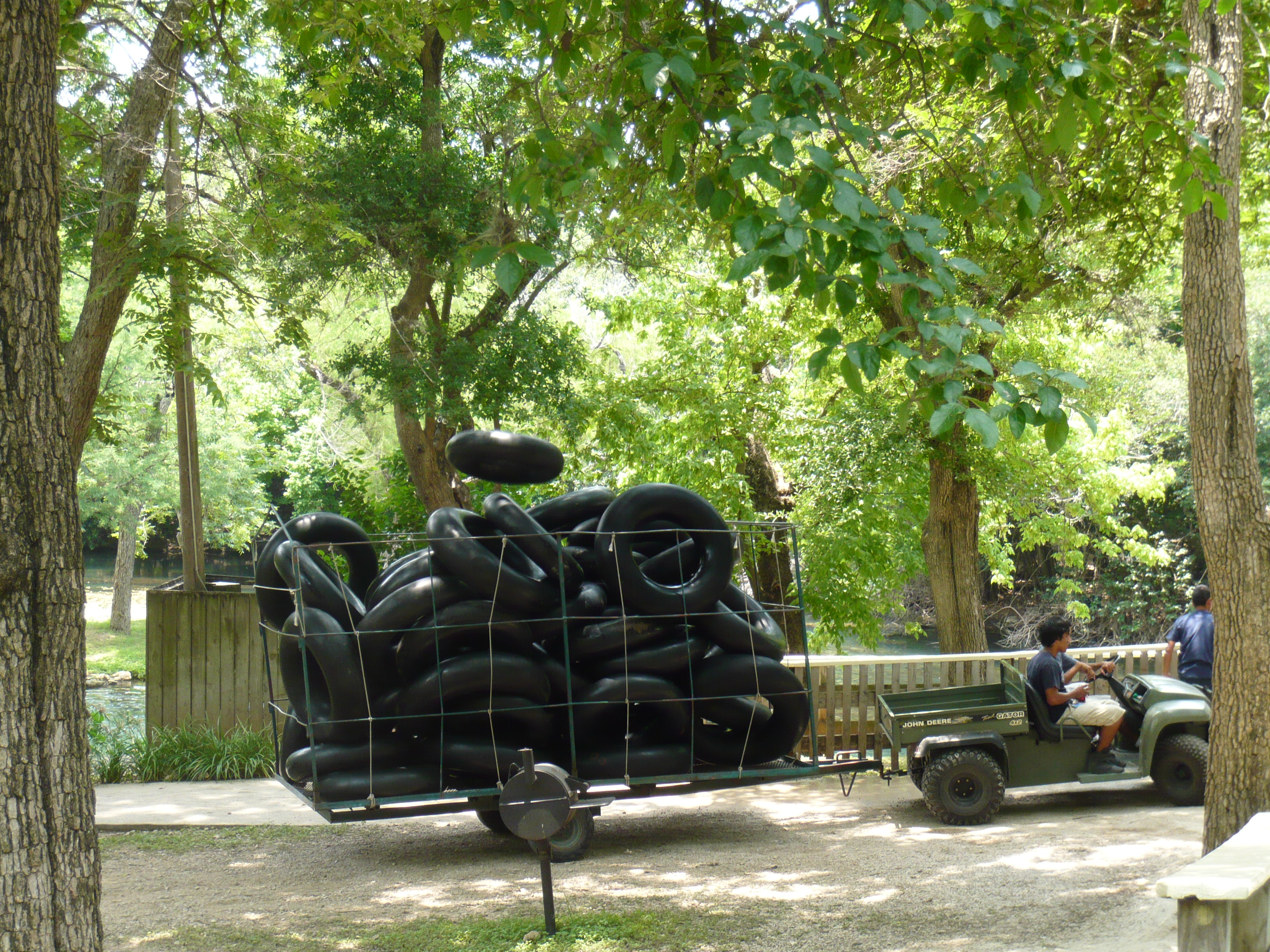 Jetzt galt es, sich einen von gefühlten 100'000 Rutschreifen zu schnappen, die im ganzen Park verteilt auf gigantischen Stapeln bereitliegen. Den gesamten Tag über wurden sie von Hilfskräften eingesammelt und dann per Golfcaddy-Anhängerchen und sogar auf einem Floss auf dem Comal River durchs gesamte Areal kutschiert und wieder verteilt. S Im wortgerechtesten Sinn der amerikanischen Bezeichnung hierfür - inner tubes - handelt es sich bei den hiesigen Exemplaren um wahrhaftige schwarze Innenschläuche von Autopneus. Einfach nur super! S