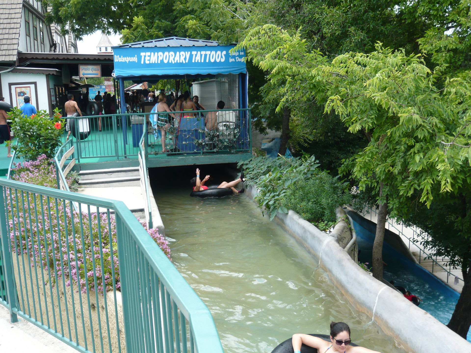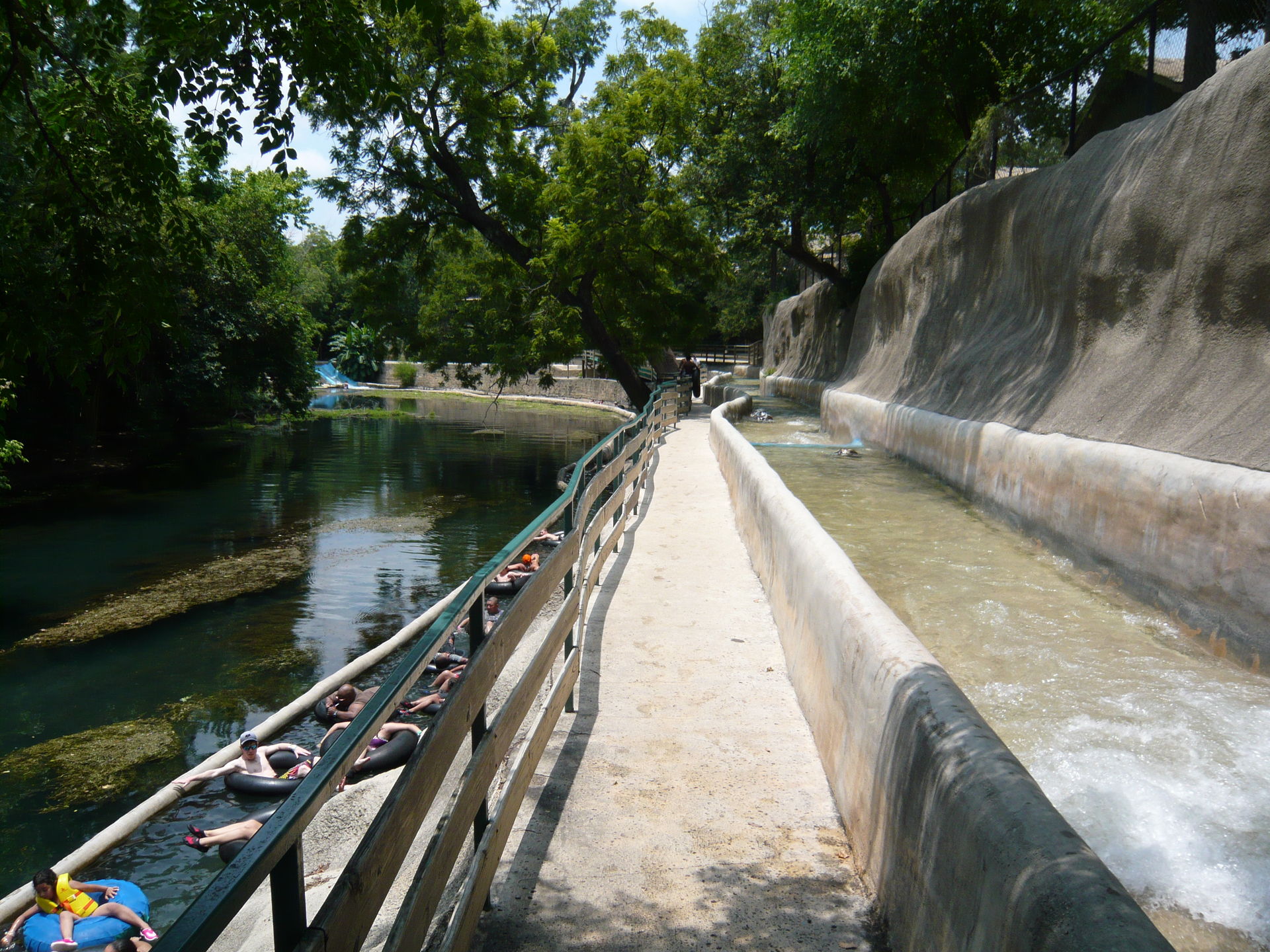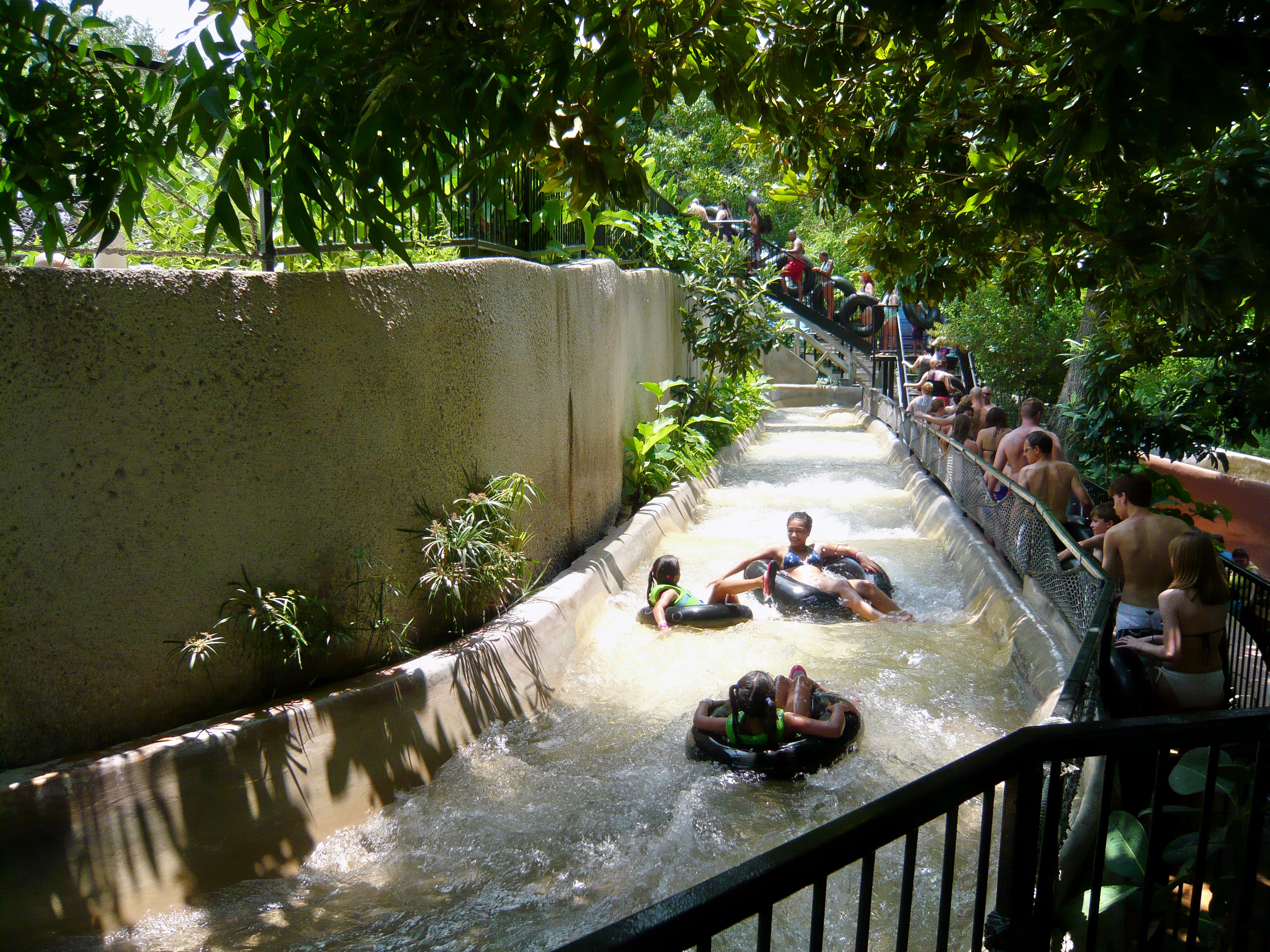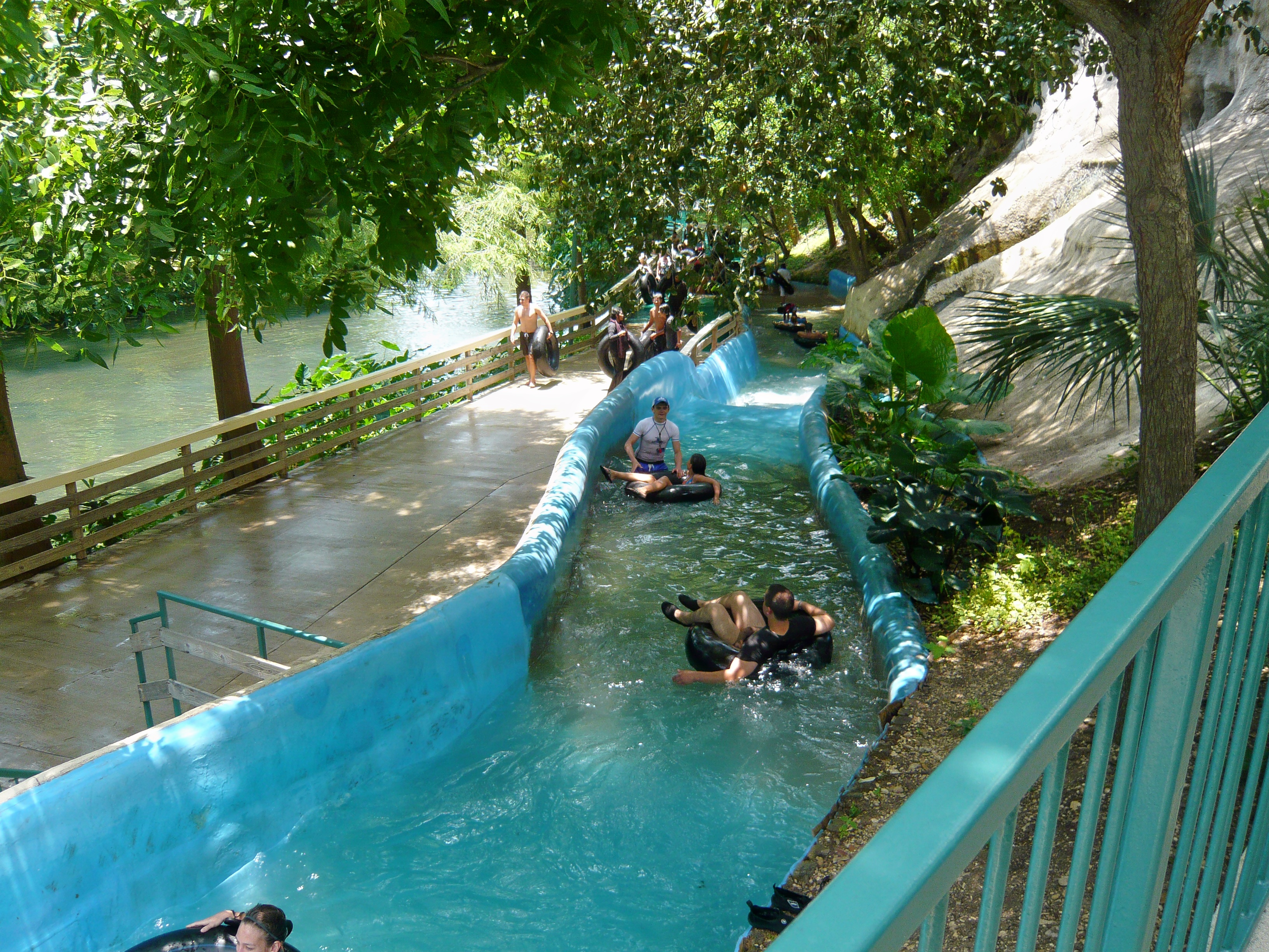 Die River Tube Chute - nicht zu verwechseln mit der Raging River Tube Chute - hat eigentlich nur sehr wenig Ähnlichkeit mit den anderen Tube Chutes im Park. Im wesentlichen besteht sie nämlich aus einer laut Parkangaben etwa 200 Meter langen Treibfahrt durch den friedlichen Seitenarm des Comal Rivers. S