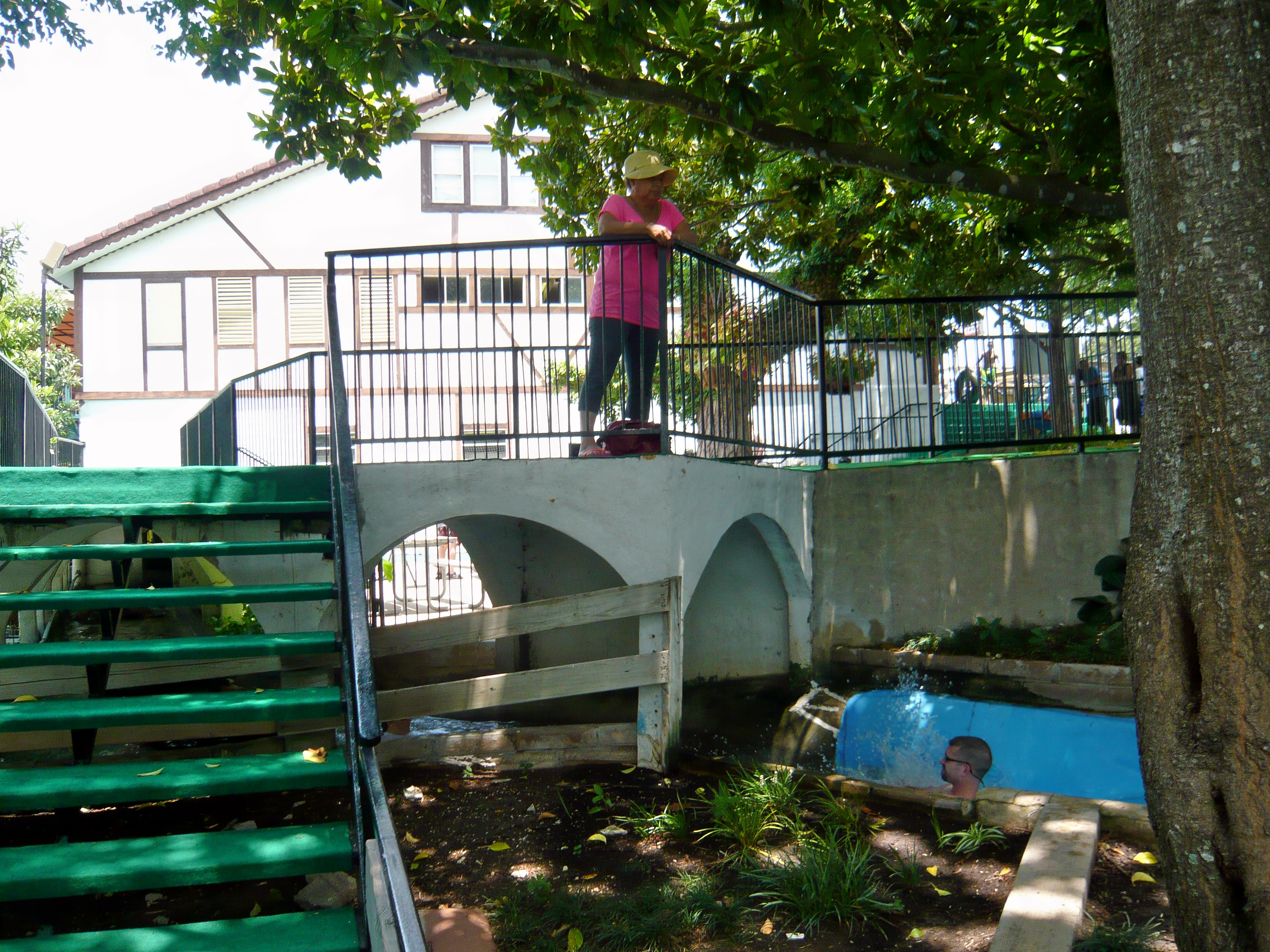 Und hier - man kanns auf dem Bild möglicherweise erahnen - folgt dann mehr oder weniger in völliger Dunkelheit eine ziemlich krasse und bedrohlich rauschende Schussfahrt direkt unter der Zufahrtsstrasse zur Hotelanlage durch. Man beachte: auch hier könnte man ohne weiteres aus dem Parkgelände rausspazieren. S