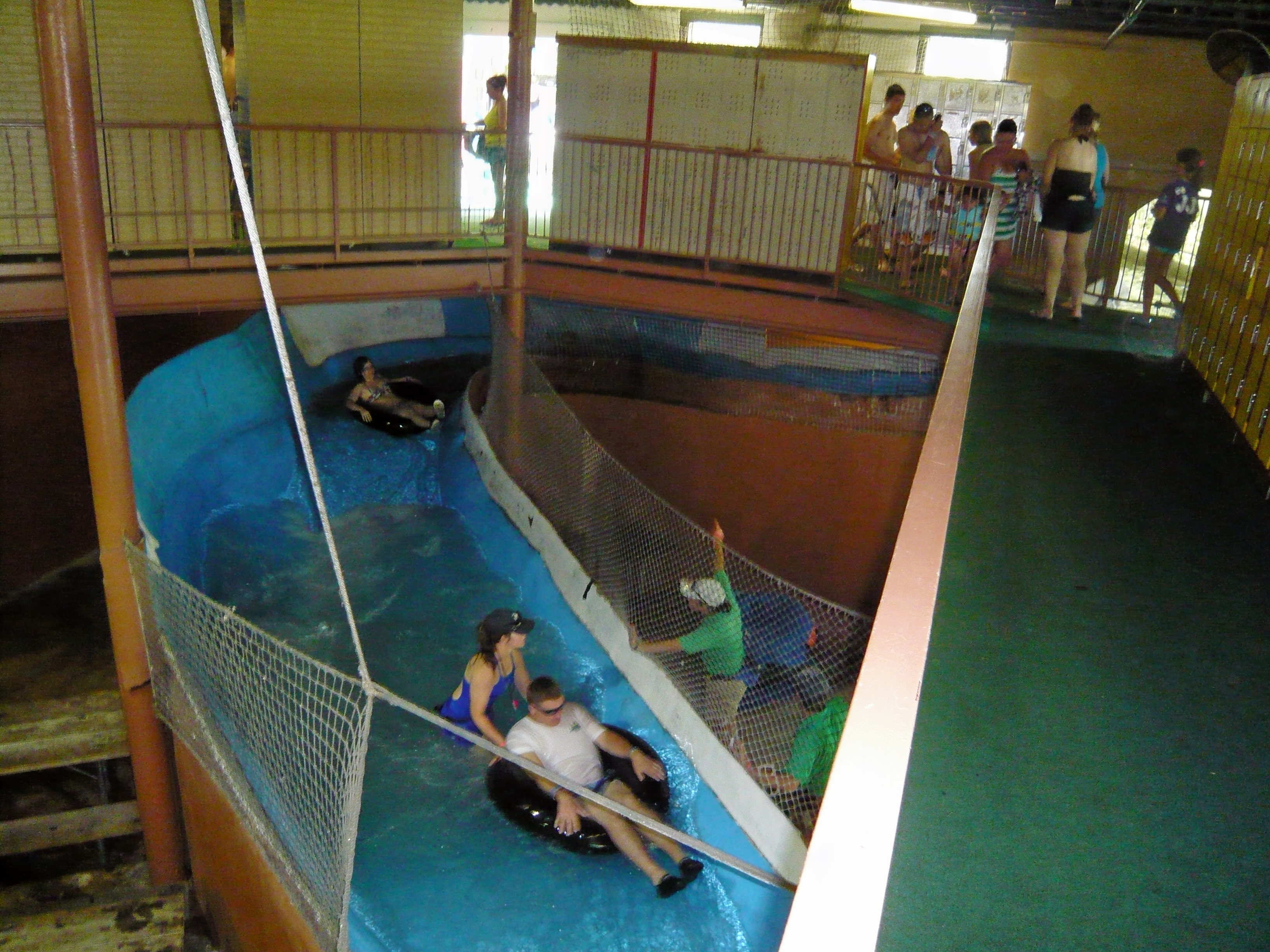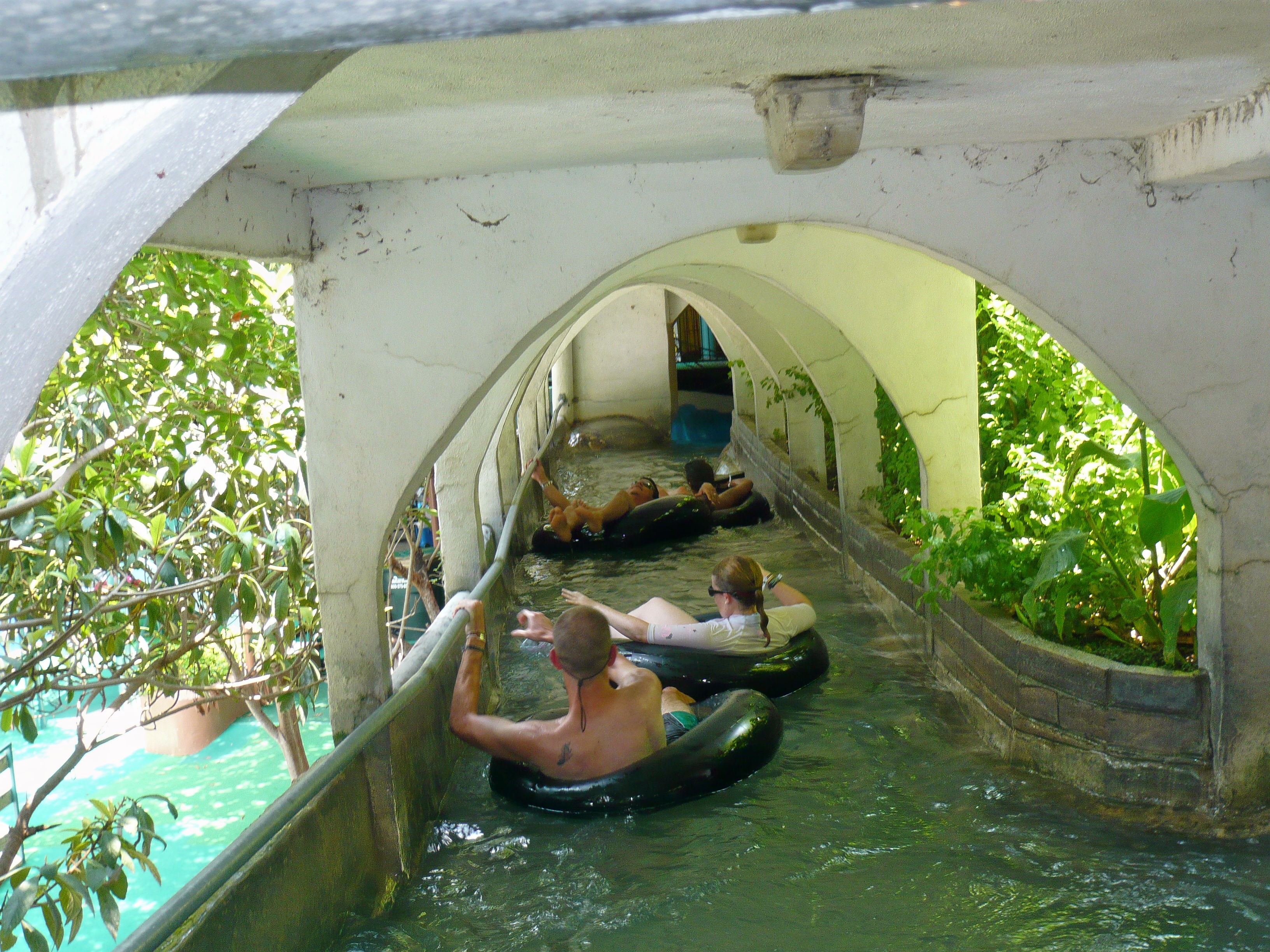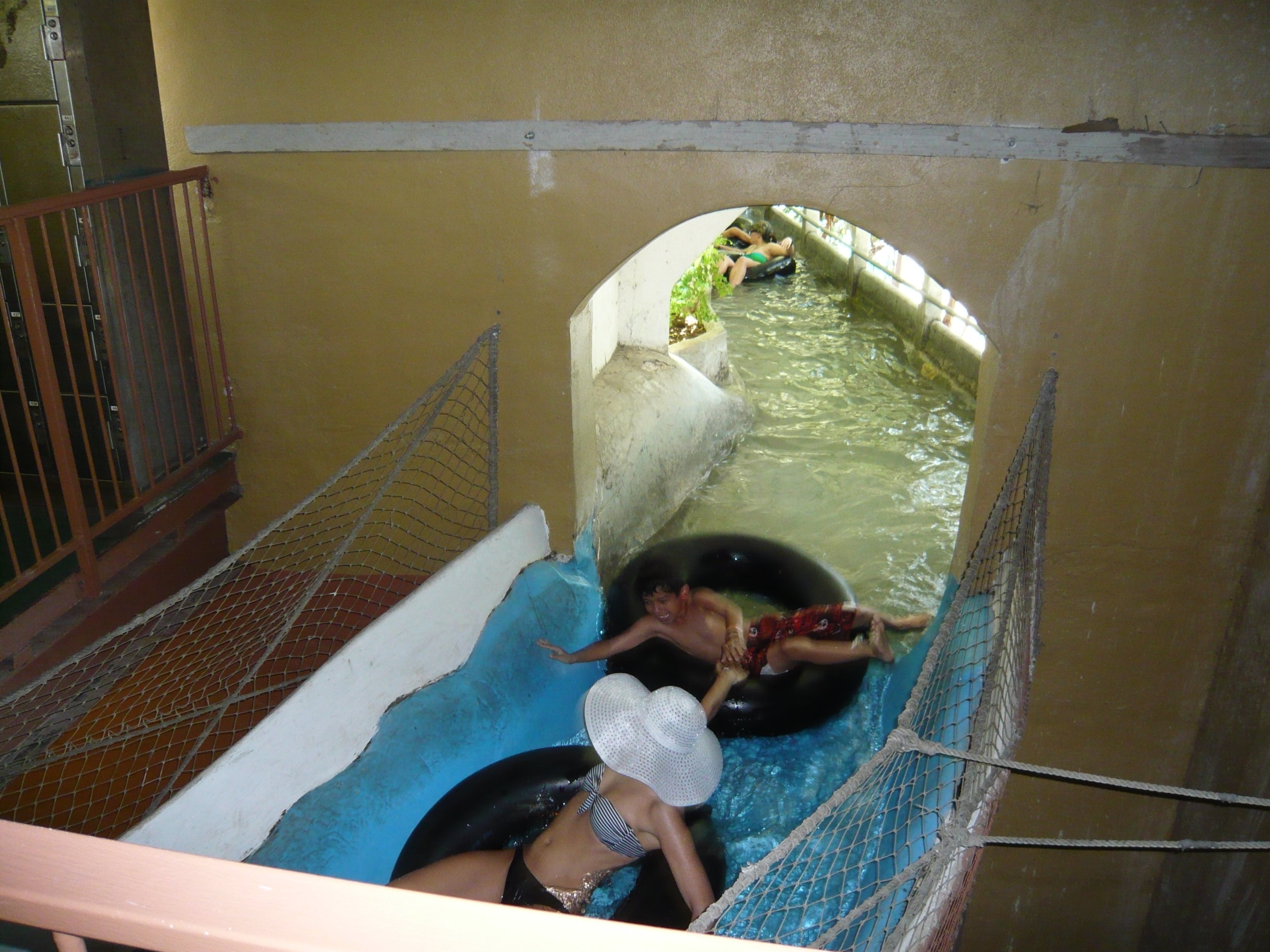 Hier widmen wir uns jetzt wieder dem Verlauf der Raging River Tube Chute: nachdem man nun also zwischen den Mattenrutschen vor sich her geplätschert ist, führt der Kanal in einem stockdunklen Tunnel direkt unter dem Eingangsgebäude durch - mit gefühlten 40 Zentimetern Abstand zur Decke. Kein Witz - seht oben bitte selbst! Nichts für Klaustrophobiker! S S Wie wir machten sich hier die meisten Besucher einen Spass draus, sich von an der Decke (!) abzustossen, um etwas Geschwindigkeit in die hier eher träge vor sich hin dümpelnde Kanalfahrt zu bringen. S