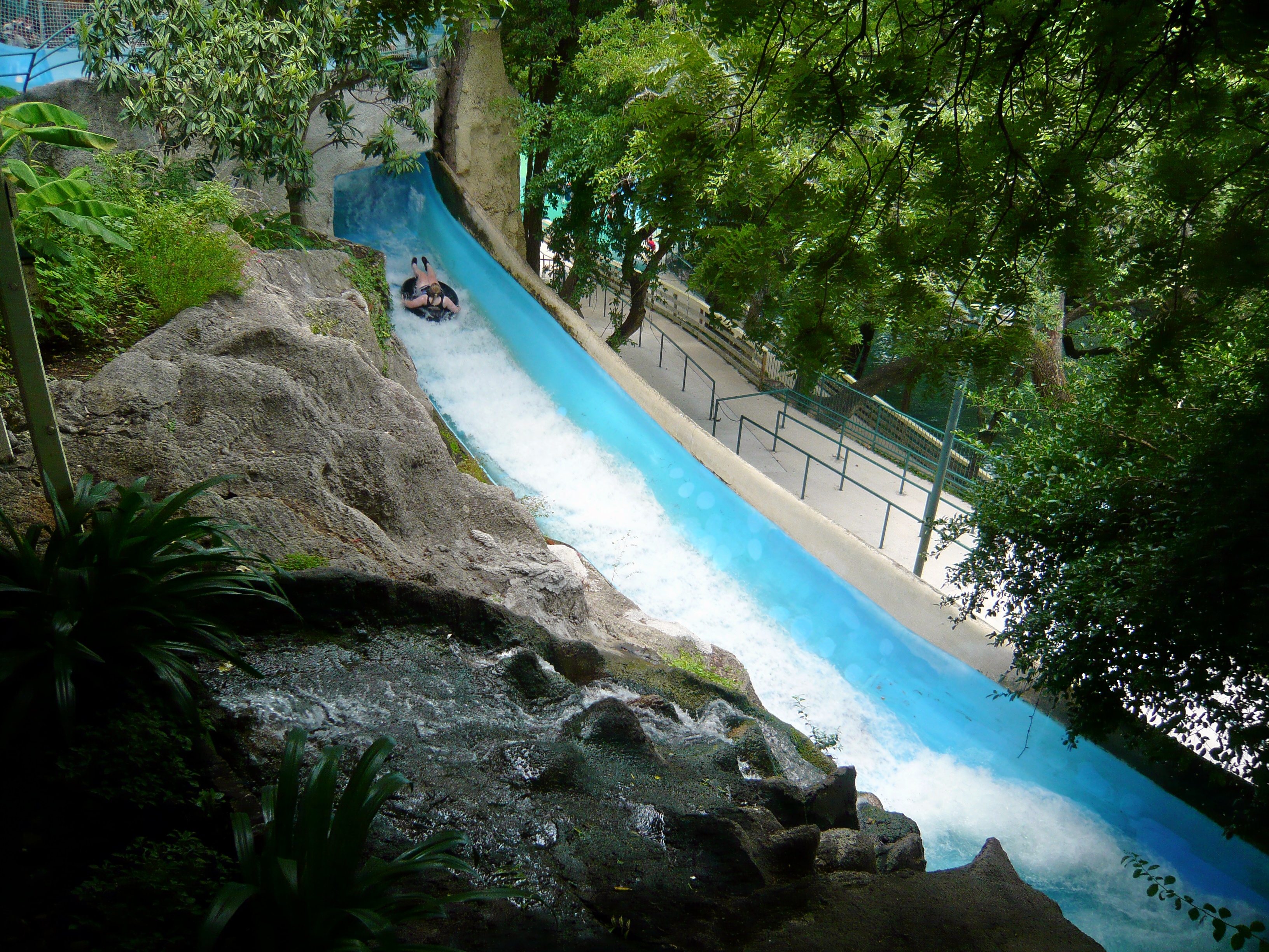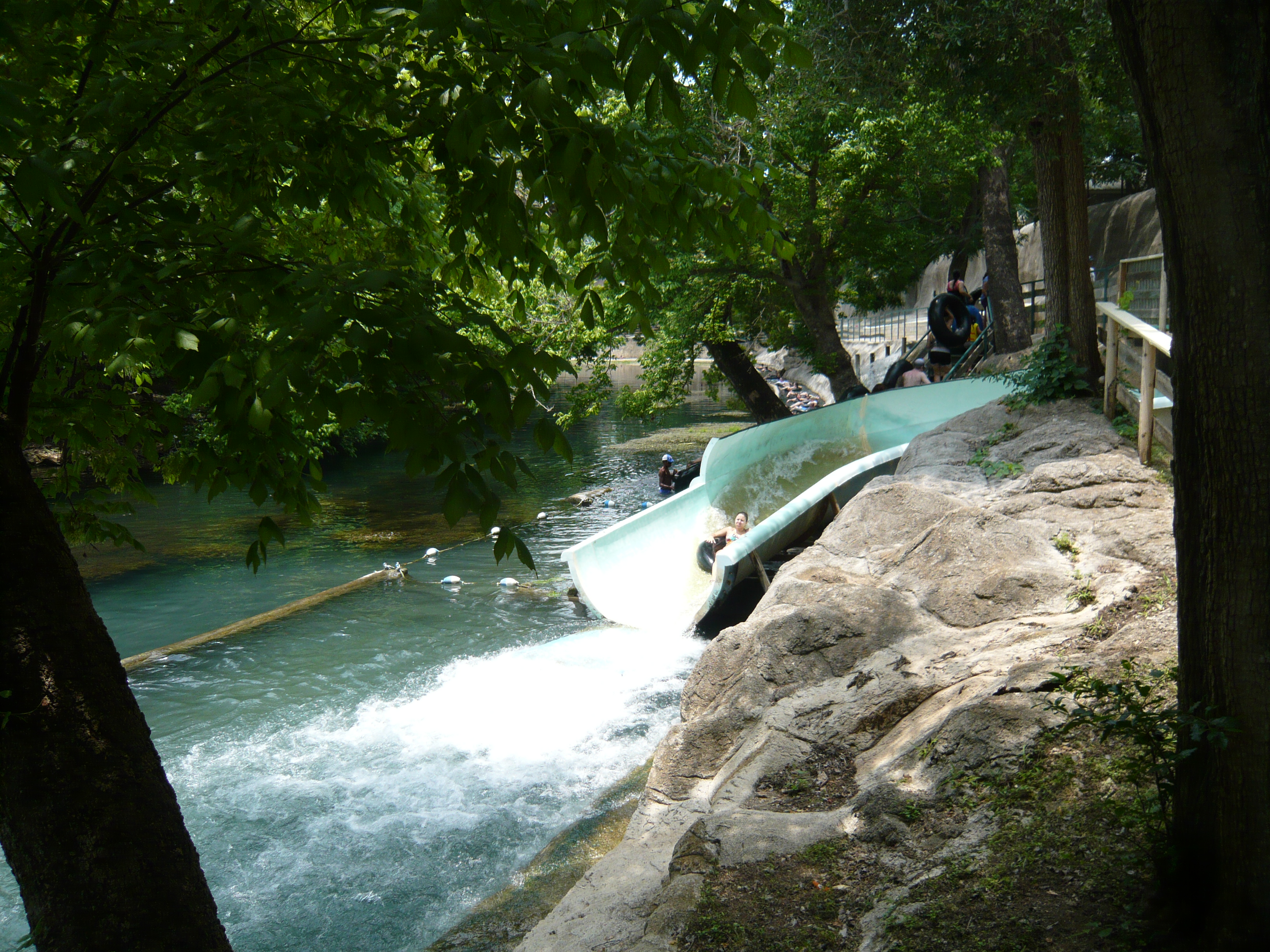 Schlitterbahn West ist ja eigentlich weniger für klassische Wasserrutschen als für sein gut 2 km langes Netz an sogenannten Tube Chutes bekannt. Was genau man sich da jetzt drunter vorstellen muss? Gute Frage. Am ehesten kommen diese Gebilde noch Rutschanlagen nahe, die bei uns gemeinhin als Crazy River bekannt sind, wo man in einem Einzelring über kurze Rutschpartien von einem Zwischenpool in den nächsten saust. Allerdings führen diese Anlagen hier zu weiten Strecken sehr viel Wasser und über nur sehr geringes Gefälle, so dass sie etappenweise eigentlich mehr wie ein schmaler Lazy River sind. Und im Gegensatz zu den europäischen Kunststoffausgaben sind sie buchstäblich in Stein gemeisselt - wie kleine Bäche sind sie in den hier natürlich vorhandenen Fels gehauen und verlaufen einfach durch den schattigen Wald und über den Abhang zum Fluss runter. Und wie erwähnt werden sie alle mit natürlichem Flusswasser bespiesen. Rutschen tut man dabei über glattgewaschene Steinflächen - sofern man es denn mal aus den Stauräumen schafft, wo oft widerspenstige Hindernisse und extrem starke Gegenströmungen aufwarten. Manchmal trifft es einen so blöd, dass man immer und immer wieder in dieselbe Strömung gerät und auch mit starkem Rudern nicht weiterkommt. Kurz ausgedrückt: ein Heidenspass! S Hier muss man öfters aktiv mitmachen, sich über Kanten schieben, sich von Beckenrändern schubsen und die Rutschposition immer wieder der Situation entsprechend anpassen - und genau das ist für einen amerikanischen Wasserpark irgendwie so untypisch! Der halbe Spass an der Sache besteht hier irgendwie darin, die mit diesen Vorgängen scheinbar völlig überforderten Amis zu beobachten, mit ihnen zusammen zu stossen, sich gegenseitig weiter zu helfen und einfach herzhaft über das Ganze zu lachen. S Wichtig für Gruppen: Es ist praktisch unmöglich, hier zusammen zu bleiben ohne riesigen Stau zu verursachen. Also einfach am nächstmöglichen Ausstiegspunkt abmachen - wobei das auch nicht immer so einfach ist. S