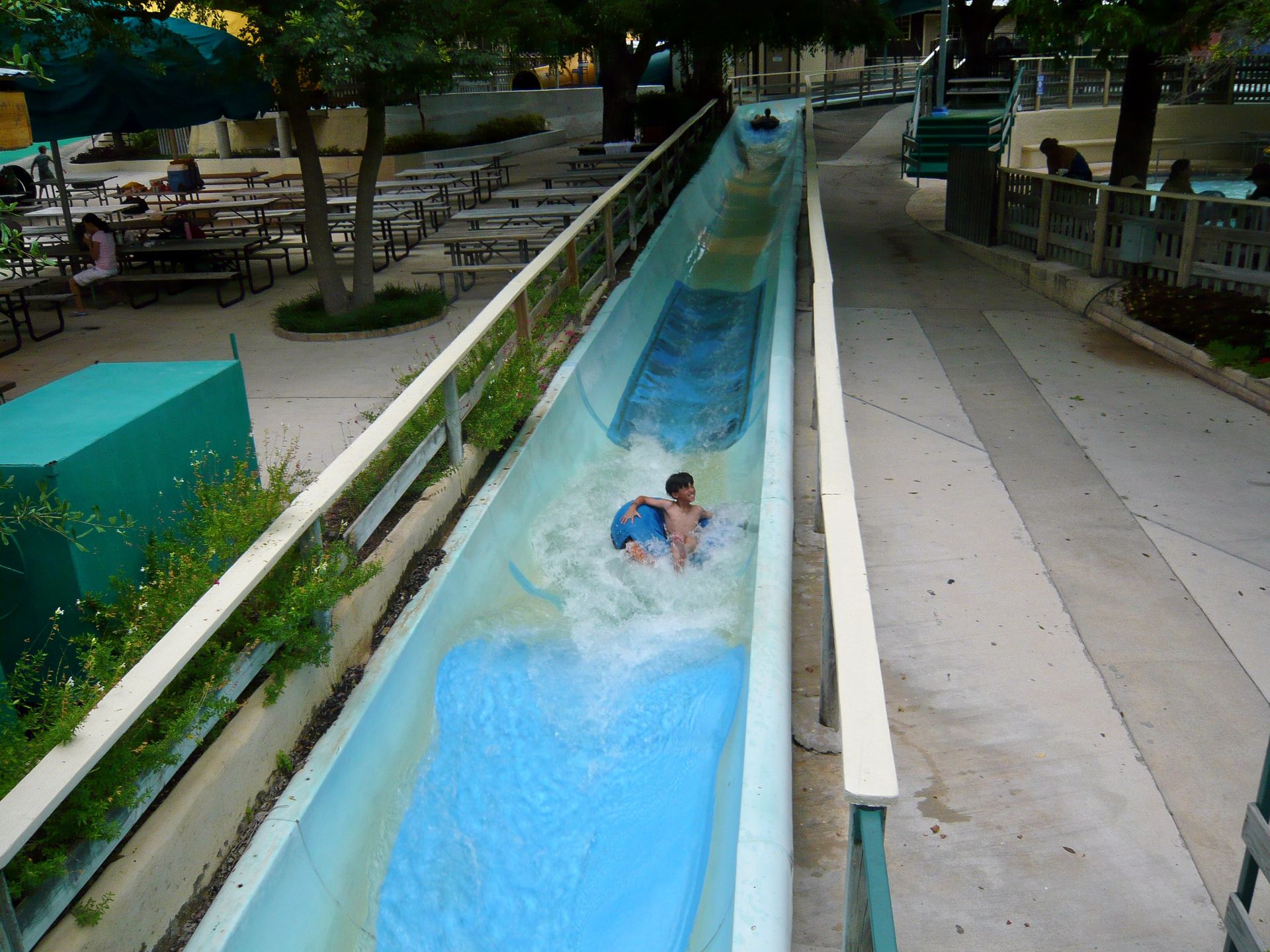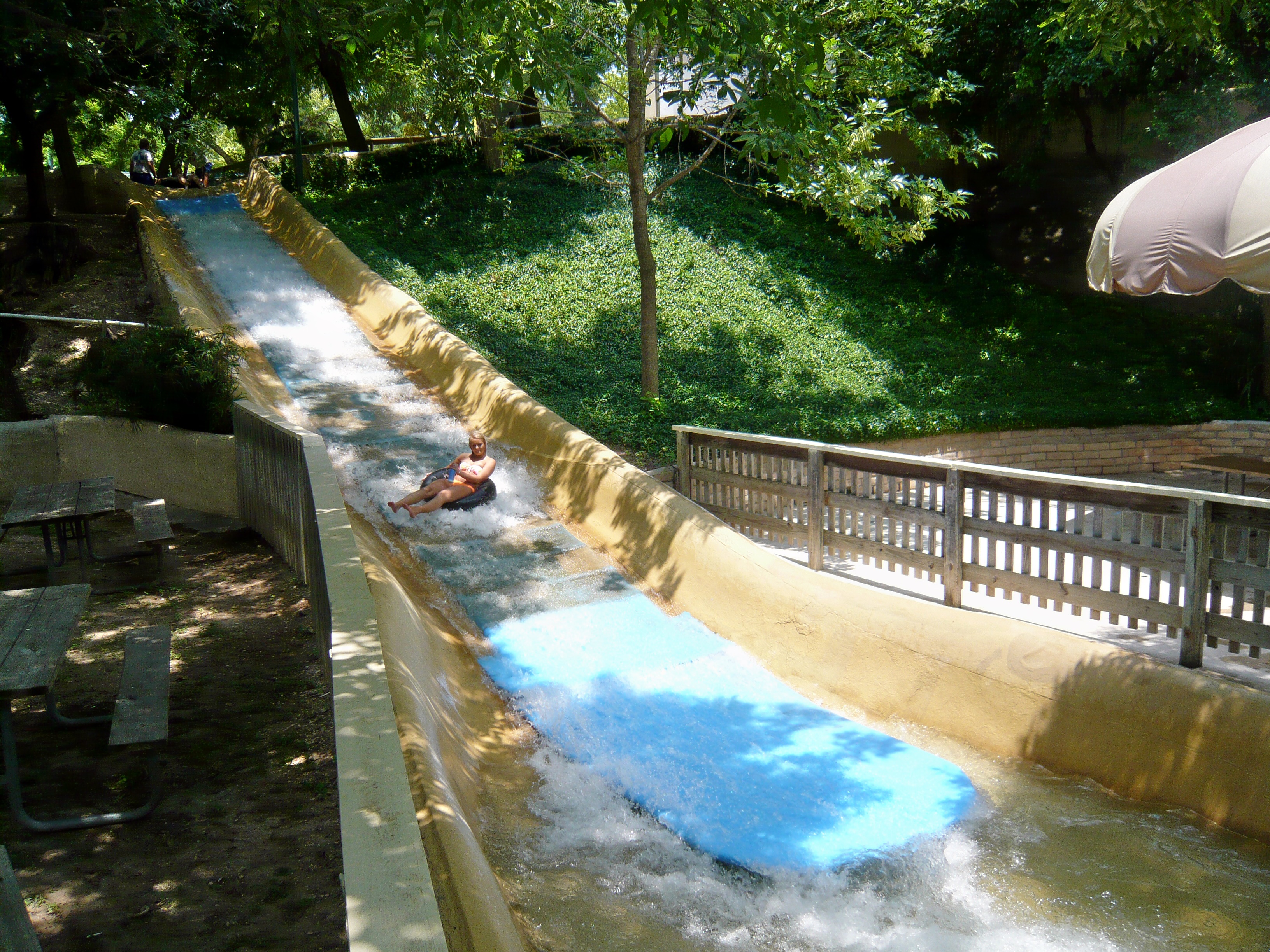 ...bevor einen dann dieses schicke Abschlusskurven-Finale in einem klassischen Rutschenkanal erwartet, das die Rutscher daraufhin direkt in den Comal River und damit in die River Tube Chute entlässt.