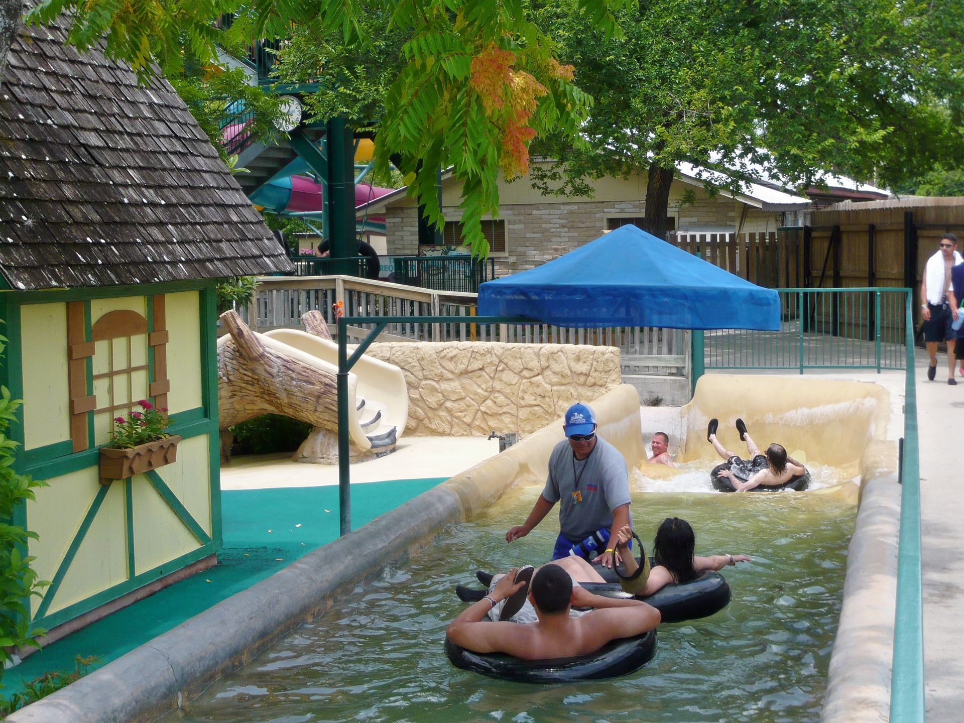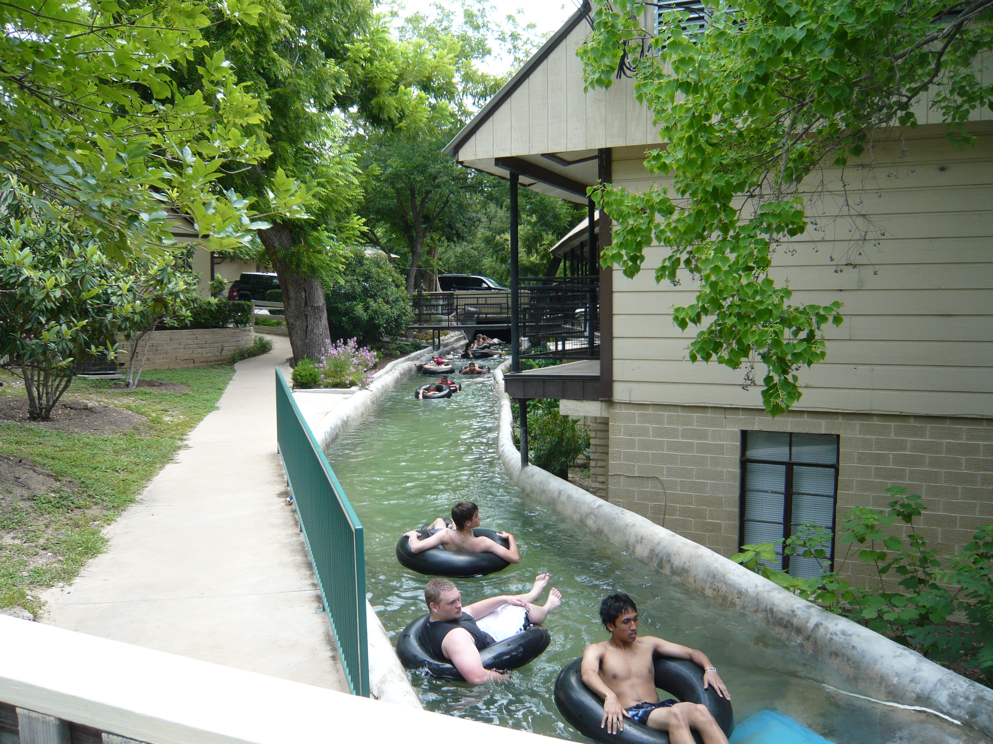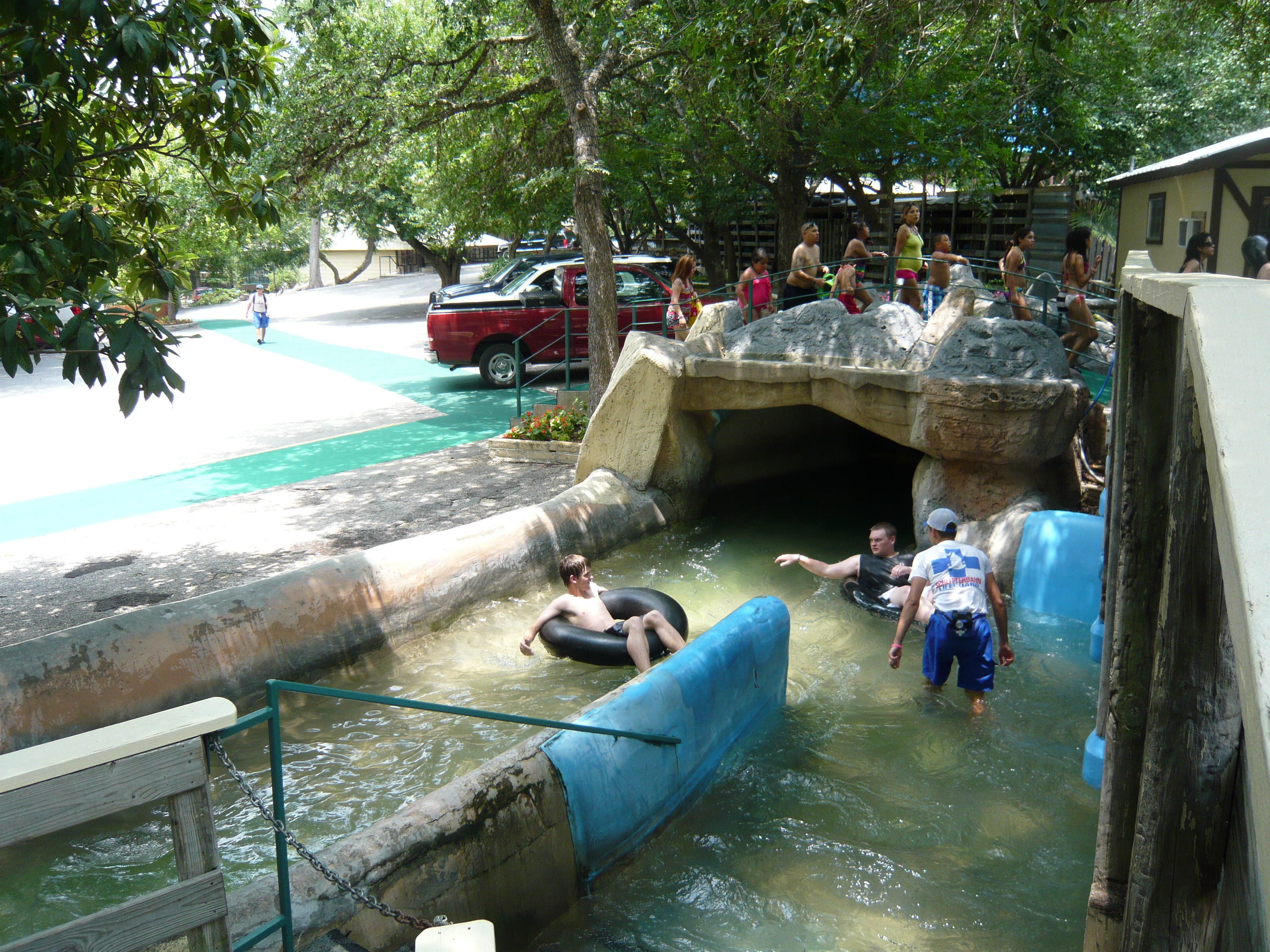 ...wo man dann schlussendlich beim Startpunkt der Tunnel Tube Chute landet. Von wo aus man dann weitere 256 Rutschmeter mitten durch die Hotelanlage und mitsamt schönem Finale direkt in den Comal River anhängen kann, und von da aus noch einmal 200 weitere bis zum Endkreisel der River Tube Chute. Oder auch nach rechts in die Congo River Expedition abzweigen - wird der aufmerksame Leser ja festgestellt haben. S Um herauszufinden, welches die längere Rutschvariante ist, müsst ihr noch brav weiterlesen. S