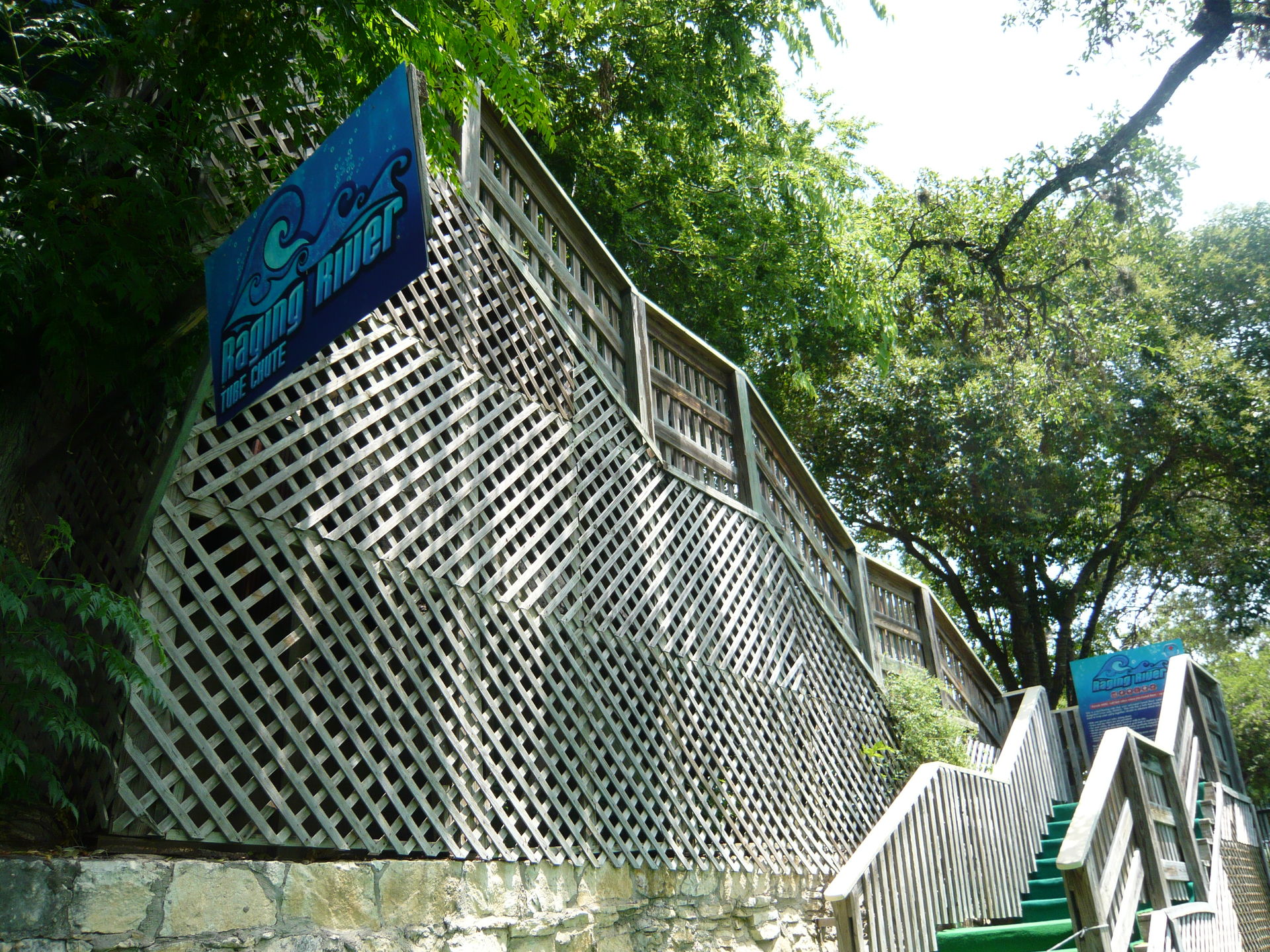 Den Ausgangspunkt zur 431 Meter langen Raging River Tube Chute zu finden ist ohne Wissen um seine Existenz kein leichtes Unterfangen! S Sie startet auf der Rückseite des Schlosses von wo aus auch die Hillside Tube Chute startet. Was aber nicht heisst, dass die beiden Wartebereiche auch nebeneinander beginnen würden - vielmehr muss man nämlich auf die komplett andere Seite des grossen Lagunenbeckens, zum allersüdlichsten Zipfel des Parks, laufen und hinter den Soda Straw Body Slides den oben abgebildeten Aufgang finden. Man muss wohl nicht extra erwähnen, dass wir hier trotz sonntäglichem Hochbetrieb durchaus einfach mal gar keine Schlange vorgefunden haben. S