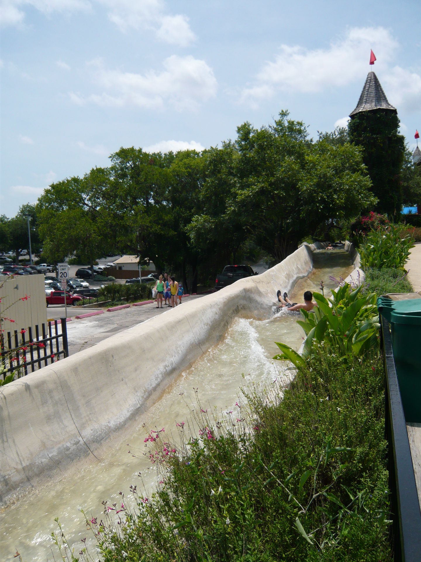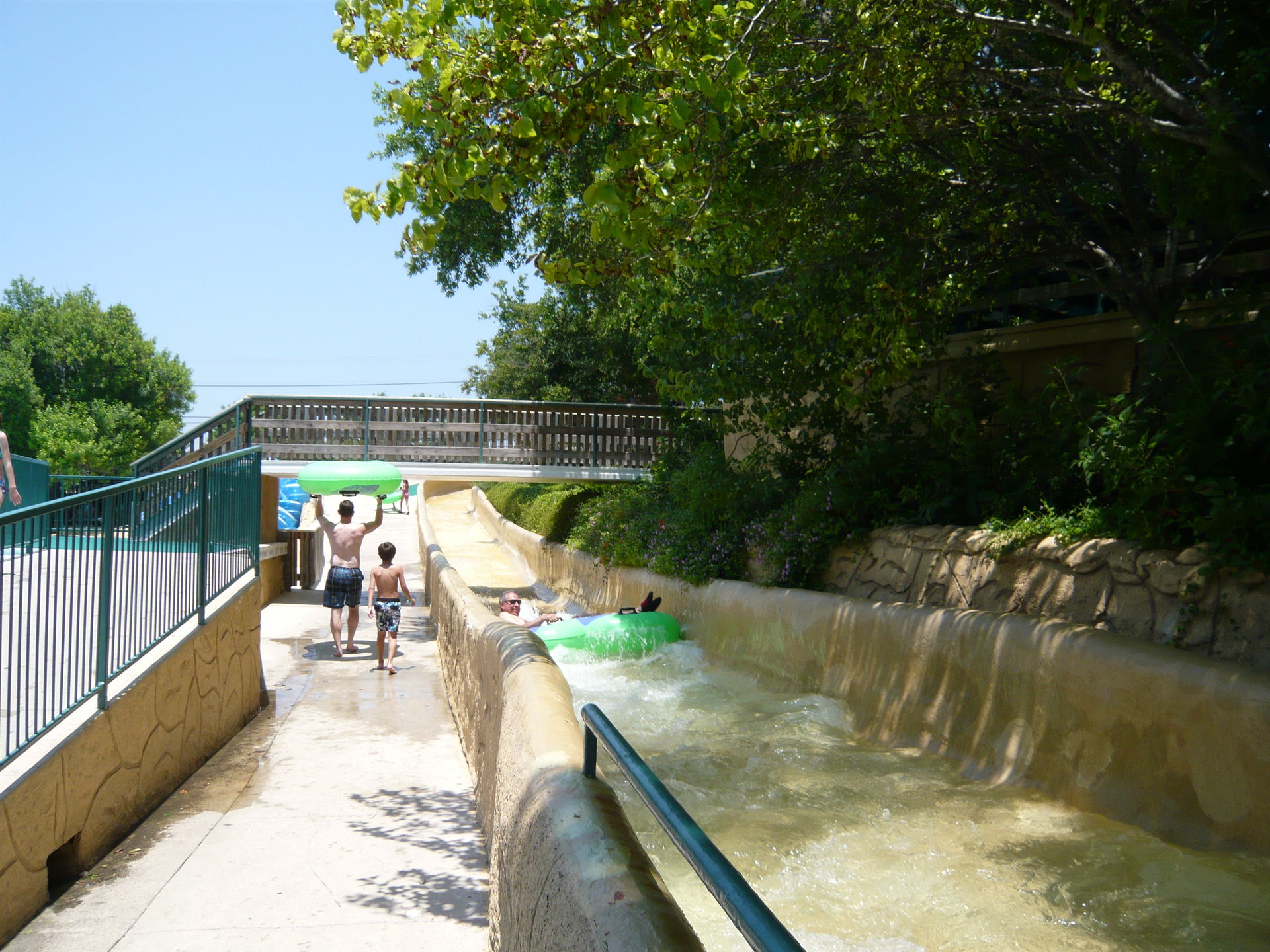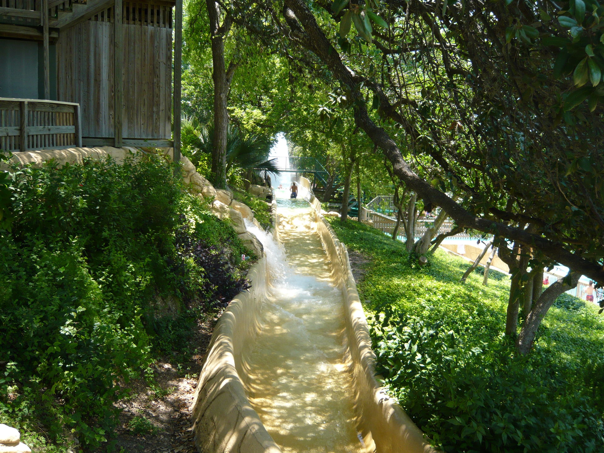 So wahnsinnig express ist der Comal Express gar nicht - abgesehen von einigen Schussfährtchen im Parallelteil zur Tunnel Tube Chute und der Abfahrt nach dem abgelegenen Kehrbecken bietet diese Strecke nur wenig aufregende Elemente. Besonders blöd fand ich die widerspenstig platzierten Steine im oberen Abzweigeabschnitt beim Ende der Tunnel Tube Chute - die sind immer total hinderlich direkt in die Hauptströmung platziert und verzögern das eh schon langsame Weiterkommen. Der letzte Abschnitt entlang des Comal Rivers ist zwar friedlich, aber auch eher doof, da wir hier bei zweimaligem Durchrutschen immer eine grössere Gruppe vor uns hatten, die für kompletten Stillstand gesorgt hat und im engen Kanal nicht überholt werden konnte. Allerdings ist der Comal Express natürlich ein wichtiger Bestandteil der längstmöglichen Rutschpartie im Park. S