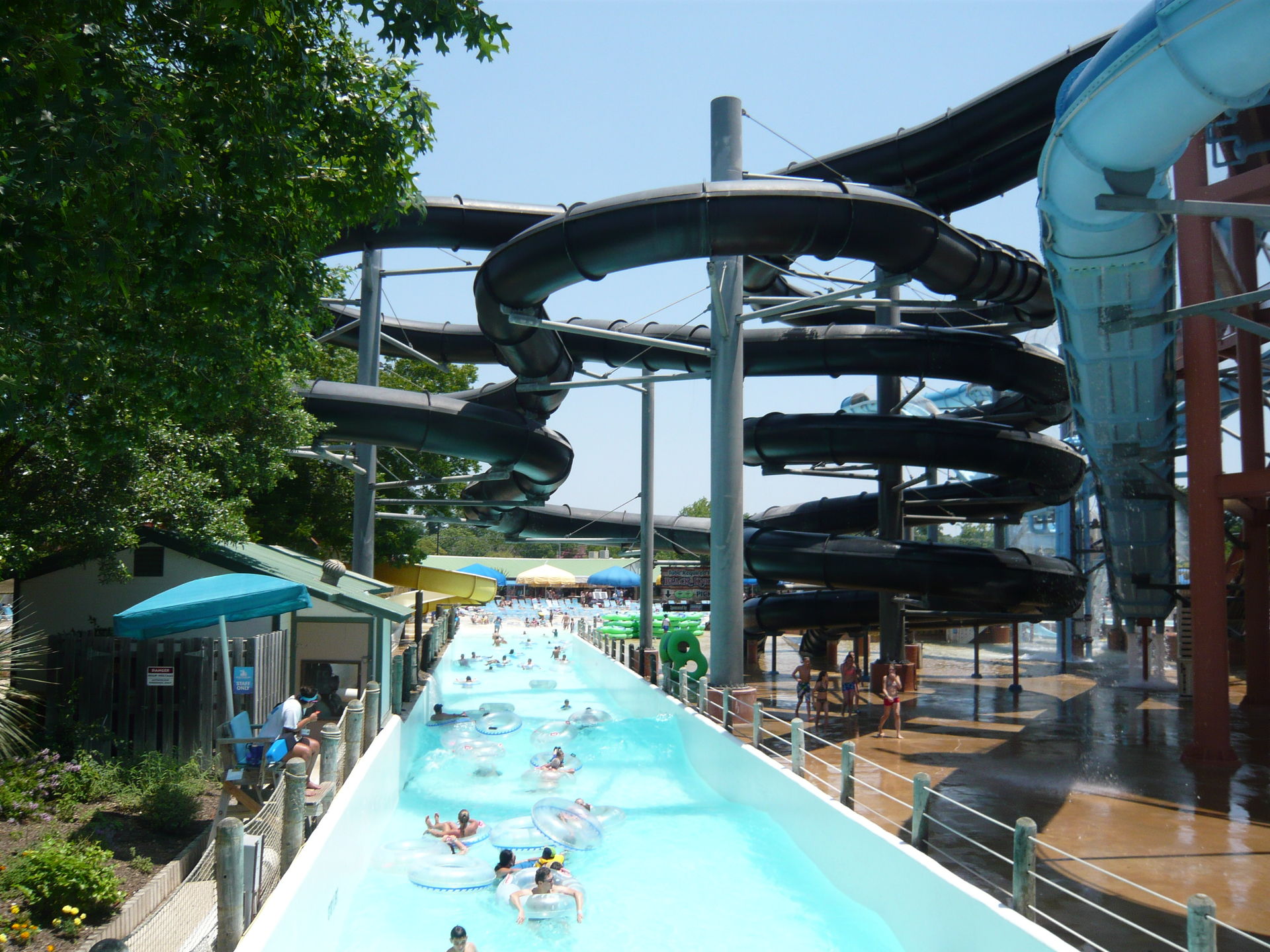 Man kann nun also feststellen: die längste Wegvariante im Schlitterbahnschen Tube Chute-System ist: Raging River Tube Chute - Abzweigen in die Congo River Expedition - durch den Minentunnel zum Comal Express - und nach dessen Ende noch durch die River Tube Chute. S Da umrundet man das gesamte Parkgelände etwa zu drei Vierteln, und man ist insgesamt gefühlte 1,5 km und etwa 35 Minuten unterwegs. Klar, dass Schlitterbahn diese Werte für die Werbung jeweils etwas aufrundet - aber es ist dennoch ein superstarkes Stück. Einfach klasse! S Allerdings braucht man dazu auch die nötige Disziplin, am Beginn der Tunnel Tube Chute den Bademeister zu bitten, einen nach rechts in die Congo River Expedition weiterzuschubsen - für ihn ist es natürlich einfacher, wenn man von der Hauptströmung getragen einfach geradeaus in die Tunnel Tube Chute weiterrutscht. Und im Verlaufe des Nachmittags wurde der Comal Express-Durchgang neben dem Ende von Tunnel Tube Chute jeweils ganz abgesperrt, so dass man dort immer kurz aus dem Wasser musste, um per Landweg in die River Tube Chute zuzusteigen.