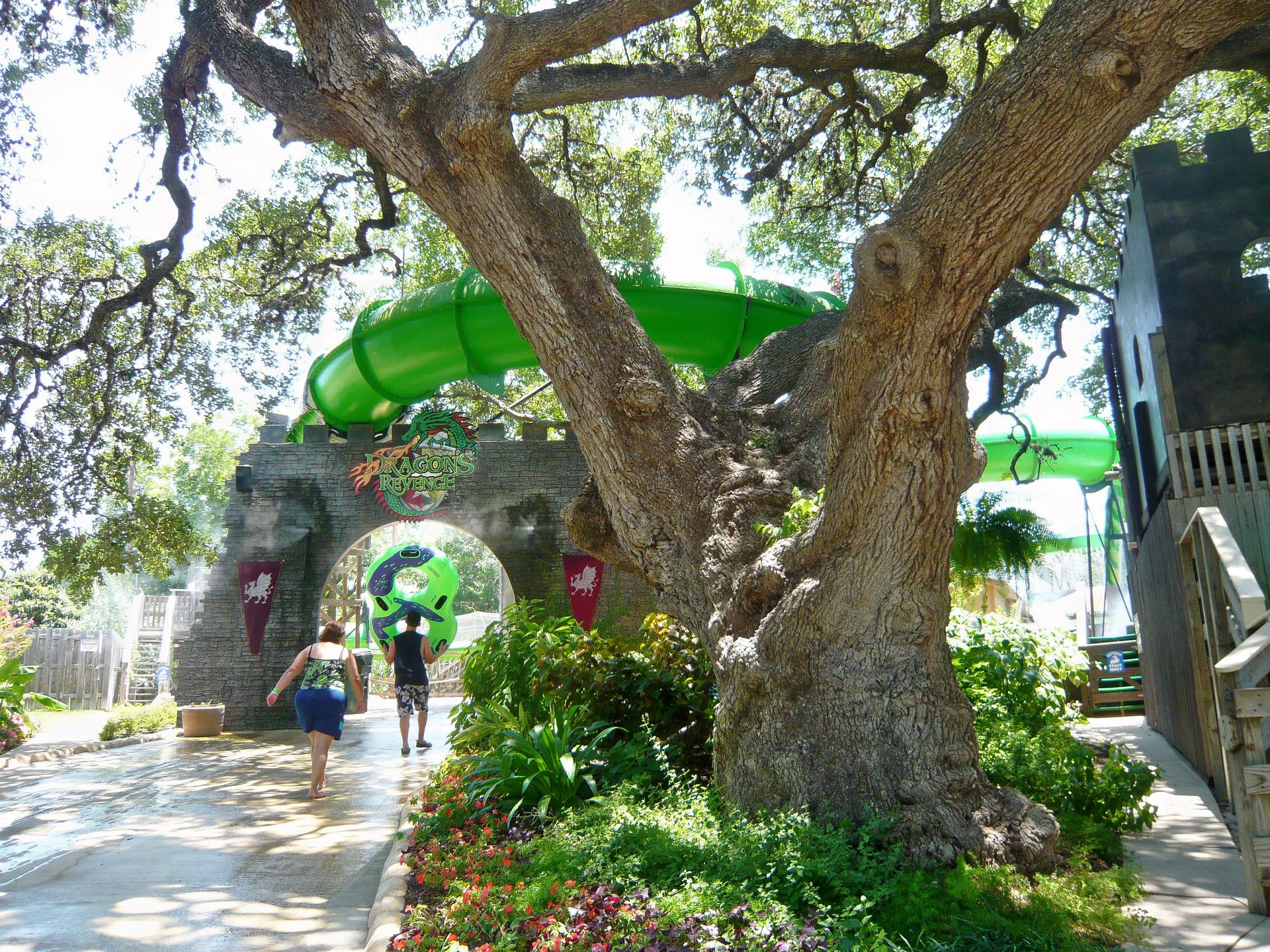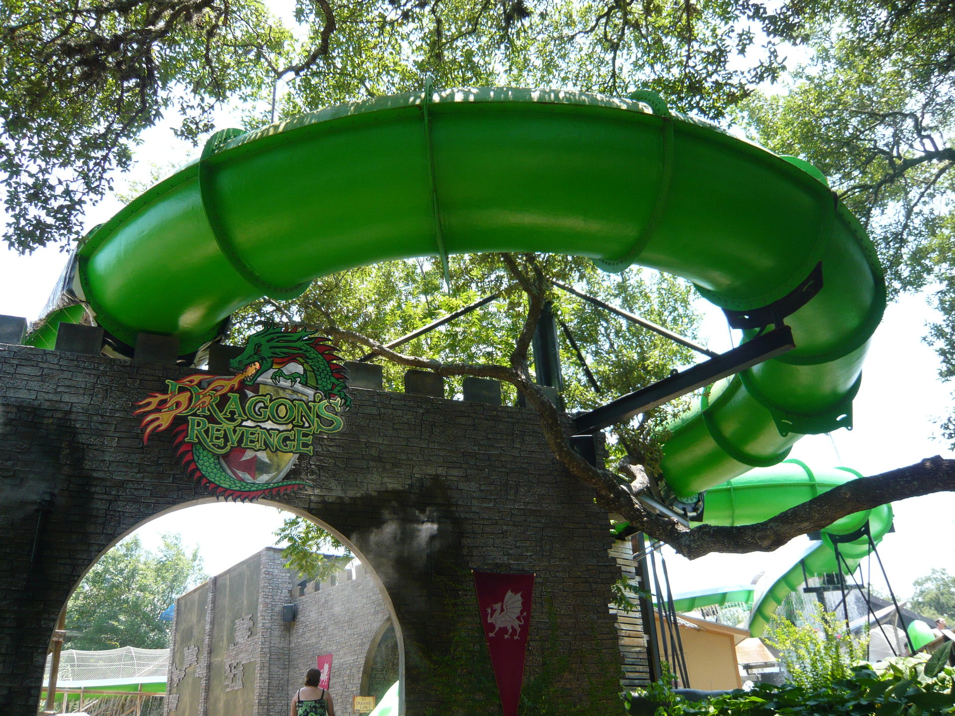 Hier begreift man dann bald einmal, weshalb es in Schlitterbahn bloss Armbändchen und keinerlei Eintrittskarten oder gar Zäune gibt: Die Rutsche führt hier wirklich voll durch die Hotelanlage durch. Und diese liegt natürlich an einer öffentlichen Strasse ohne irgendwelche Abzäunungen und Schranken. Wer hier Ferien macht nächtigt tatsächlich direkt im Wasserpark! Das muss man echt mal mit eigenen Augen gesehen haben. S