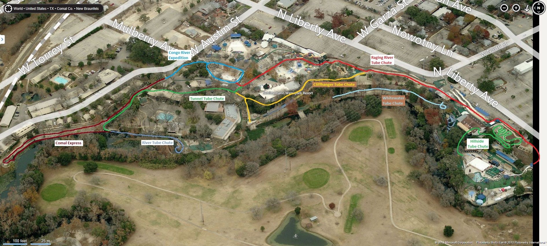 Google Maps wird einen auch auf grösseren Screens nicht dienlich sein, die Rutschenverläufe zu verfolgen. Die Darstellung auf Bing Maps wurde wohl im Winter/Herbst ohne Laub auf den Bäumen aufgenommen und hat uns besser geholfen. Man muss aber natürlich auch wissen, wo die Tube Chutes in etwa durchführen. S