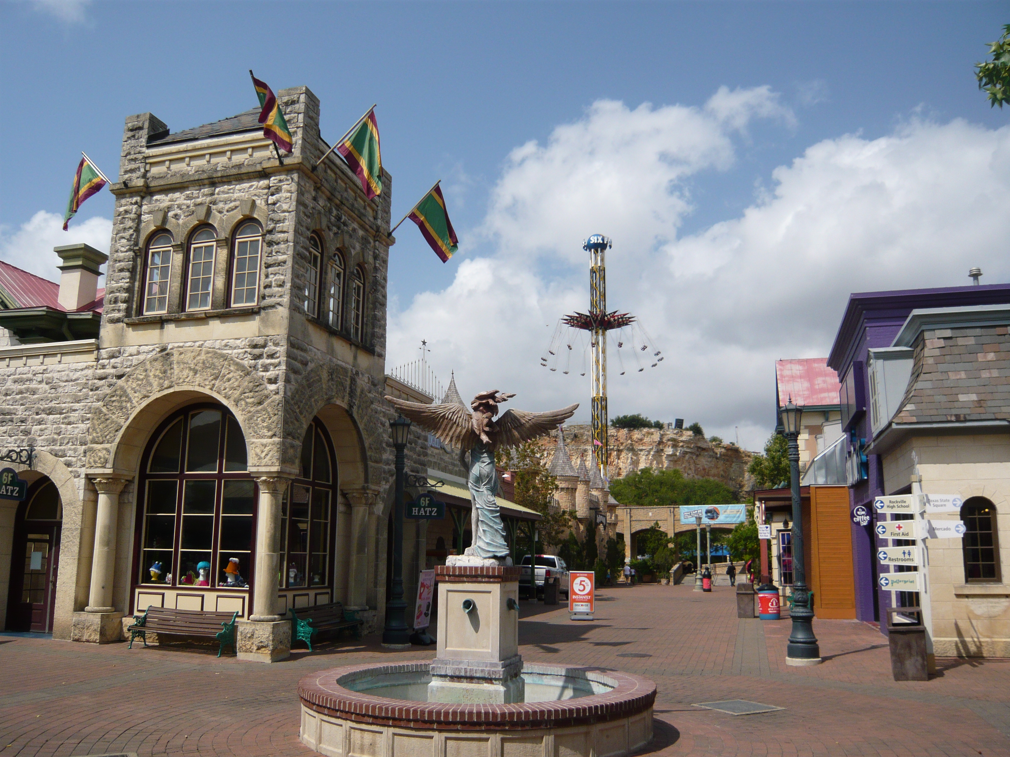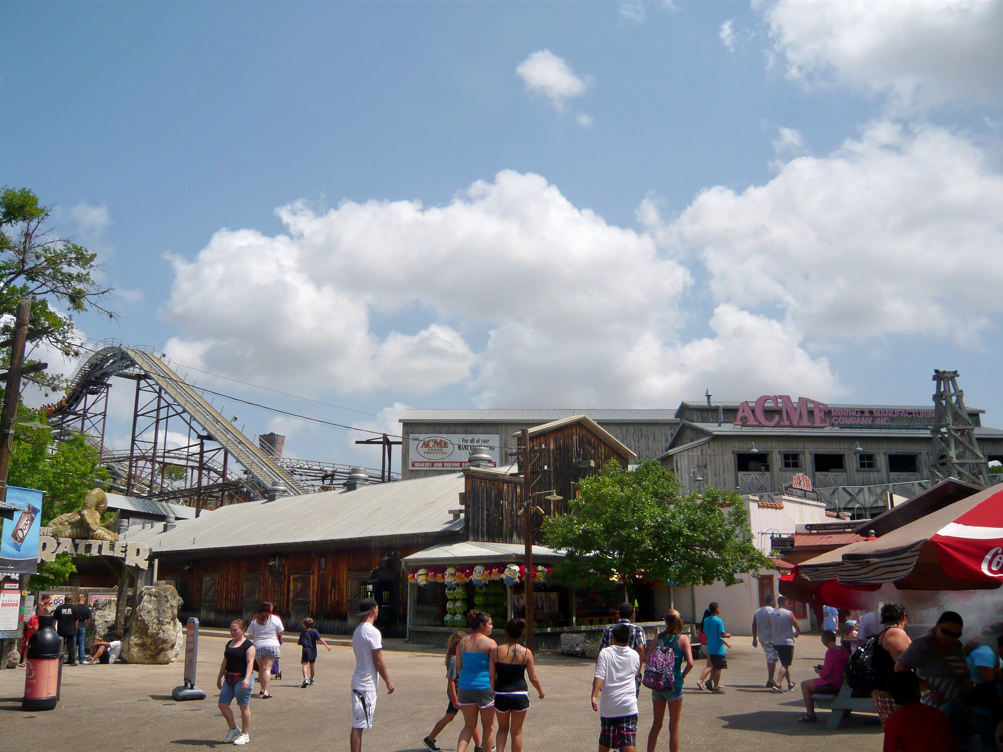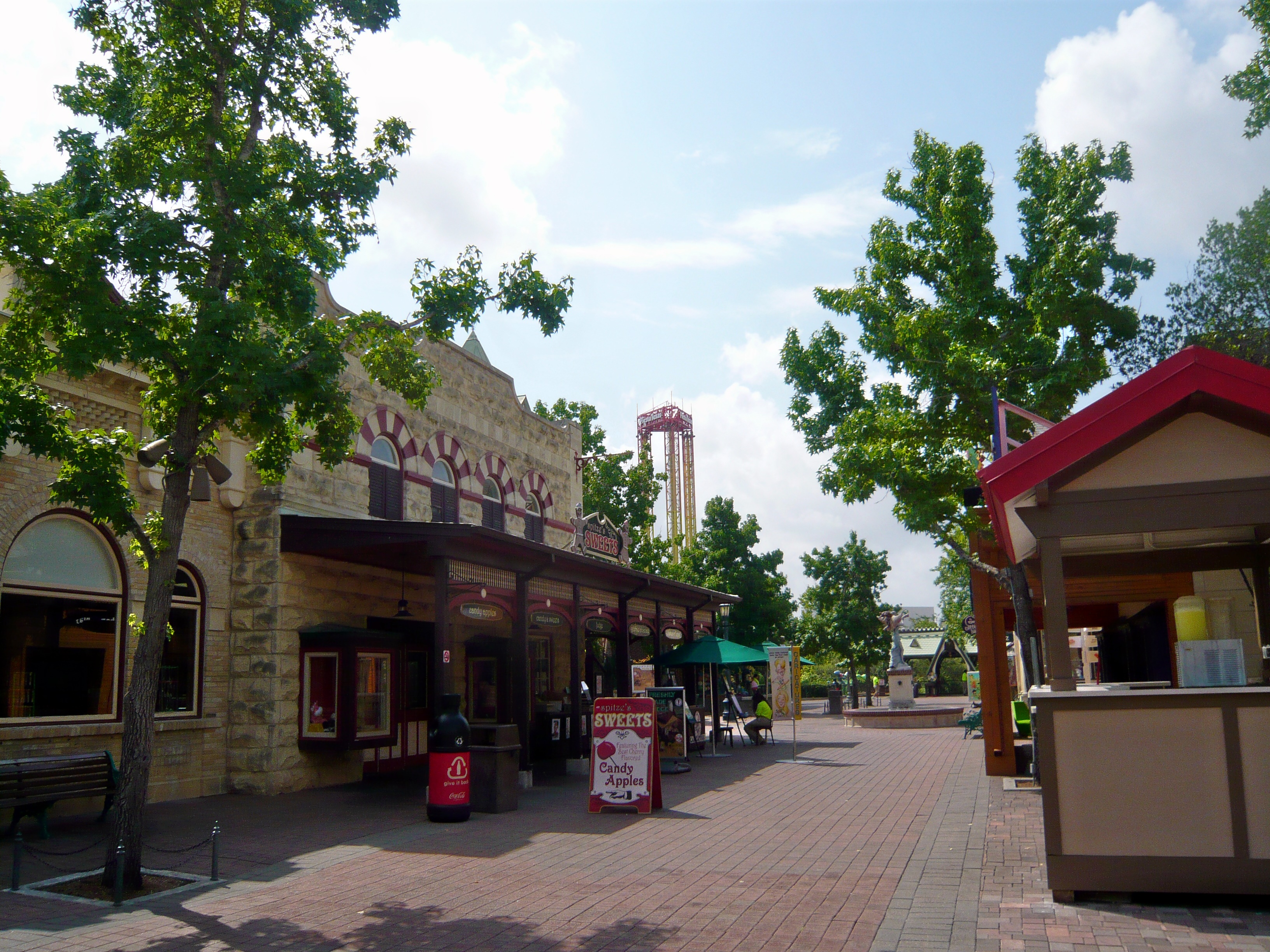 Da das nahe liegende Pandemonium noch zu war, schlugen wir nun den Weg zur Felswand am Südrand des Parks auf, wo wir mit Rattler und Superman zu fahren gedenkten. Dabei erkundeten wir die für Six Flags-Verhältnisse erstaunlich schön gemachten Themenbereiche Spassburg und Rockville.