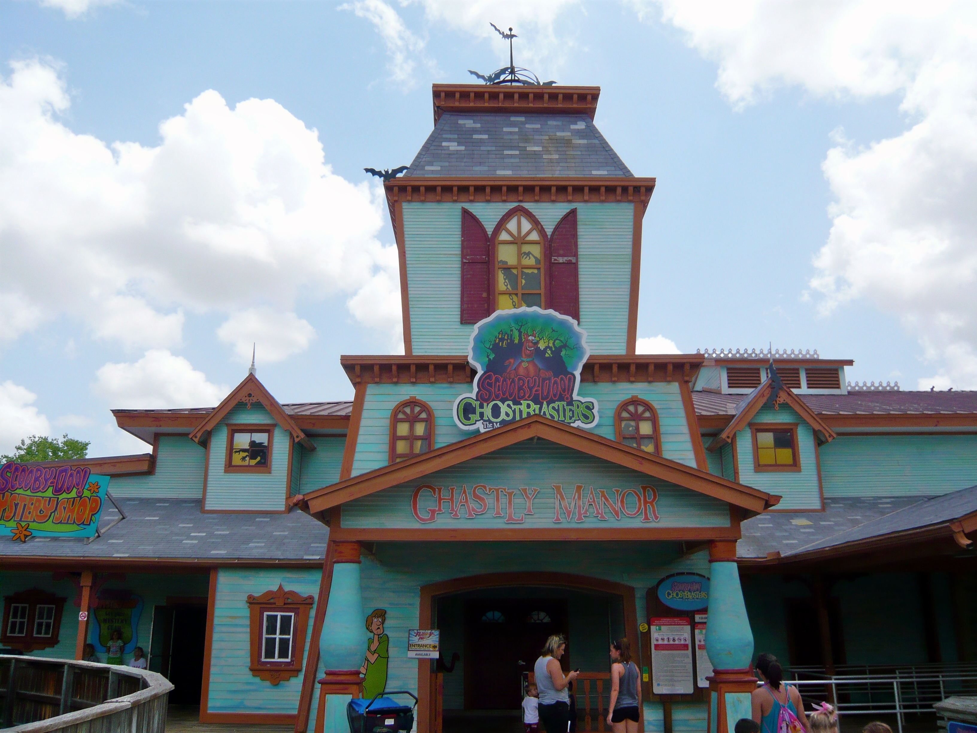 Auch eine Runde mit dem sich hier befindlichen Darkride Scooby-Doo Ghostblasters: the Mystery of the Ghastly Manor haben wir unternommen. Trotz überschaubarer Menschenmenge haben wir hier wegen eines längeren Breakdowns eine gute halbe Stunde zwischen quengelnden Kindermassen gewartet. Immerhin aber in einer klimatisierten Vorhalle und die Angestellten haben während des Breakdowns sogar einen weiteren Abschnitt im Zickzack-Warteparcours geöffnet, so dass alle im Schatten warten konnten. Die Fahrt selbst findet dann in Viererwaggons statt und man muss mit Laserkanonen ohne Lichtsignale auf blaue Zielpunkte schiessen. Trotzdem man dadurch schwer einschätzen kann wohin man zielt, ist der Toleranzbereich um die blauen Zielpunkte offenbar etwas grosszügiger bemessen als auf anderen Darkrides. Bei erfolgreichem Treffer werden mancherorts lustige Sonderaktionen ausgelöst - gut im Gedächtnis geblieben ist das Portrait der Hausherren, das man durch Draufzielen in eine Art Röntgenaufnahme mit sichtbaren Skeletten verwandeln kann.