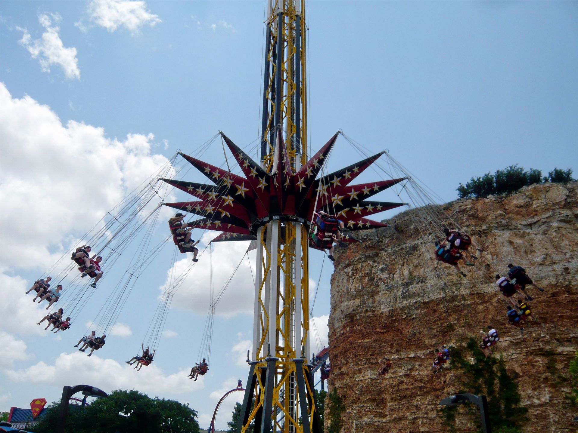Nach unserer Fahrt mit Rattler gönnten wir uns zwei Runden Road Runner Express ohne Wartezeit zum Ausgleich, danach fuhren wir trotz 35 Minuten Wartezeit und elendig langwieriger Beladungsweise noch mit dem Riesen-Kettenflieger Sky Screamer, der im Vergleich zu St. Louis mit spektakulärerer Rundsicht und Near-Misses mit der Felswand punktete.